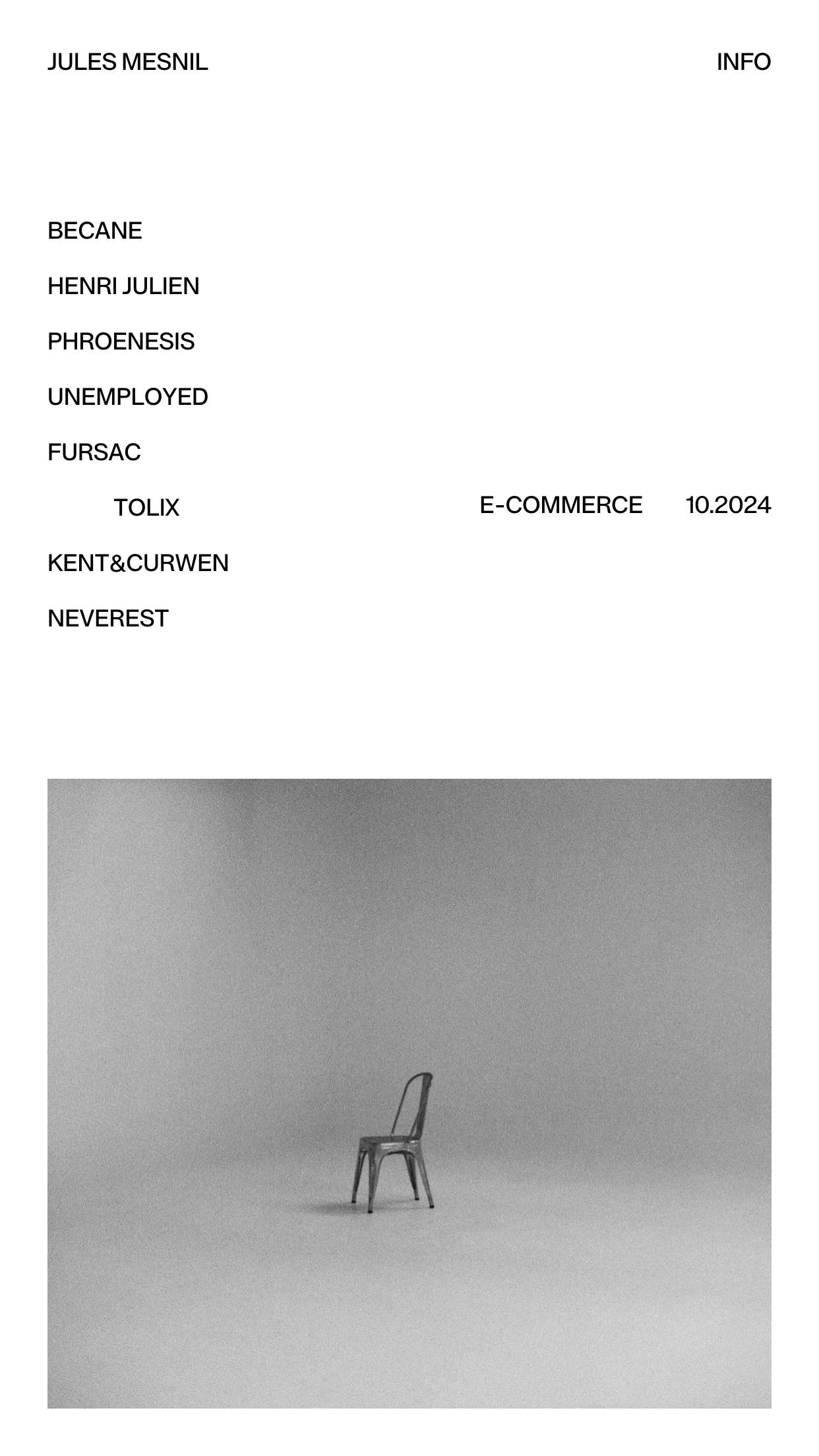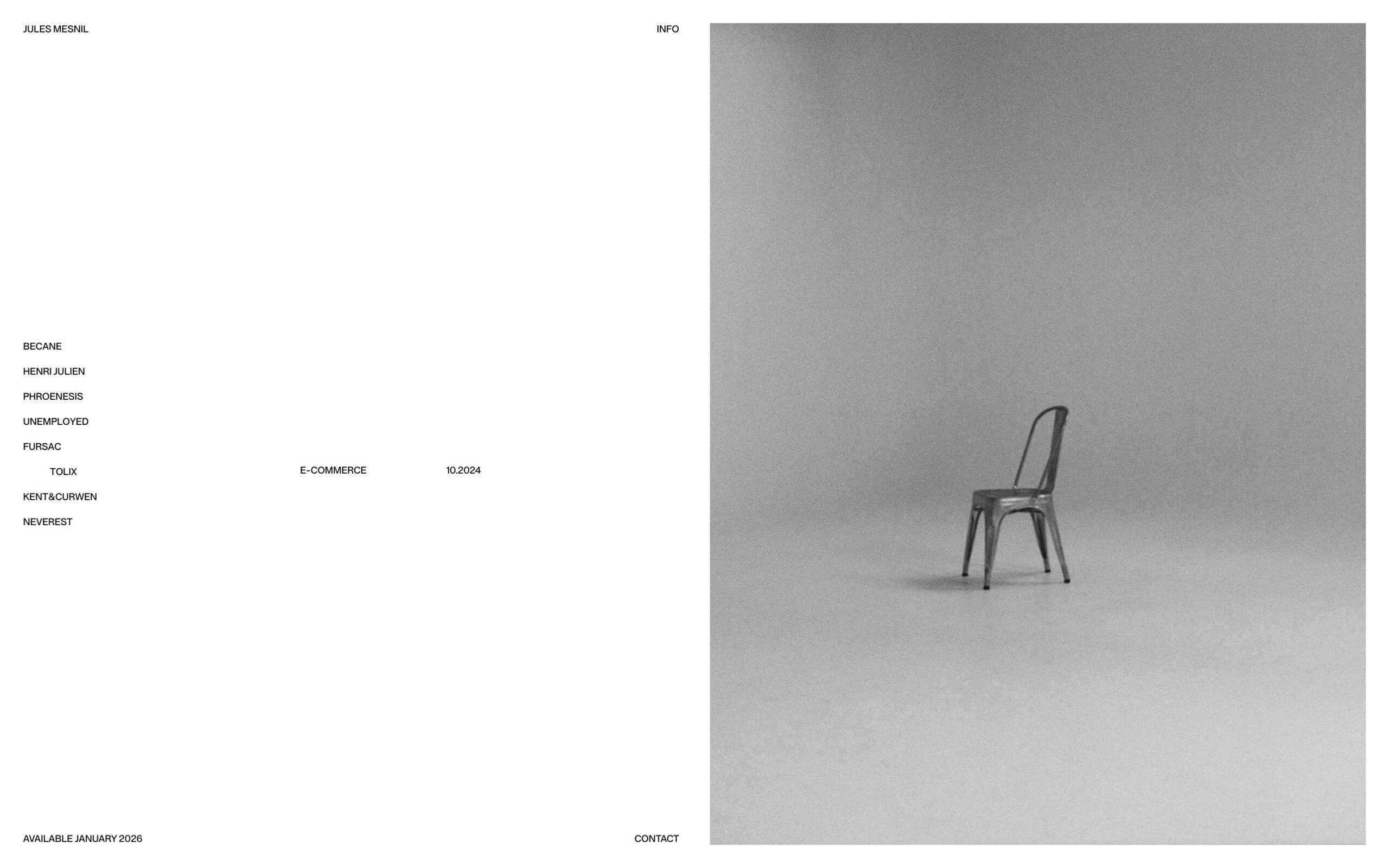 1319 julesmesnil.fr Design, Animations, Bright, Brutalist, Clean, Grid, Large Scale, Light, List, Minimal, Sans Serif Typeface, Scroll Events, Simple, Small Typography, Uppercase, White Space, Gray, White, France. Design: Jules Mesnil. Development: Jules Mesnil. (29-11-25) Permalink, ←Esc