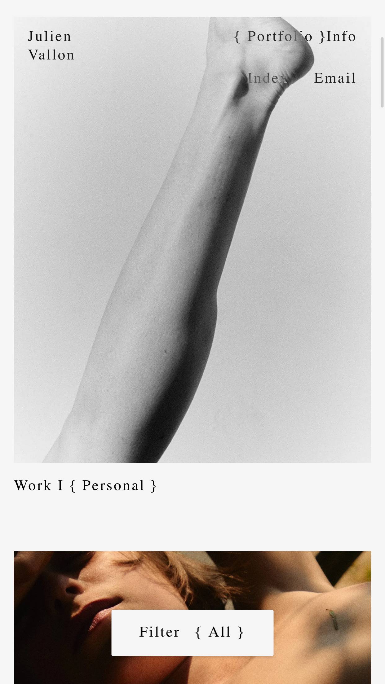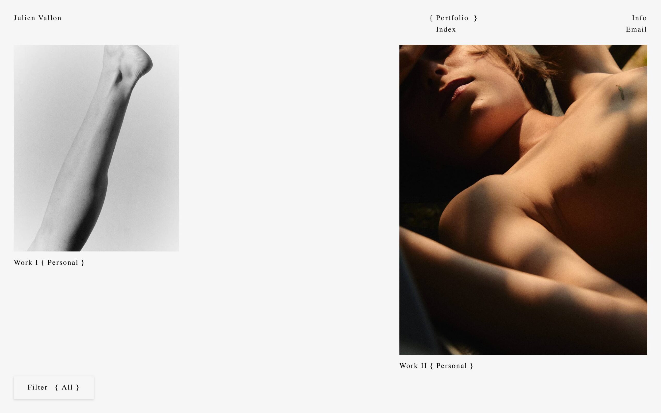 1315 julienvallon.com Visual Artist, Asymmetrical Grid, Bright, Clean, Grid, Large Scale, Light, List, Serif Typeface, Simple, Video, White Space, Silver, White, France. Design: Lovelace Studio. Development: Lovelace Studio. (25-11-25) Permalink, ←Esc