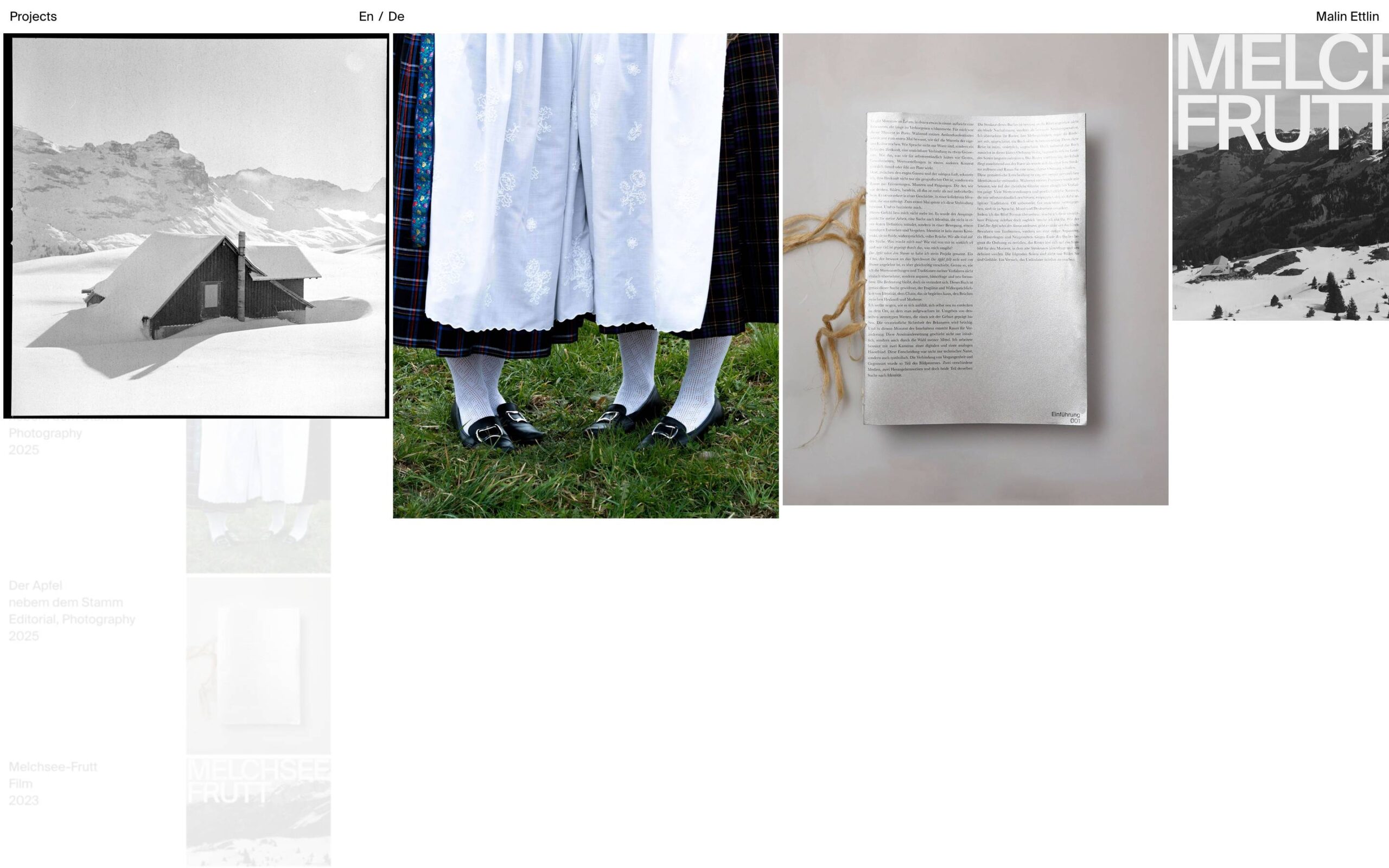 1321 malin-ettlin.ch Design, Asymmetrical Grid, Bright, Brutalist, Clean, Grid, Large Scale, Layered, Light, Minimal, Sans Serif Typeface, Simple, Small Typography, White Space, Silver, White, Switzerland. Design: Malin Ettlin. Development: Malin Ettlin. (01-12-25) Permalink, ←Esc