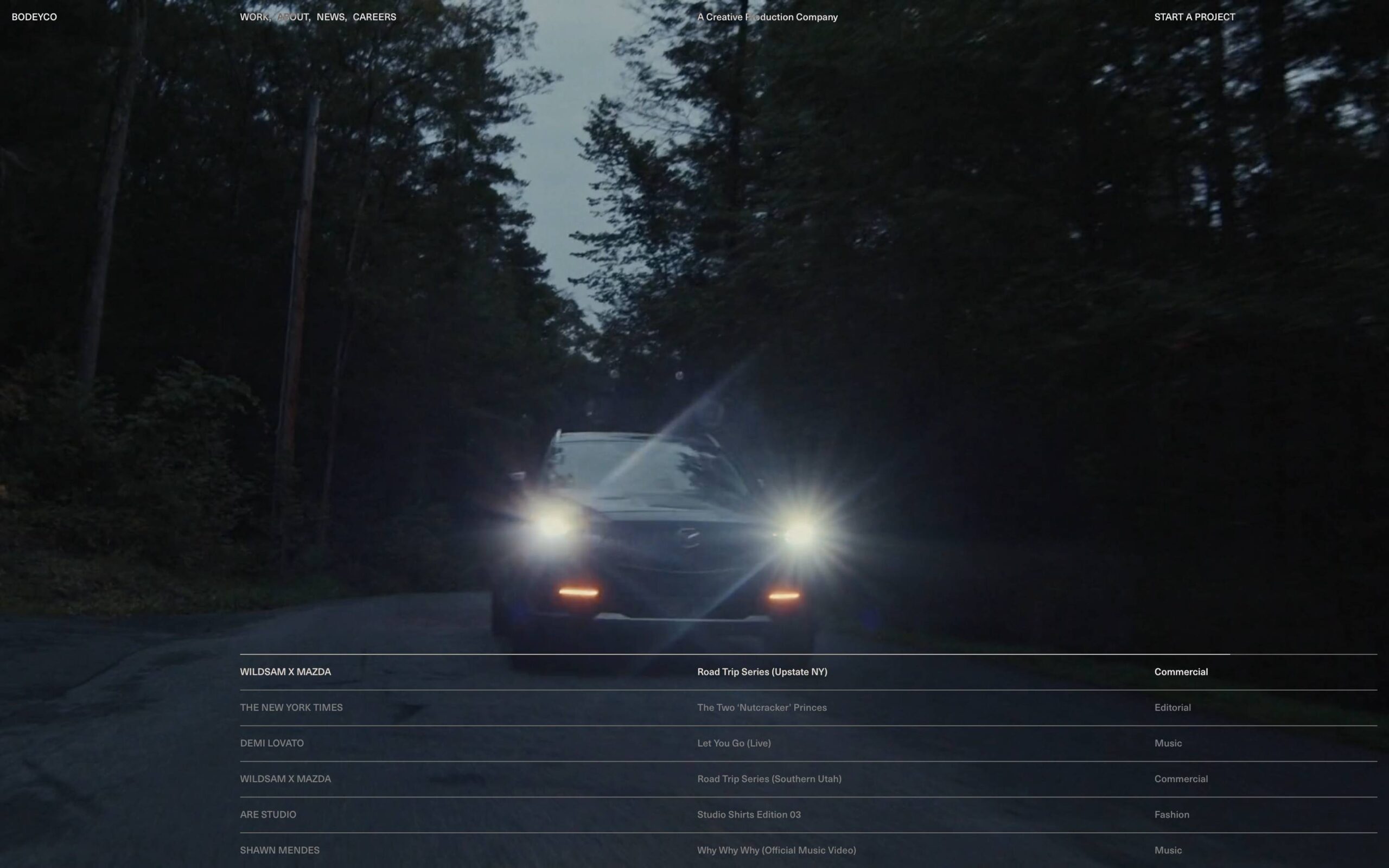 1352 bodeyco.com Production, Bright, Clean, Grid, Large Scale, Light, List, Minimal, Overlay Containers, Sans Serif Typeface, Simple, Small Typography, Technical, Video, White Space, Black, USA. Design: NSLT Studio. Development: NSLT Studio. (15-01-26) Permalink, ←Esc