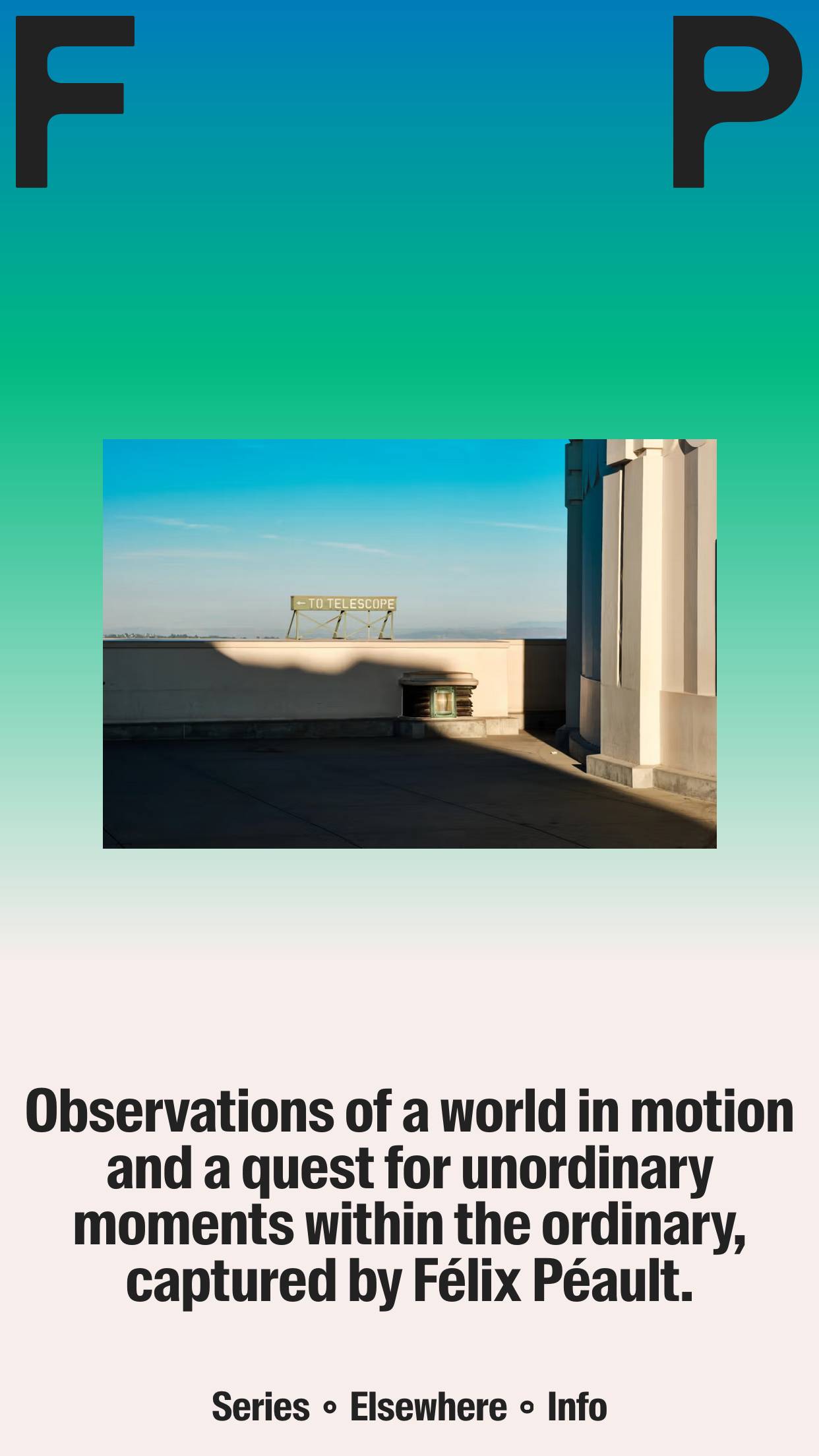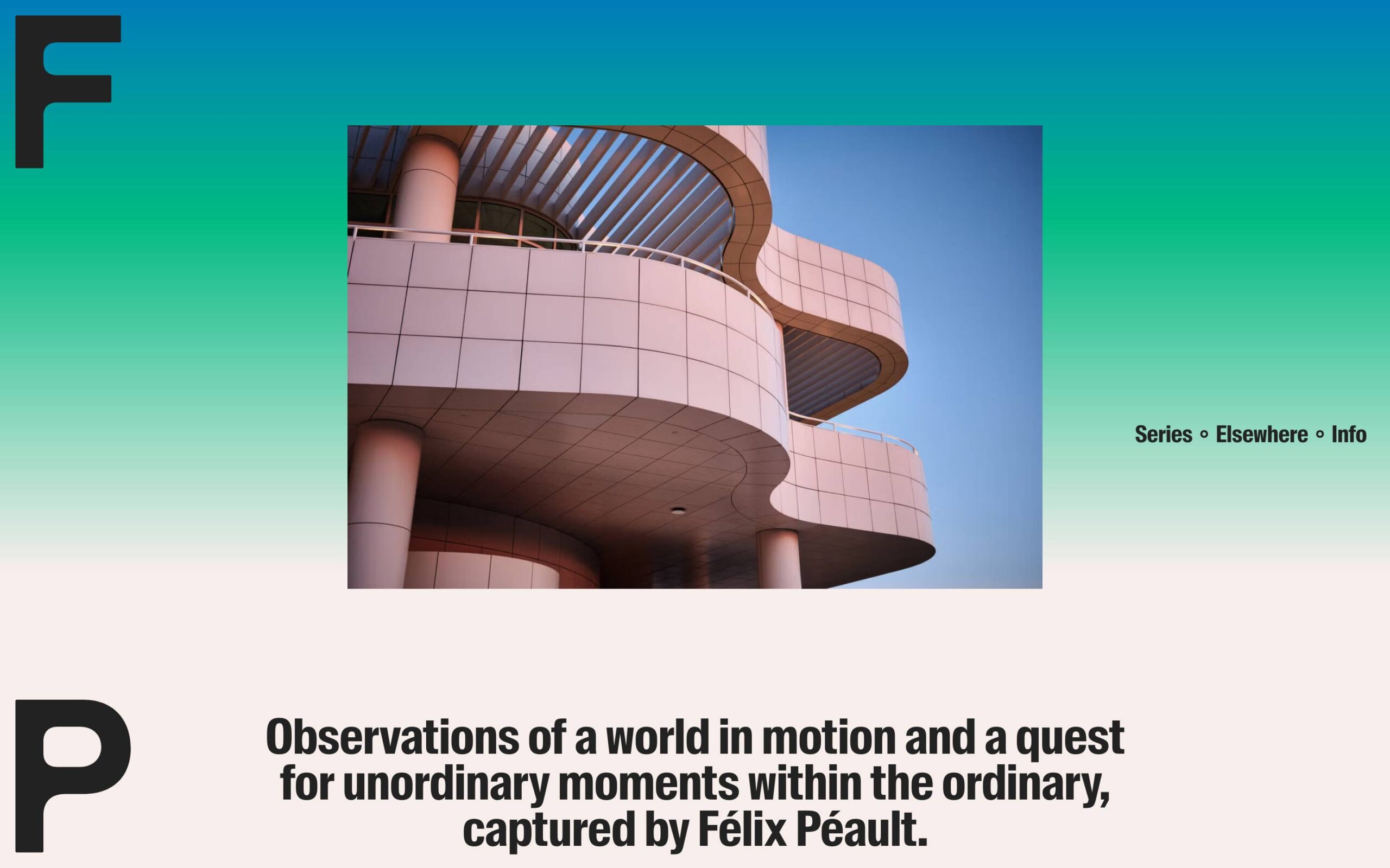 1345 felixpeault.com Photography, Big Title, Big Typography, Bold, Brutalist, Clean, Gradient, Large Scale, Layered, Light, Motion, Overlay Containers, Slider, White Space, Viridian, White, France. Design: Félix Péault. Development: Shelby Kay. (07-01-26) Permalink, ←Esc