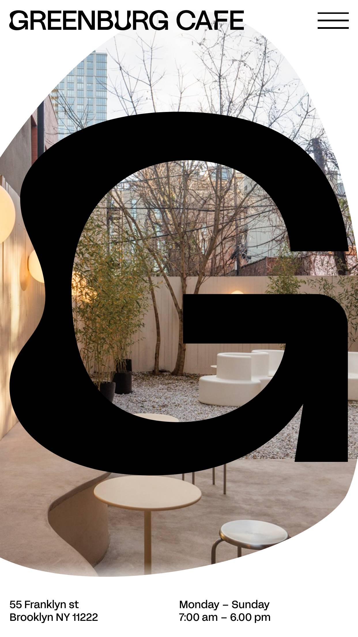 1351 greenburgcafe.com Cafe, Big Title, Big Typography, Bold, Bright, Brutalist, Clean, Grid, Light, Mini Site, Shapes, Black, White, USA. Design: Studio Vedèt. Development: Studio Vedèt. (14-01-26) Permalink, ←Esc