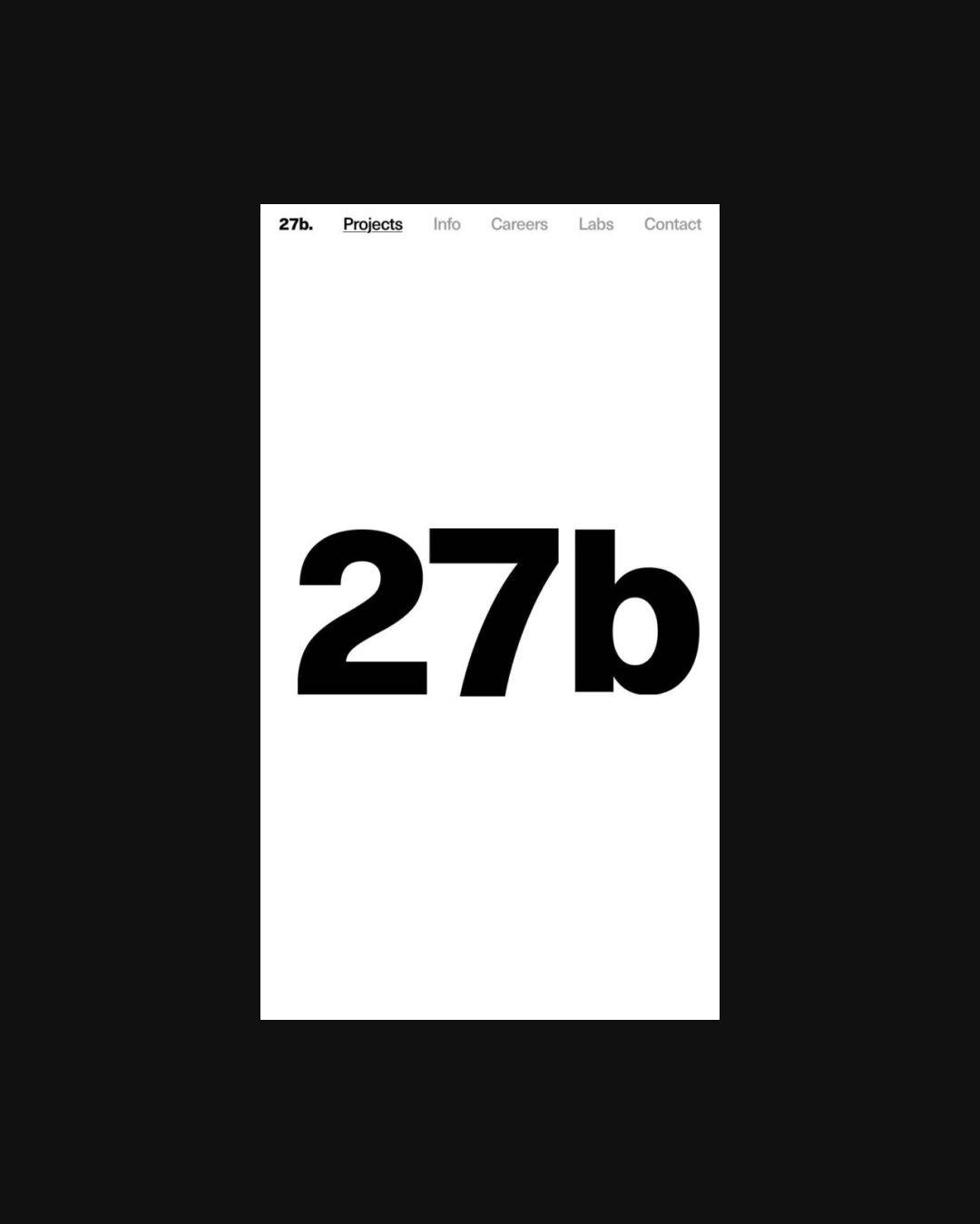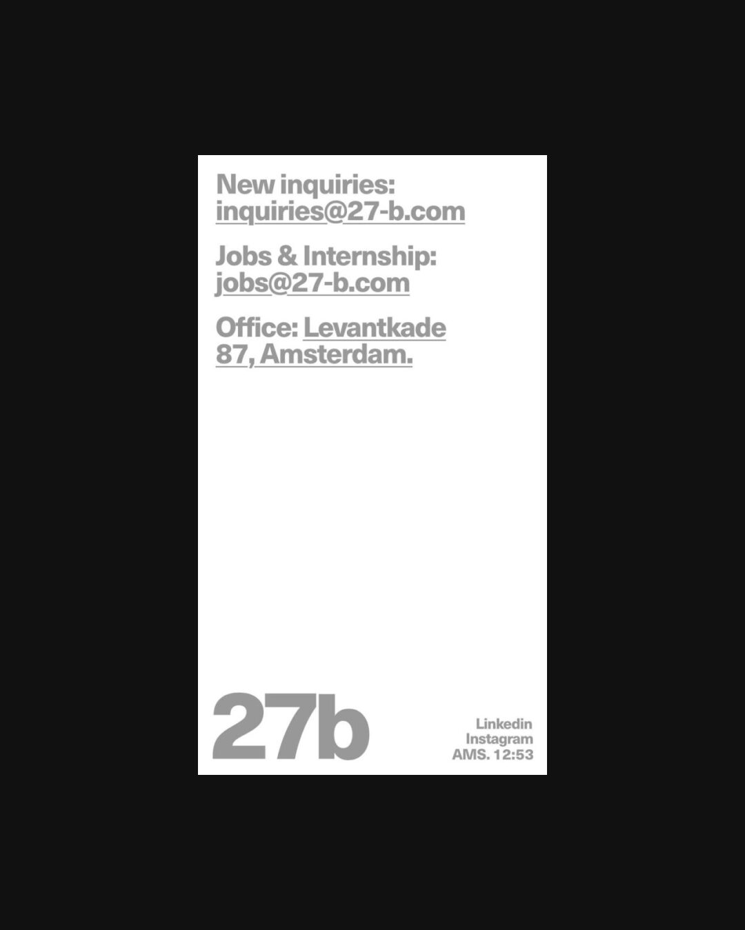 1057 27-b.com Portfolio, Animations, Big Images, Big Title, Bold, Brutalist, Clean, Custom Cursor, Grid, Large Scale, Minimal, Overlay Containers, Sans Serif Typeface, Video, White Space, Black, White, The Netherlands. Design: 27b. Development: 27b. (07-01-2025) ←Close