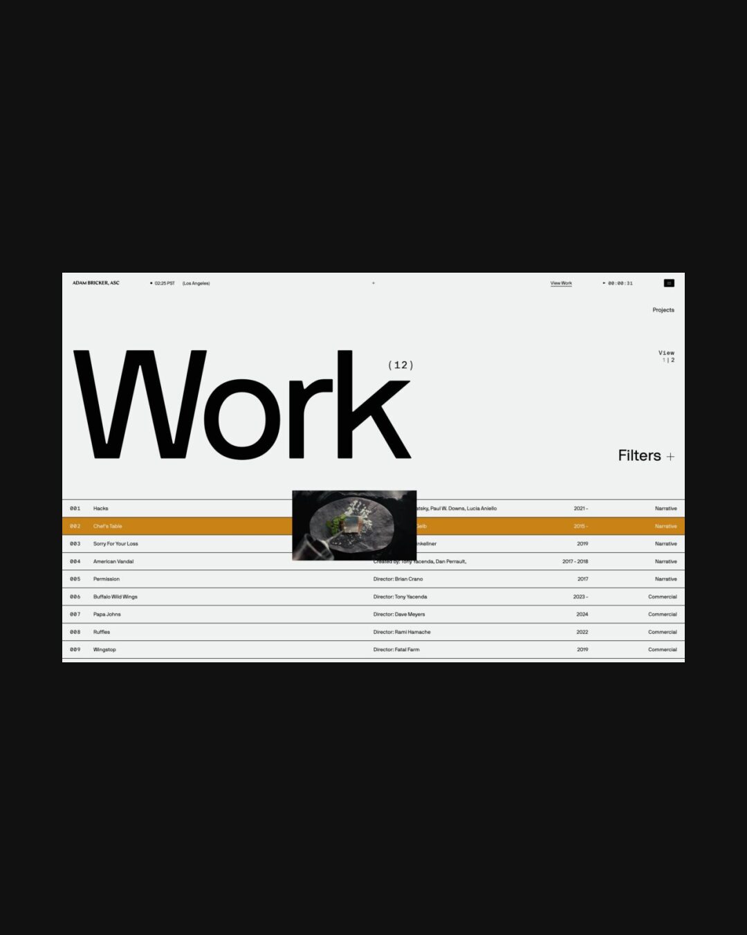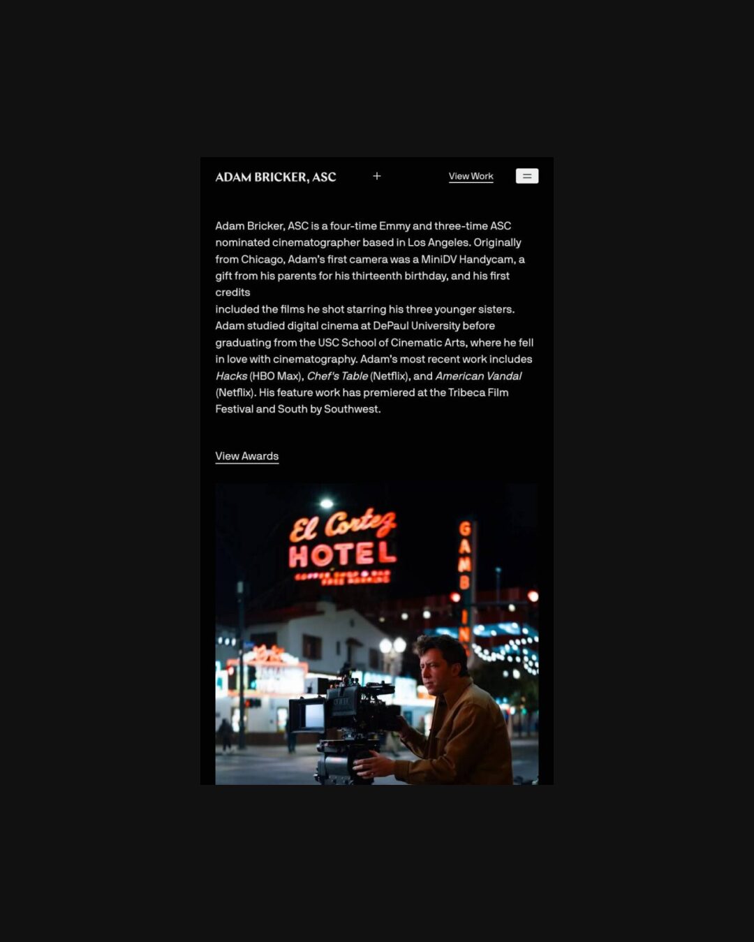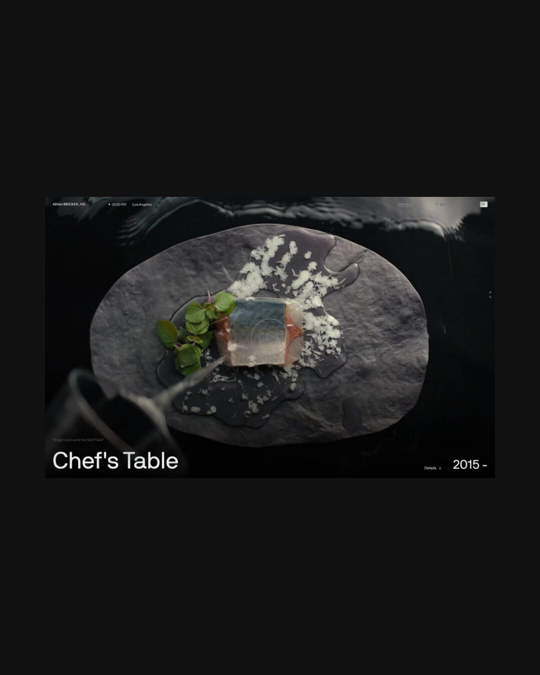 1178 adambricker.com Cinematography, Big Title, Clean, Large Scale, Light, Mixed Style Typefaces, Page Transitions, Video, Black, USA. Design: Cusp. Development: Luke Bailey. (17-06-2025) ←Close
