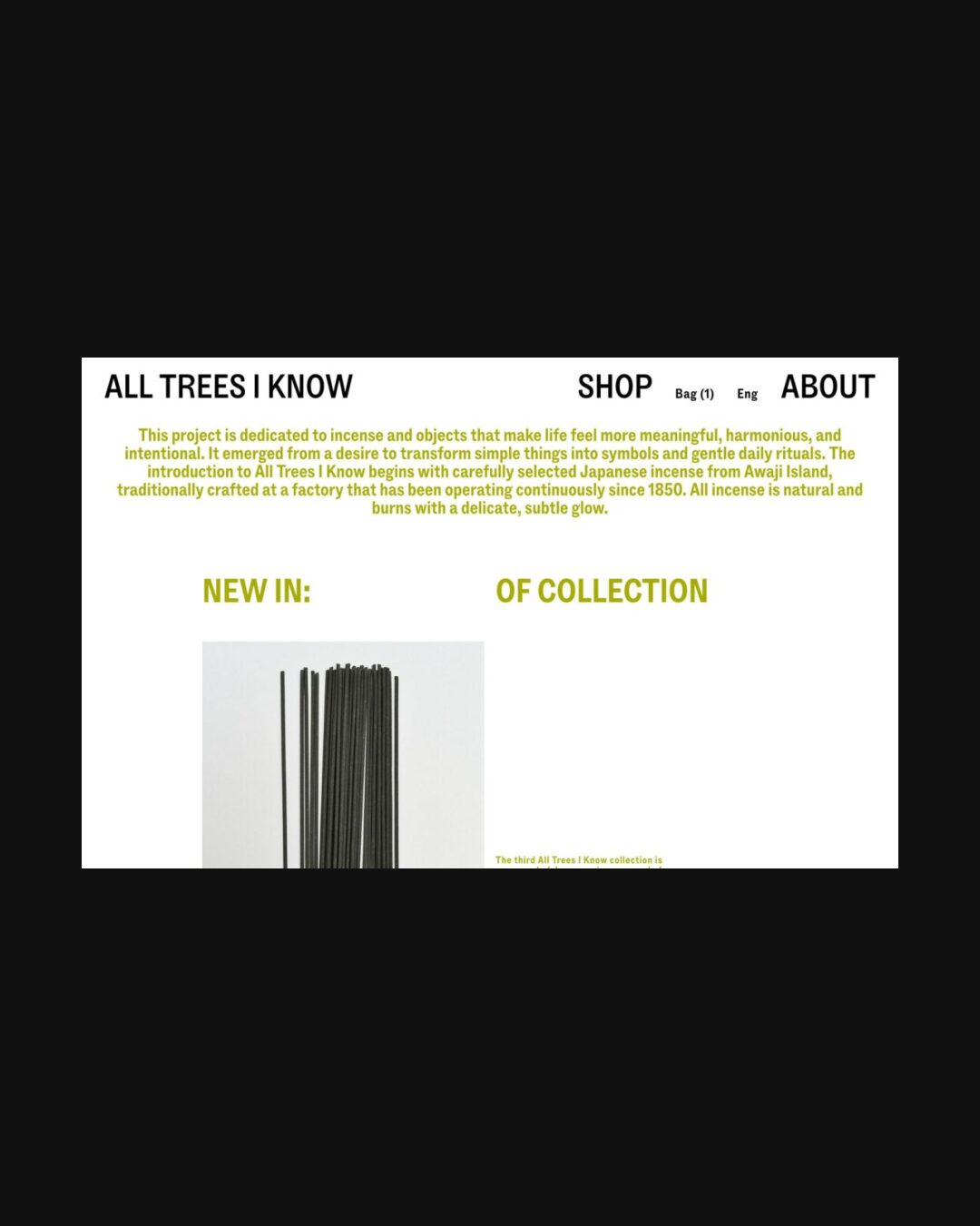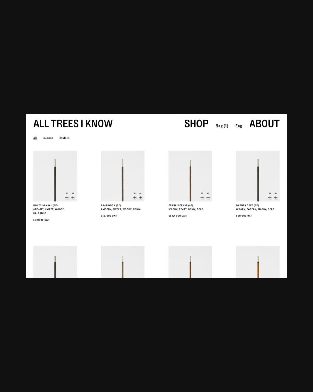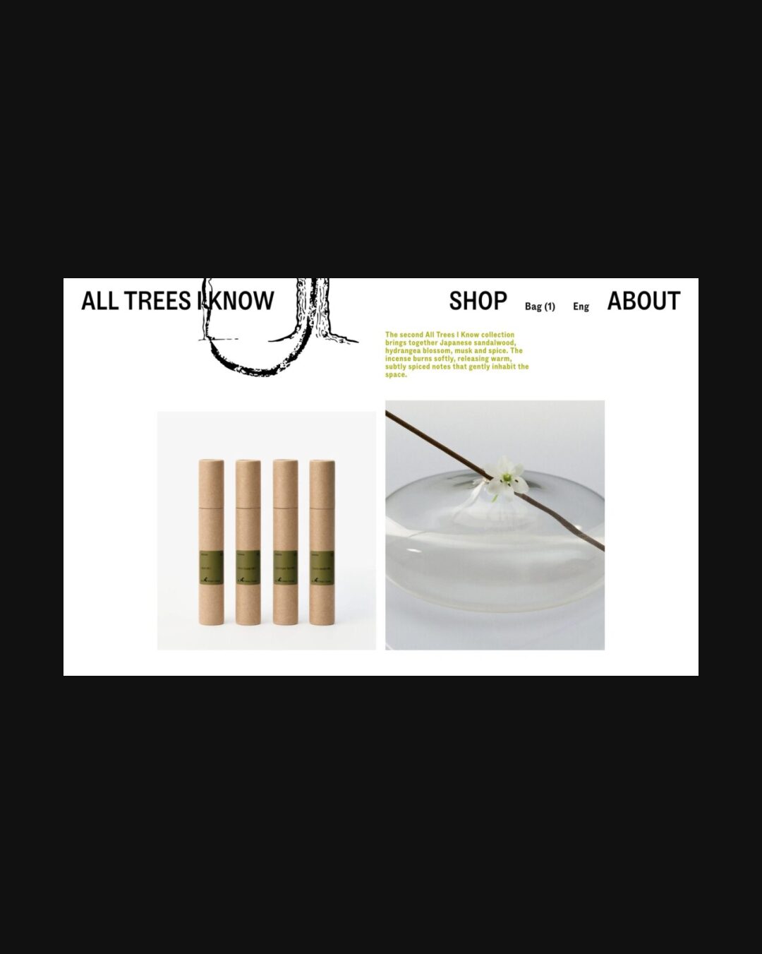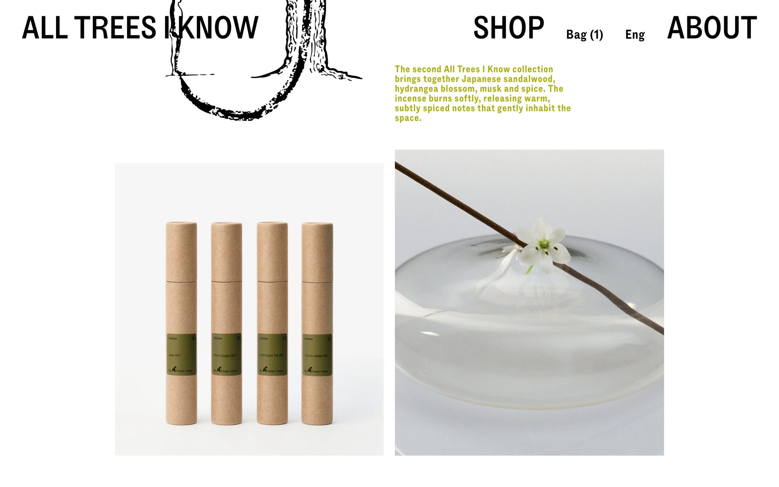 1308 alltreesiknow.com Incense, Big Typography, Bold, Brutalist, Clean, E-commerce, Editorial, Grid, Large Scale, Light, Minimal, Sans Serif Typeface, White Space, Black, White, Design: Perpl Community. Development: Ecce Lizard. (14-03-2026) ←Close