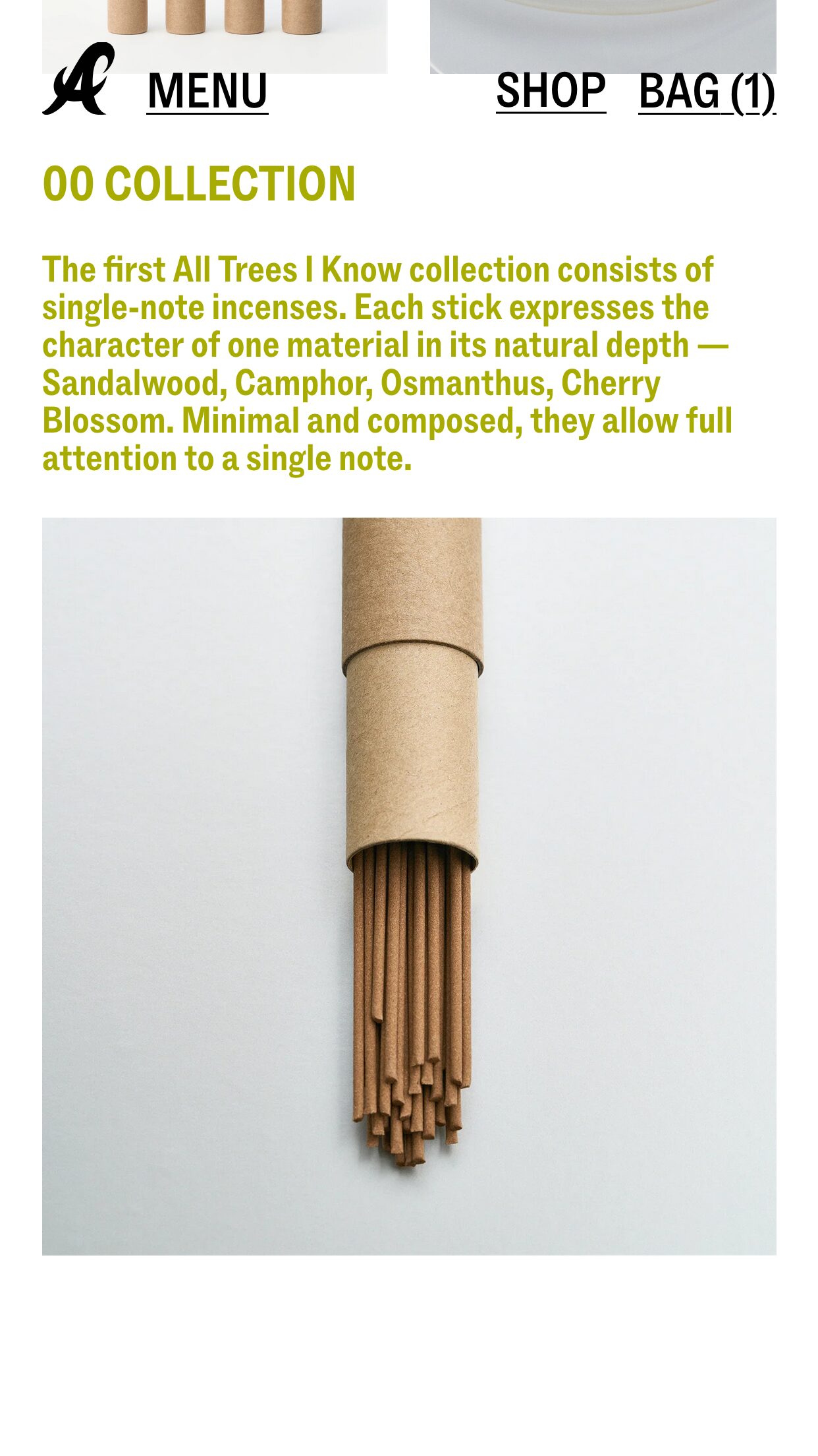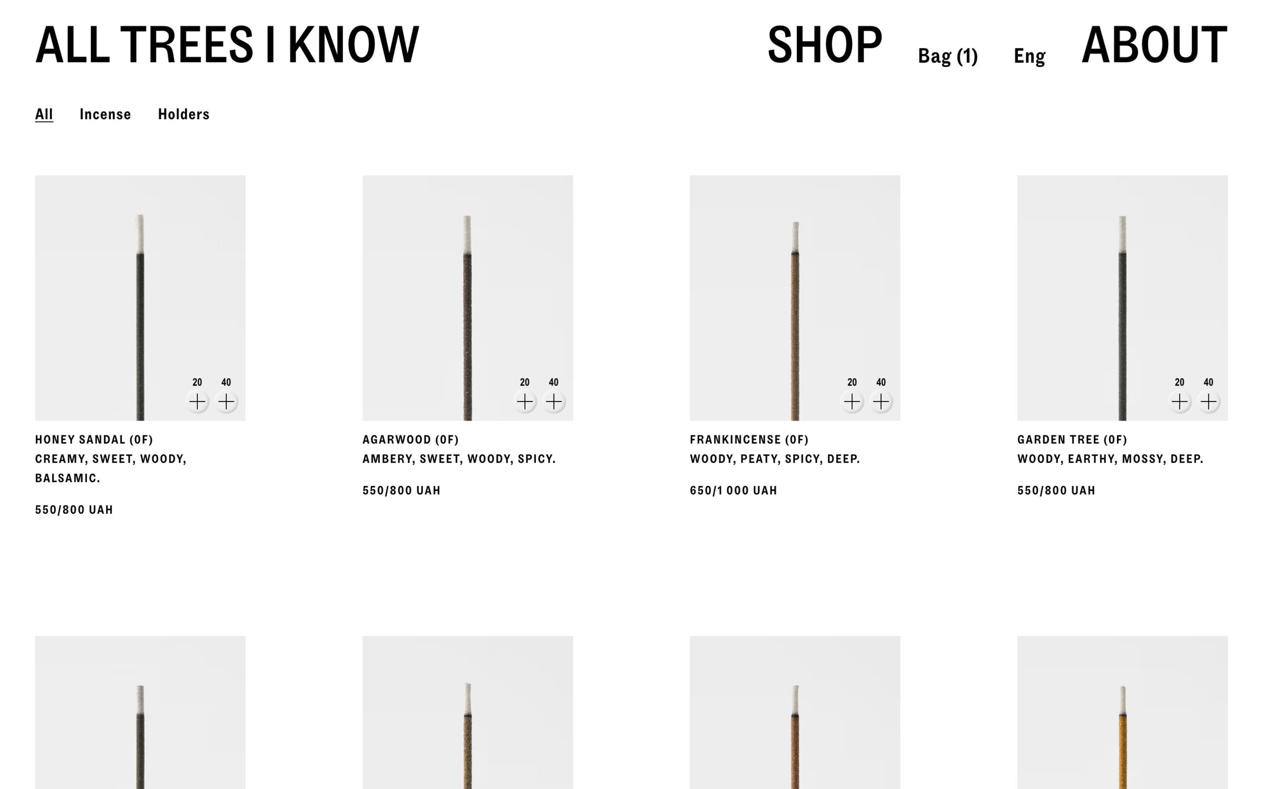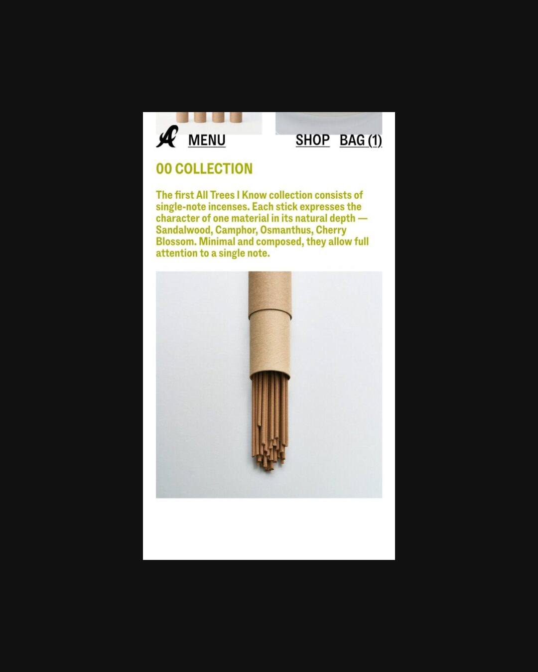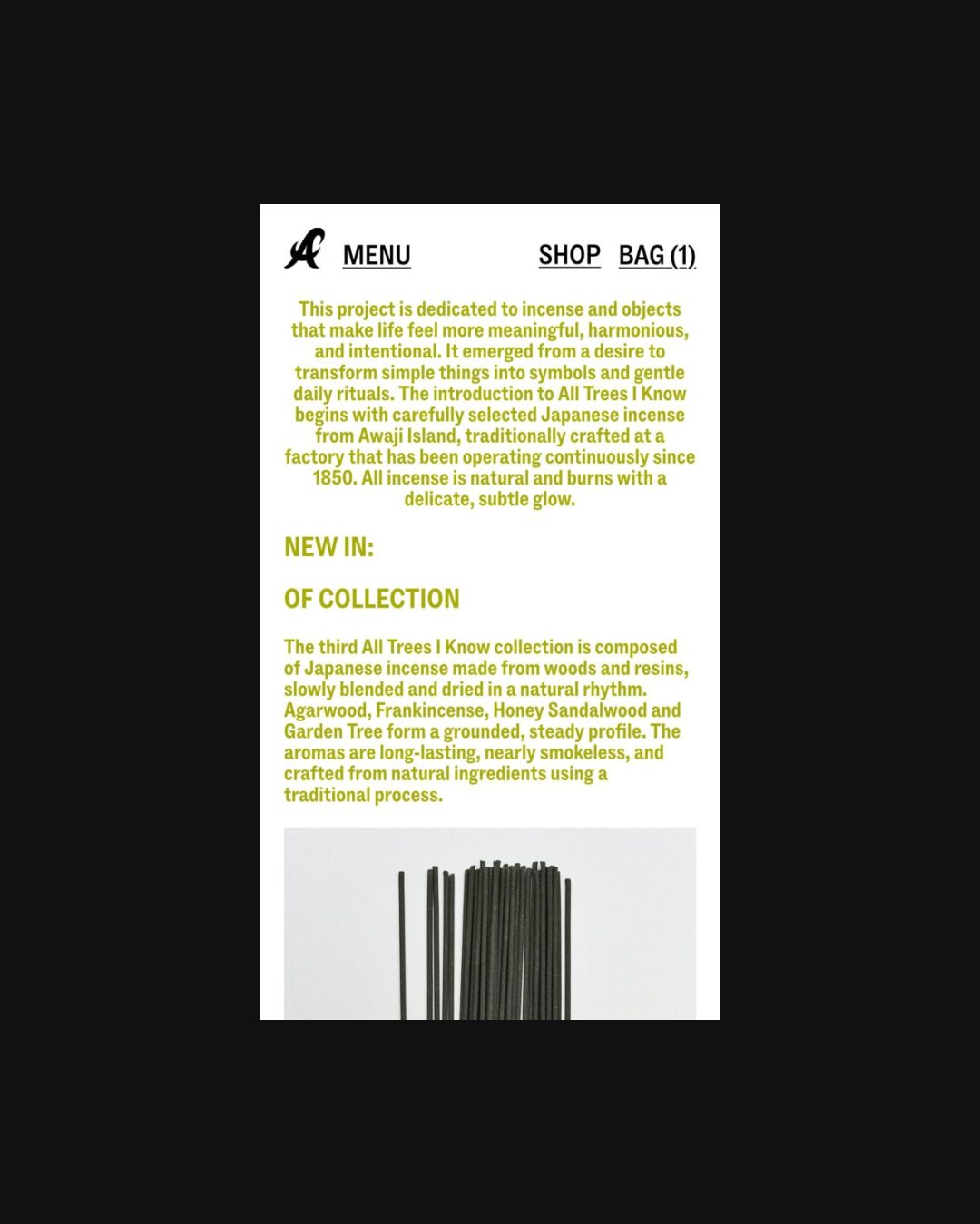 1308 alltreesiknow.com Incense, Big Typography, Bold, Brutalist, Clean, E-commerce, Editorial, Grid, Large Scale, Light, Minimal, Sans Serif Typeface, White Space, Black, White, Design: Perpl Community. Development: Ecce Lizard. (14-03-2026) ←Close