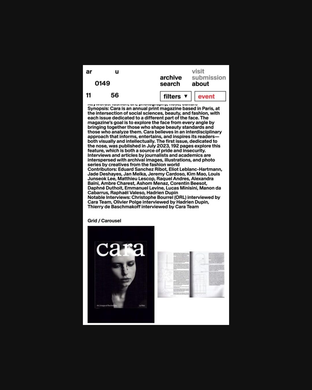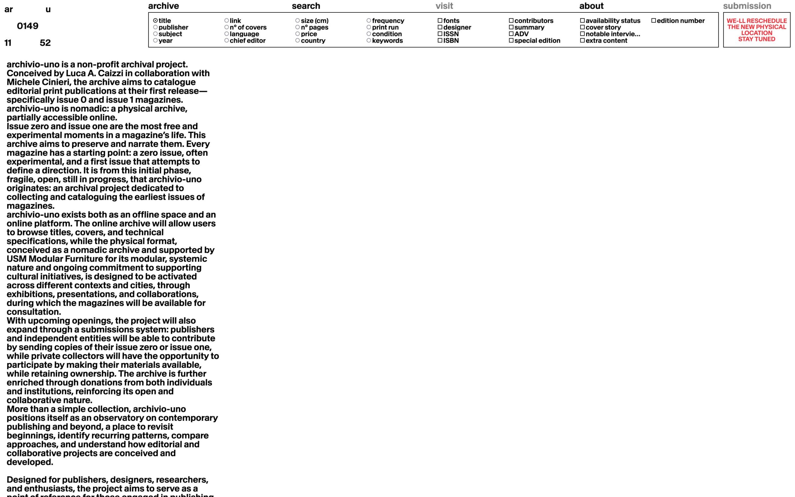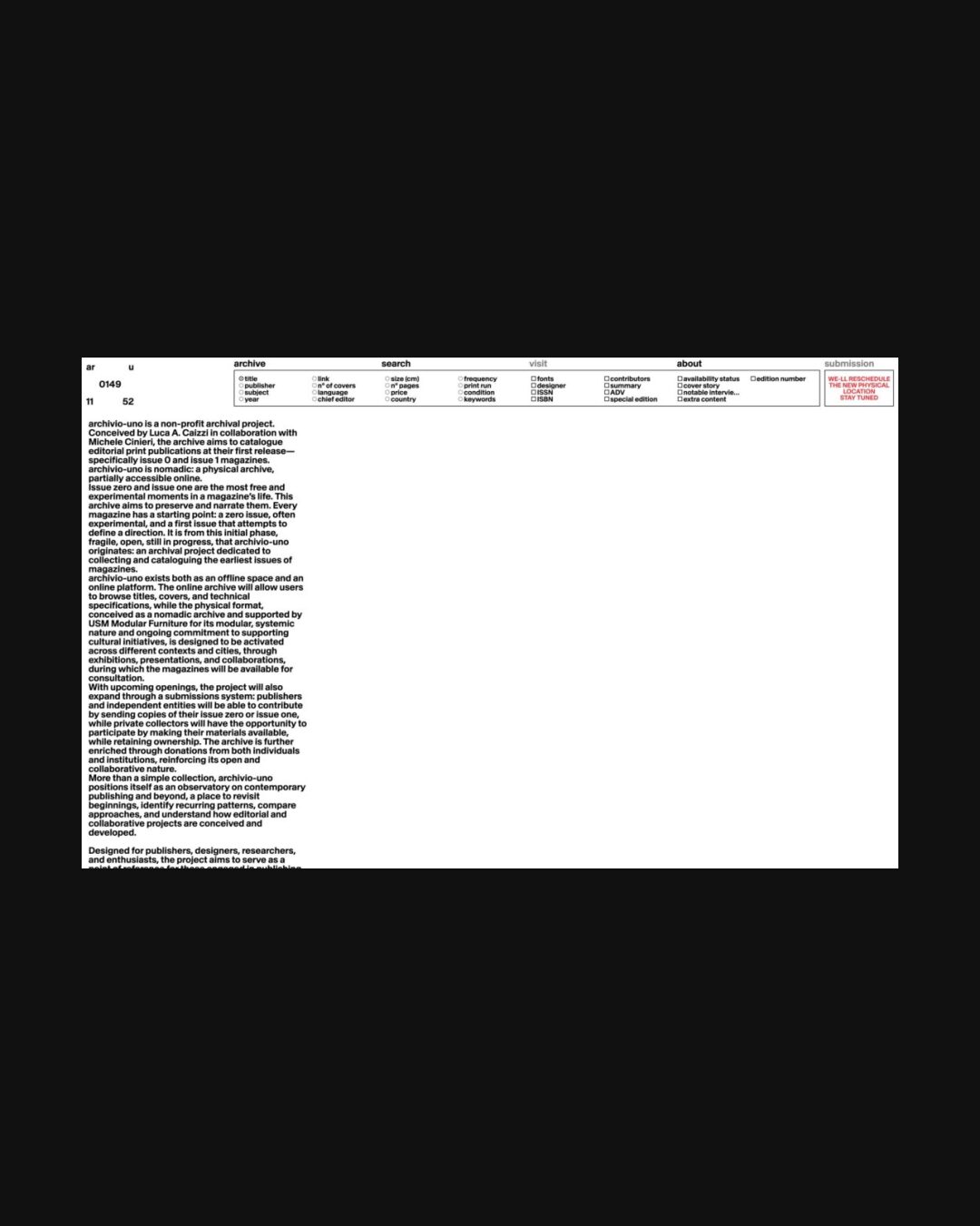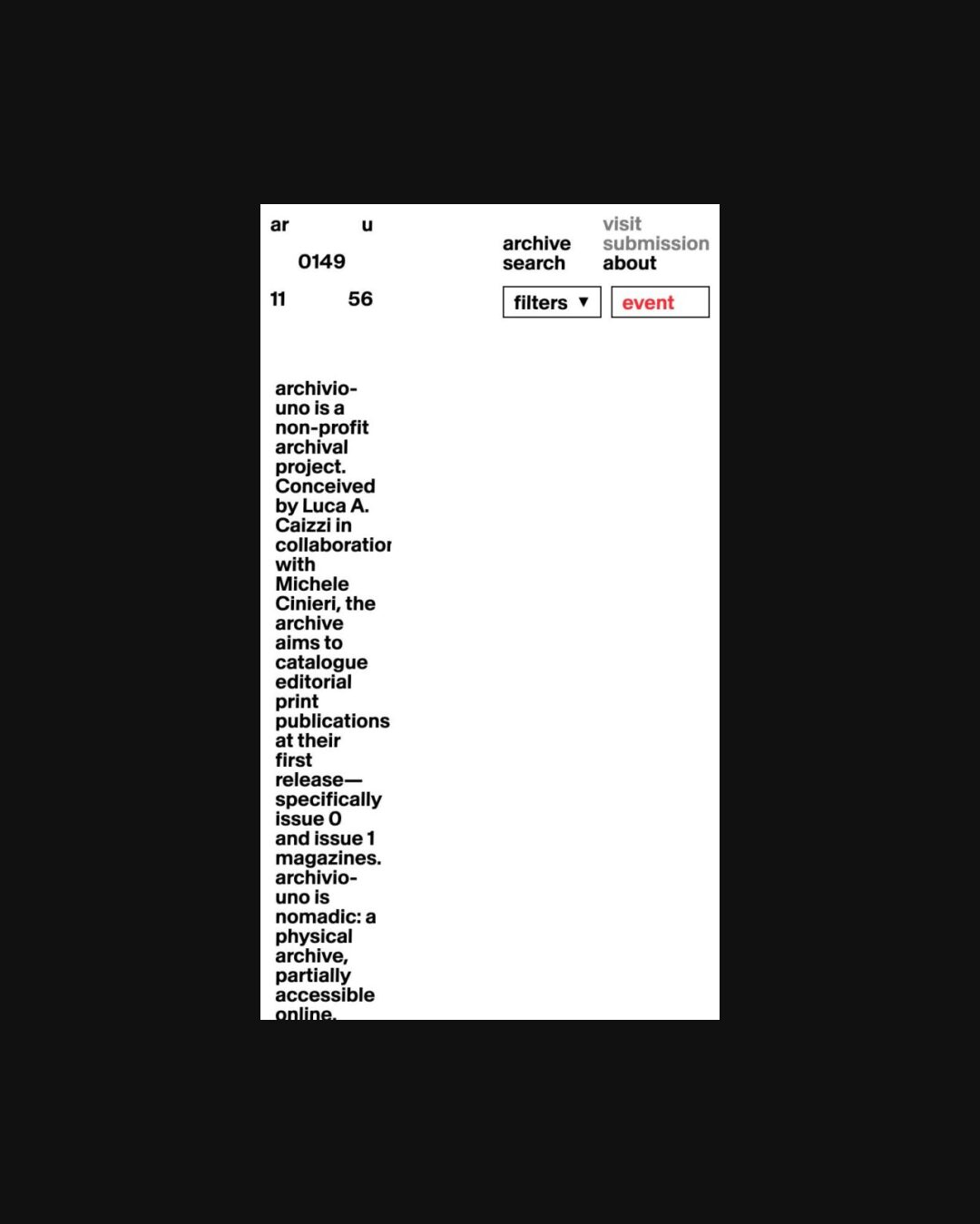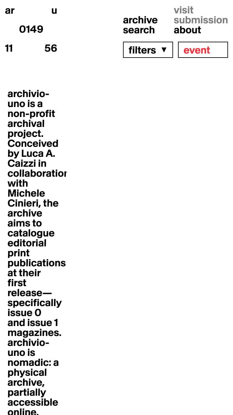 1333 archivio-uno.com Archival, Bold, Bright, Brutalist, Clean, Grid, Large Scale, Layered, Light, List, Minimal, Motion, Overlay Containers, Sans Serif Typeface, Simple, Slider, White Space, Black, White, Italy. Design: Nicolò Oriani, Studio Temp. Development: Tilt. (28-04-2026) ←Close