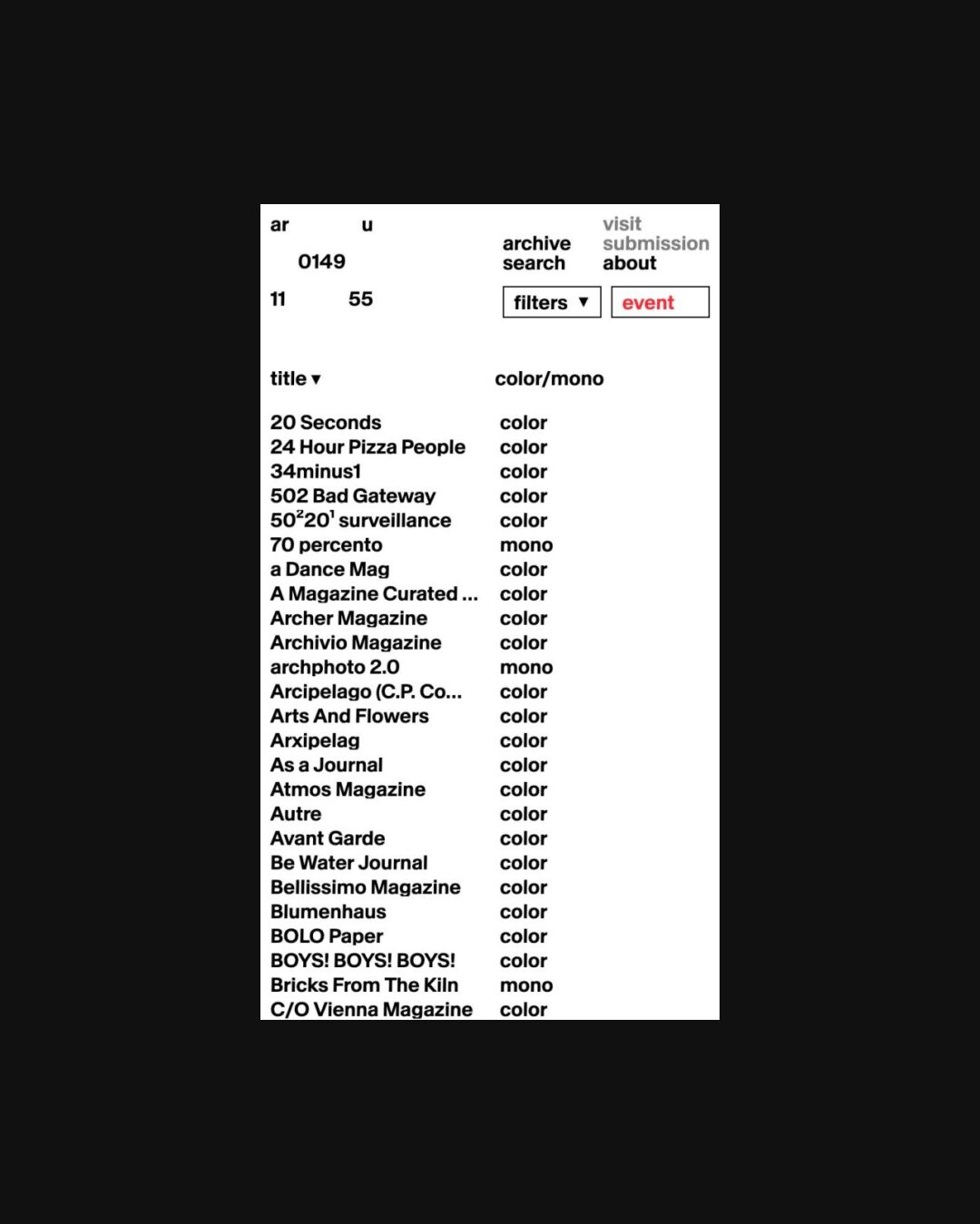 #3D #Animations #Ascii #Asymmetrical Grid #Audio #Bauhaus #Big Images #Big Title #Big Typography #Black & White #Blocks #Blur #Bold #Bright #Brutalist #Buttons #Camera Tracking #Clean #Clock #Collage #Collapsing containers #Colorful #Creative Layout #Cursor Follow #Custom Cursor #Custom Scroll #Dadaist #Dark #Draggable Elements #Duo-tone #E-commerce #Editorial #Forms #Gradient #Grainy #Gray #Grid #Gritty #Halftone #Holding Page #Horizontal Scroll #Hover Events #Illustrations #Industrial #International Style #Large Scale #Layered #Light #List #Lo-FI #Lowercase #Map #Marquee #Mask #Mini Site #Minimal #Mixed Style Typefaces #Mode Switch #Mono Typeface #Monotone #Motion #Multicolor #Newspaper #One Page #Opacity #Overlay Containers #Page Transitions #Parallax #Pattern #Pixelated #Playful #Retro #Rotated Text #Rounded Corners #Sans Serif Typeface #Scaling #Scroll Events #Scroll Position Animation #Scroll Snap #Serif Typeface #Shapes #Simple #Slider #Small Typography #Split Scroll #Sticky Elements #Stretched Text #Table #Technical #Technologic #Text Highlight #Text Only #Thin #Timeline #Transform #Typographic #Uppercase #Variable Title #Vertical Text #Video #White Space #Y Scroll