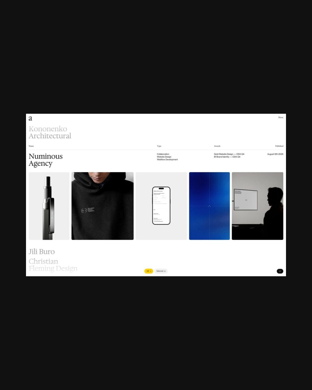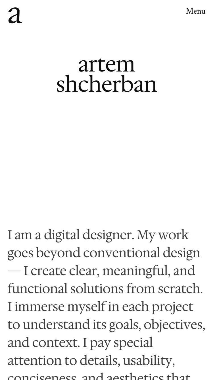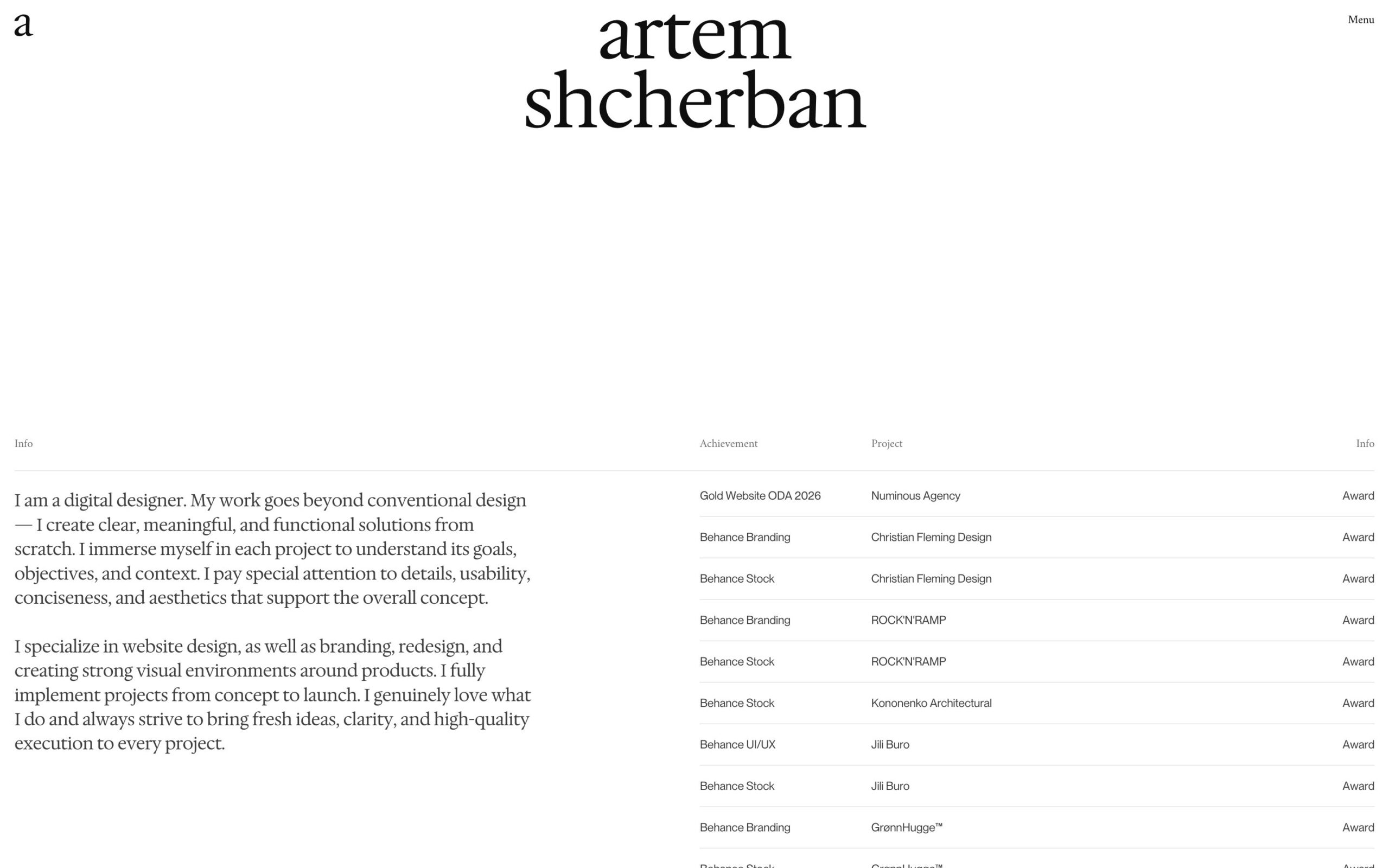 1309 artemshcherban.com Design, Audio, Big Title, Big Typography, Bright, Clean, Creative Layout, Editorial, Grid, Large Scale, Layered, Light, List, Minimal, Mixed Style Typefaces, Motion, Overlay Containers, Scroll Events, Scroll Position Animation, Scroll Snap, Technical, Video, White Space, Black, White, Kazakhstan. Design: Artem Shcherban. Development: Alexandr Chsherban. (19-03-2026) ←Close