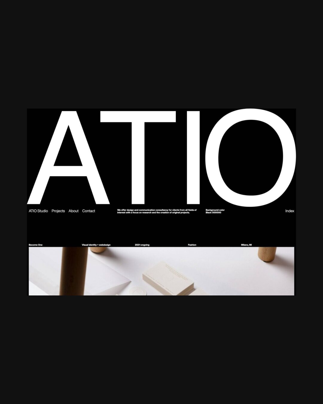 0594 atio.studio Design, Big Title, Big Typography, Clean, Dark, International Style, Large Scale, Scroll Events, Black, White, Italy. Design: Atio Studio. Development: Atio Studio. (24-02-2023) ←Close