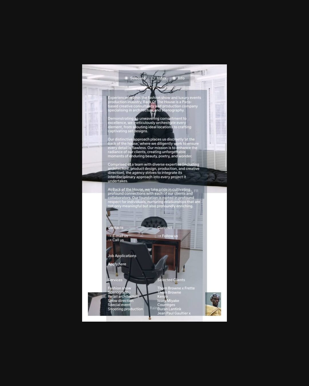 0914 backofthehouse.com Production, Animations, Asymmetrical Grid, Clean, Minimal, Sans Serif Typeface, Scroll Events, Slider, Small Typography, Silver, White, France. Design: Thomas Hervé Studio. Development: Philipp Polder. (22-06-2024) ←Close