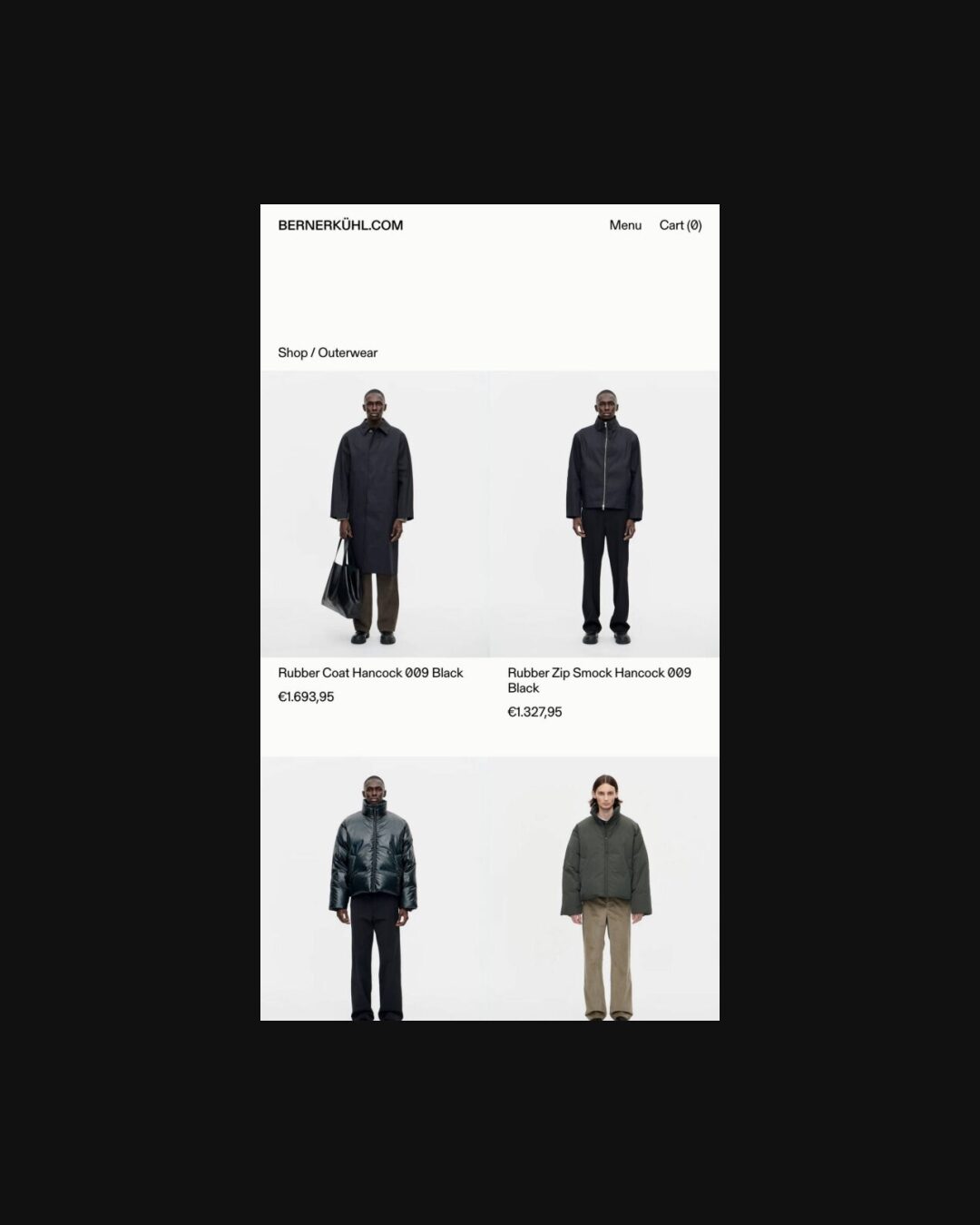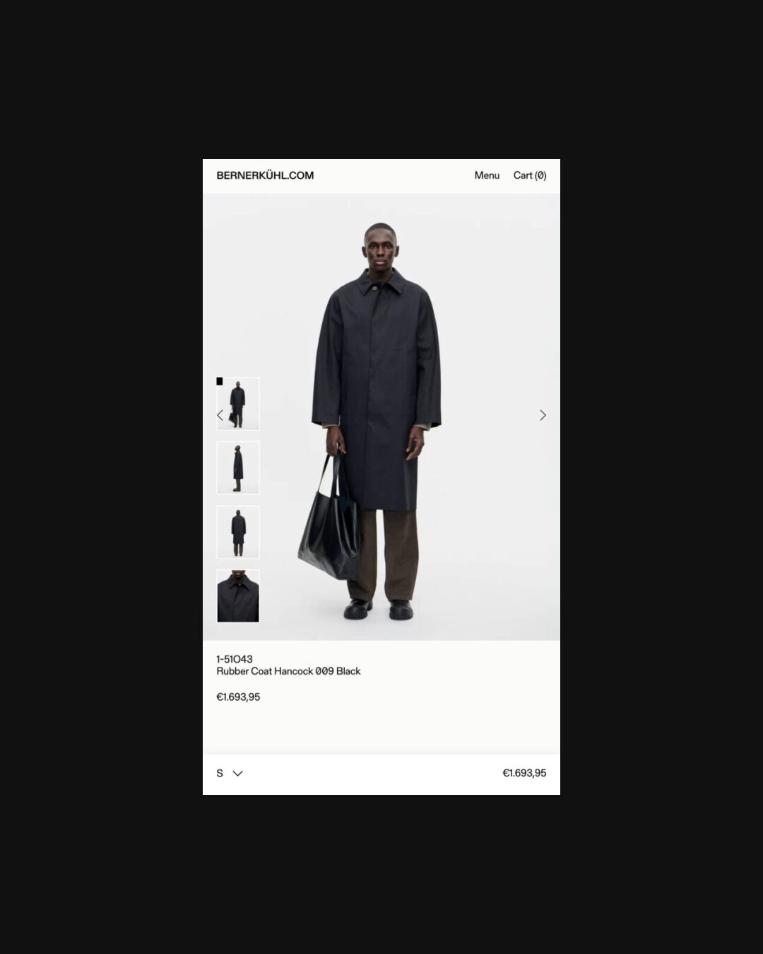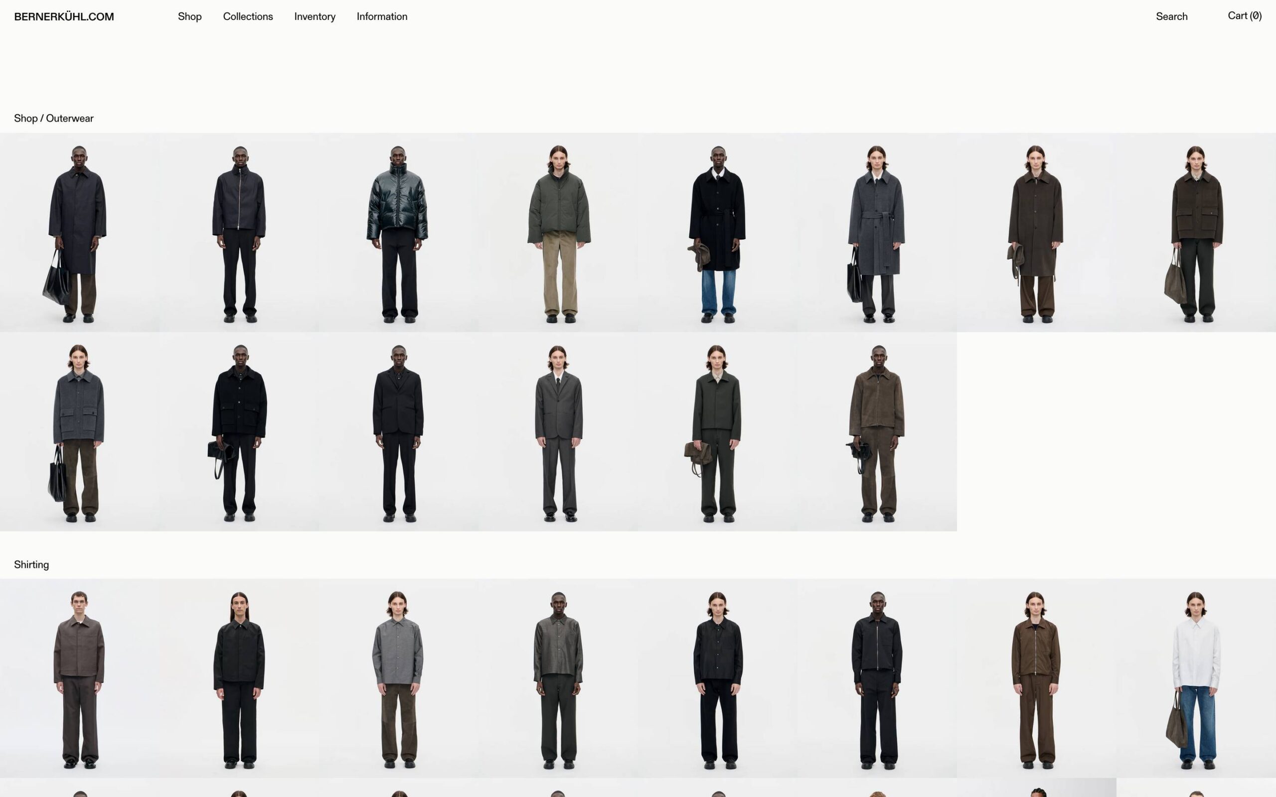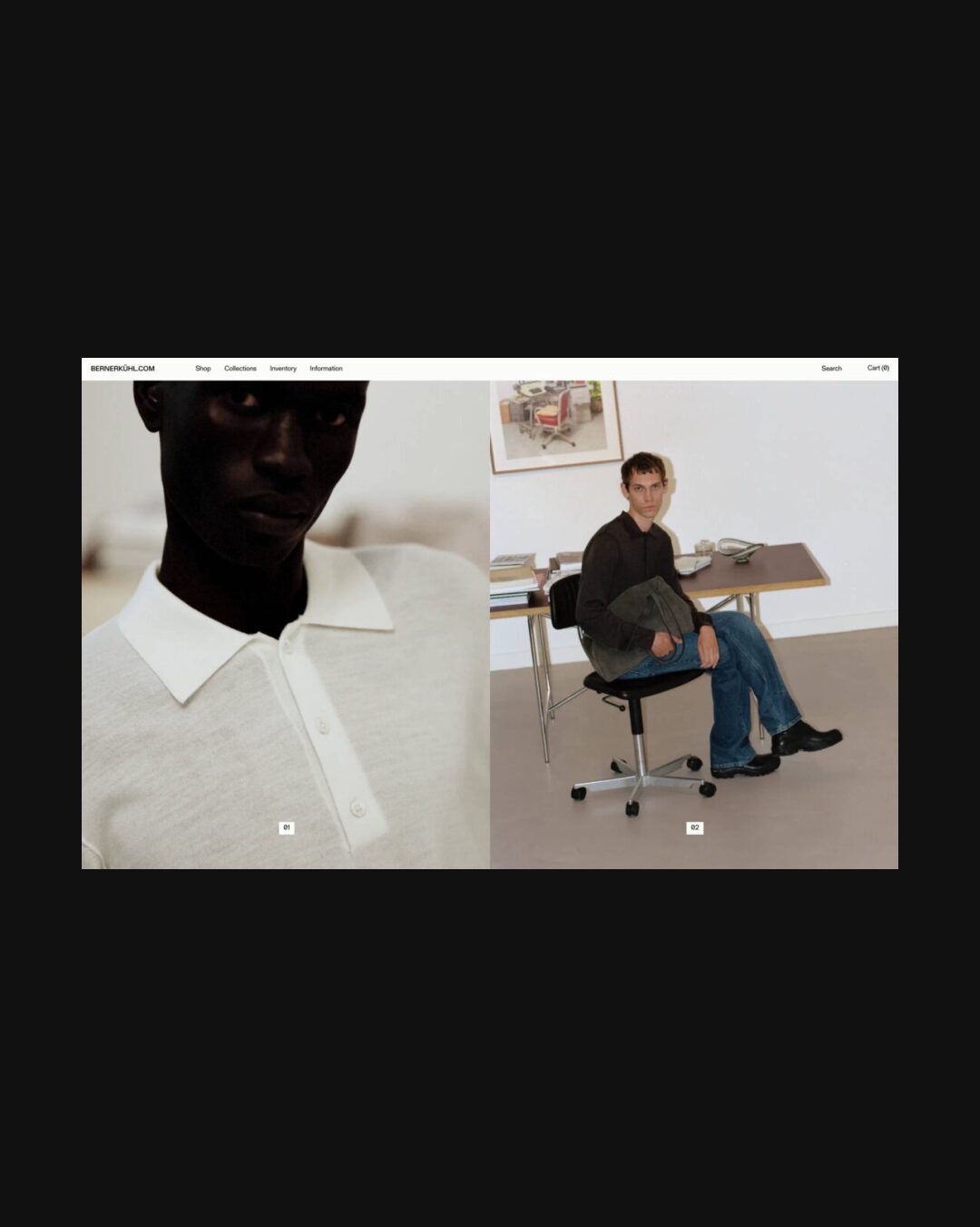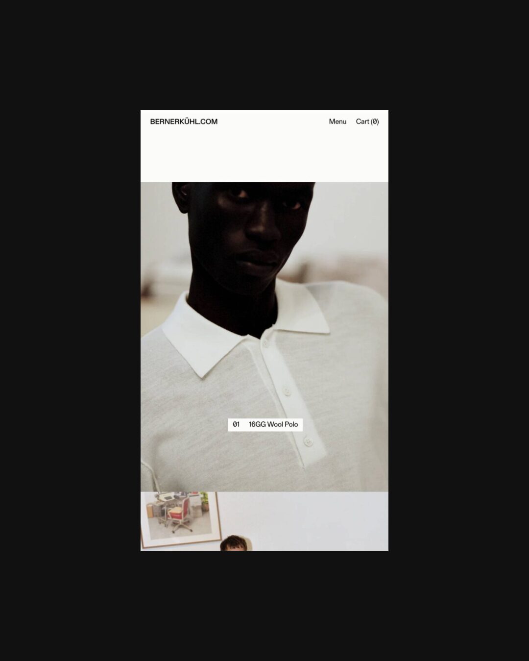 0512 bernerkuhl.com Fashion, Big Images, Clean, E-commerce, Grid, Large Scale, Light, Minimal, Simple, Small Typography, Black, Silver, White, Denmark. Design: Harrison Gyde. Development: Open Statement. (17-10-2022) ←Close