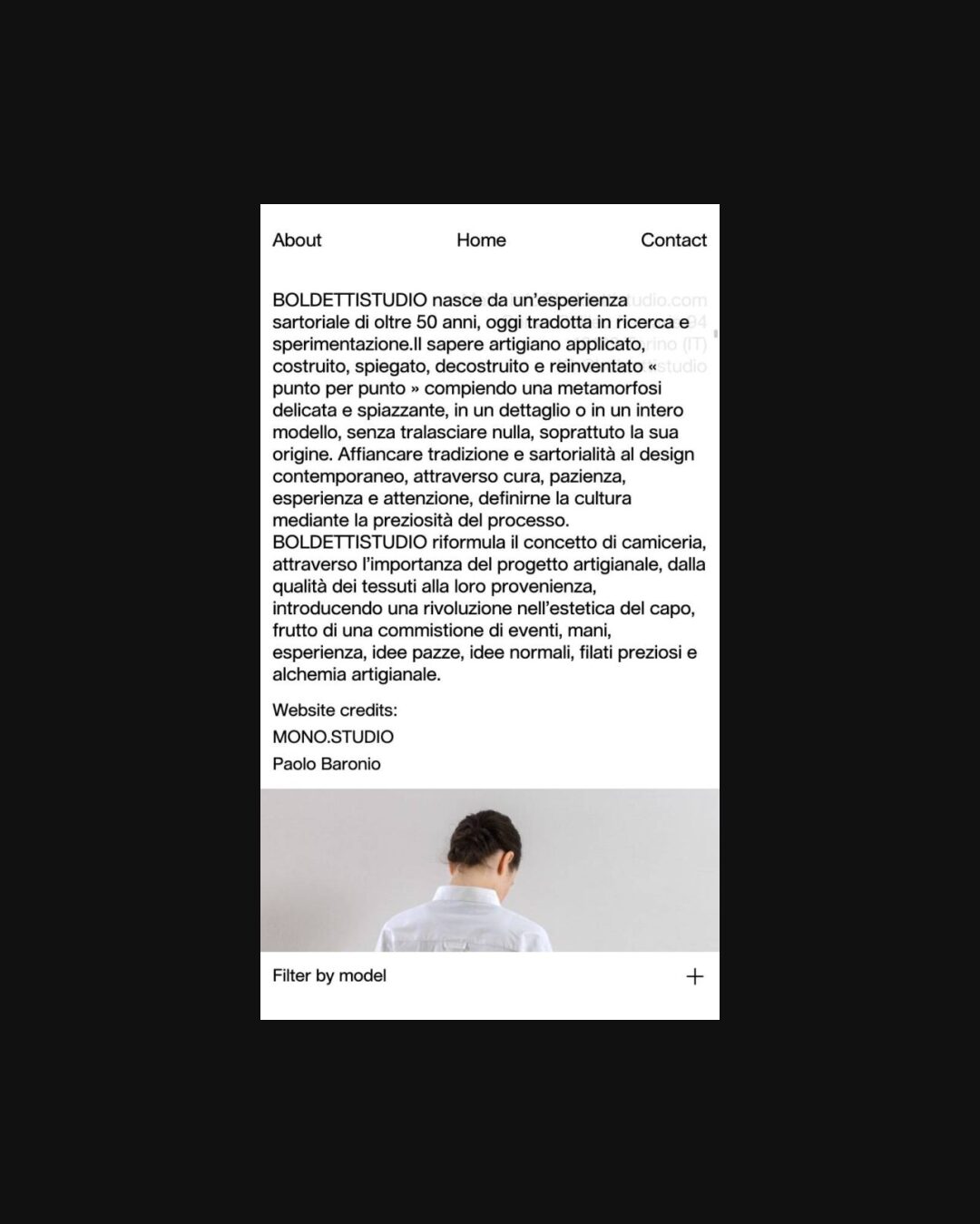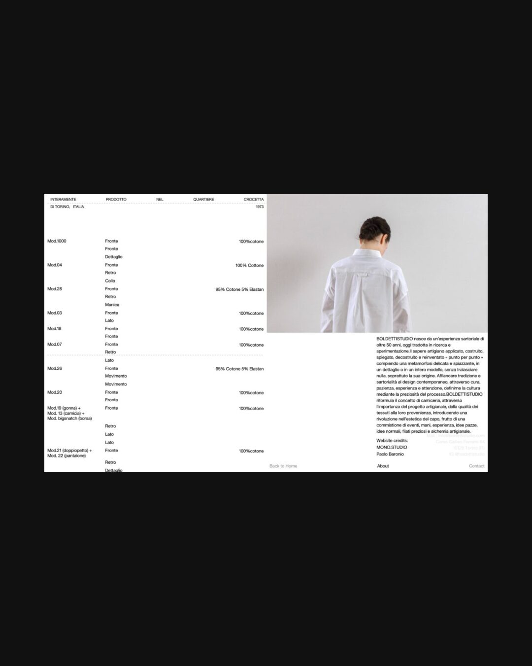 1241 boldettistudio.com Fashion, Brutalist, Clean, Grid, Large Scale, Layered, Light, List, Minimal, Overlay Containers, Sans Serif Typeface, Simple, Small Typography, White Space, Silver, White, Italy. Design: Mono Studio, Paolo Baronio. Development: Paolo Baronio. (09-09-2025) ←Close