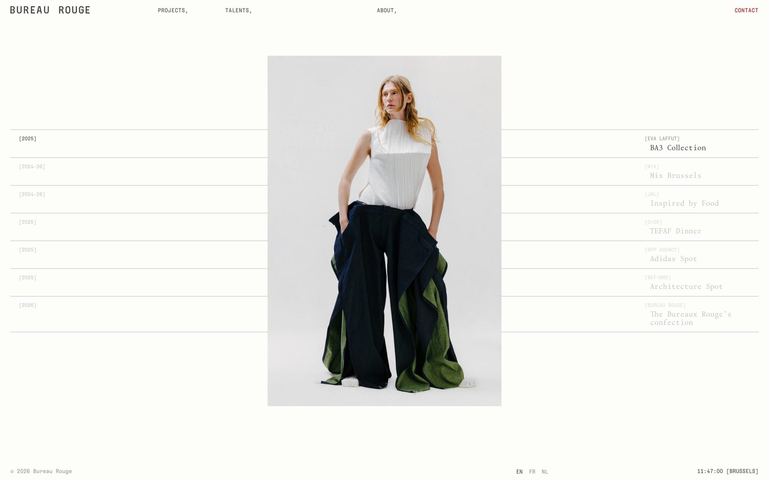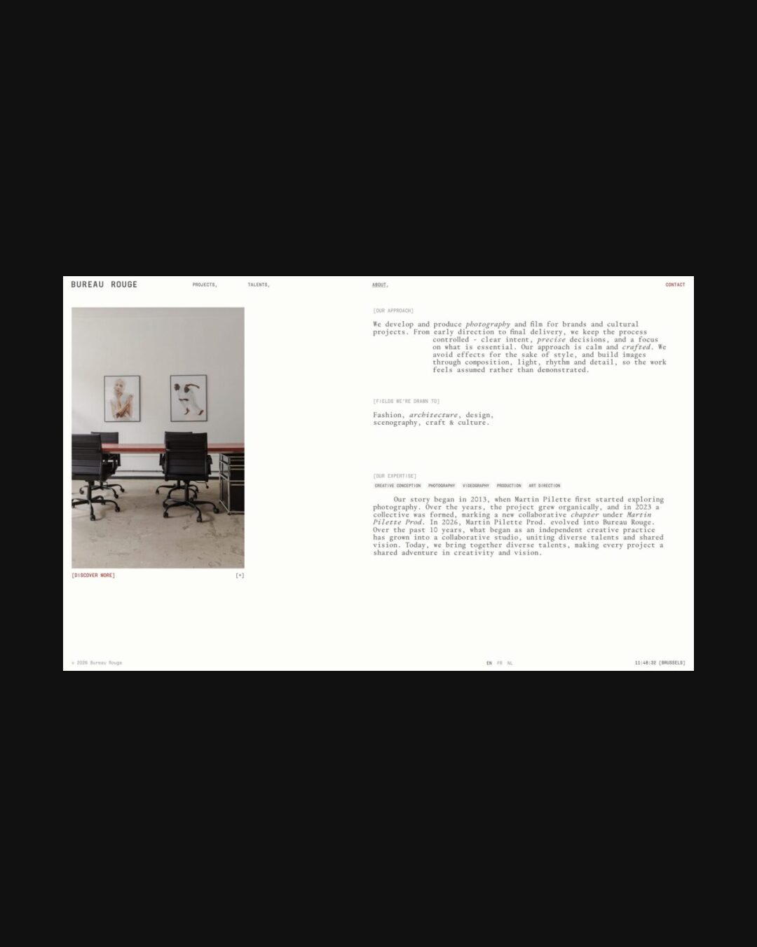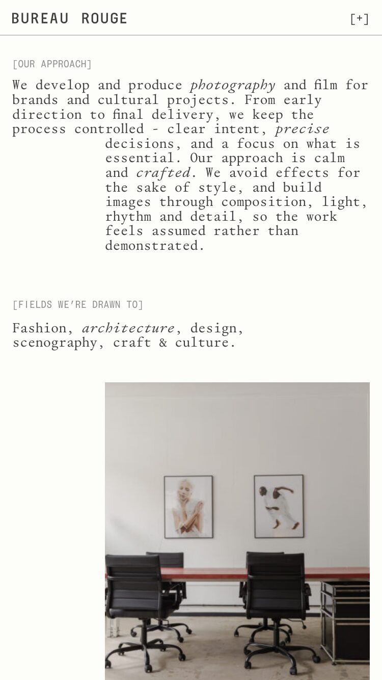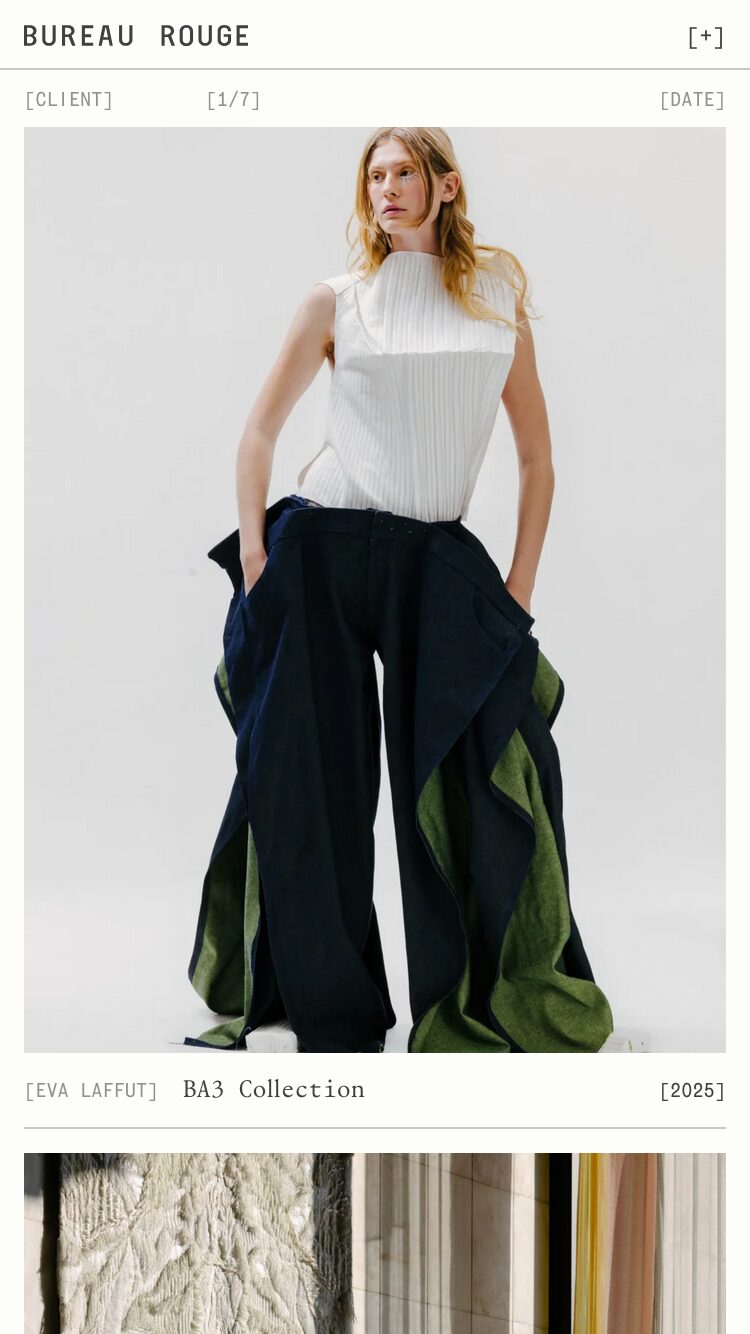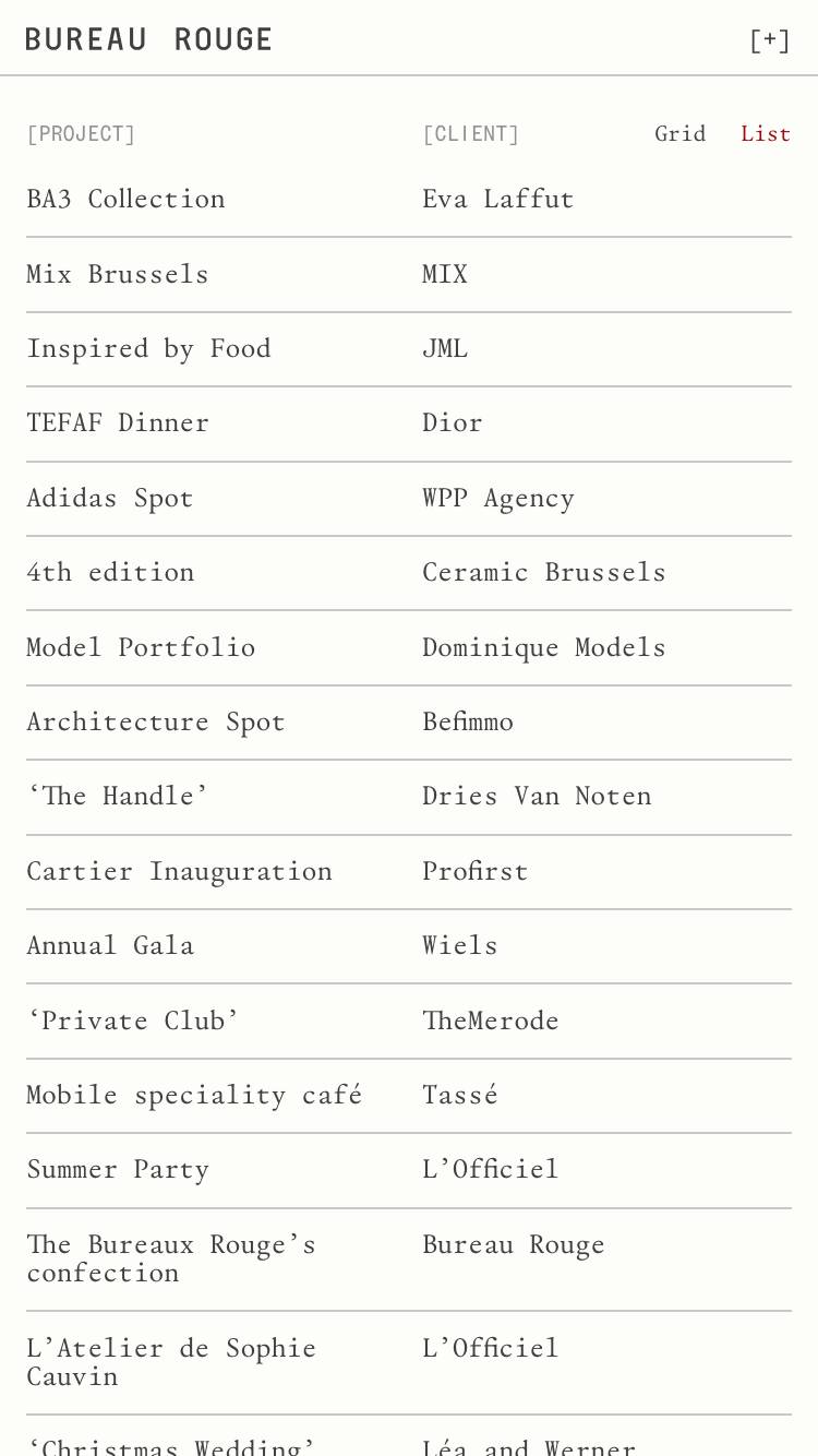 1332 bureaurouge.com Creative Studio, Bright, Clean, Grid, Large Scale, Layered, Light, List, Minimal, Mono Typeface, Simple, Small Typography, White Space, Black, Chocolate, Belgium. Design: Natalia Karczewska. Development: Theo Plawinski. (27-04-2026) ←Close