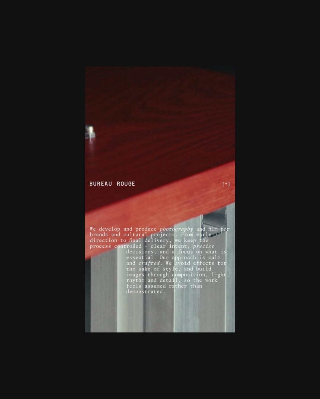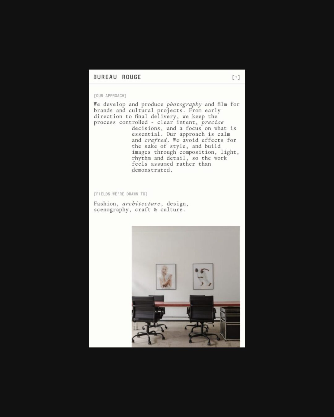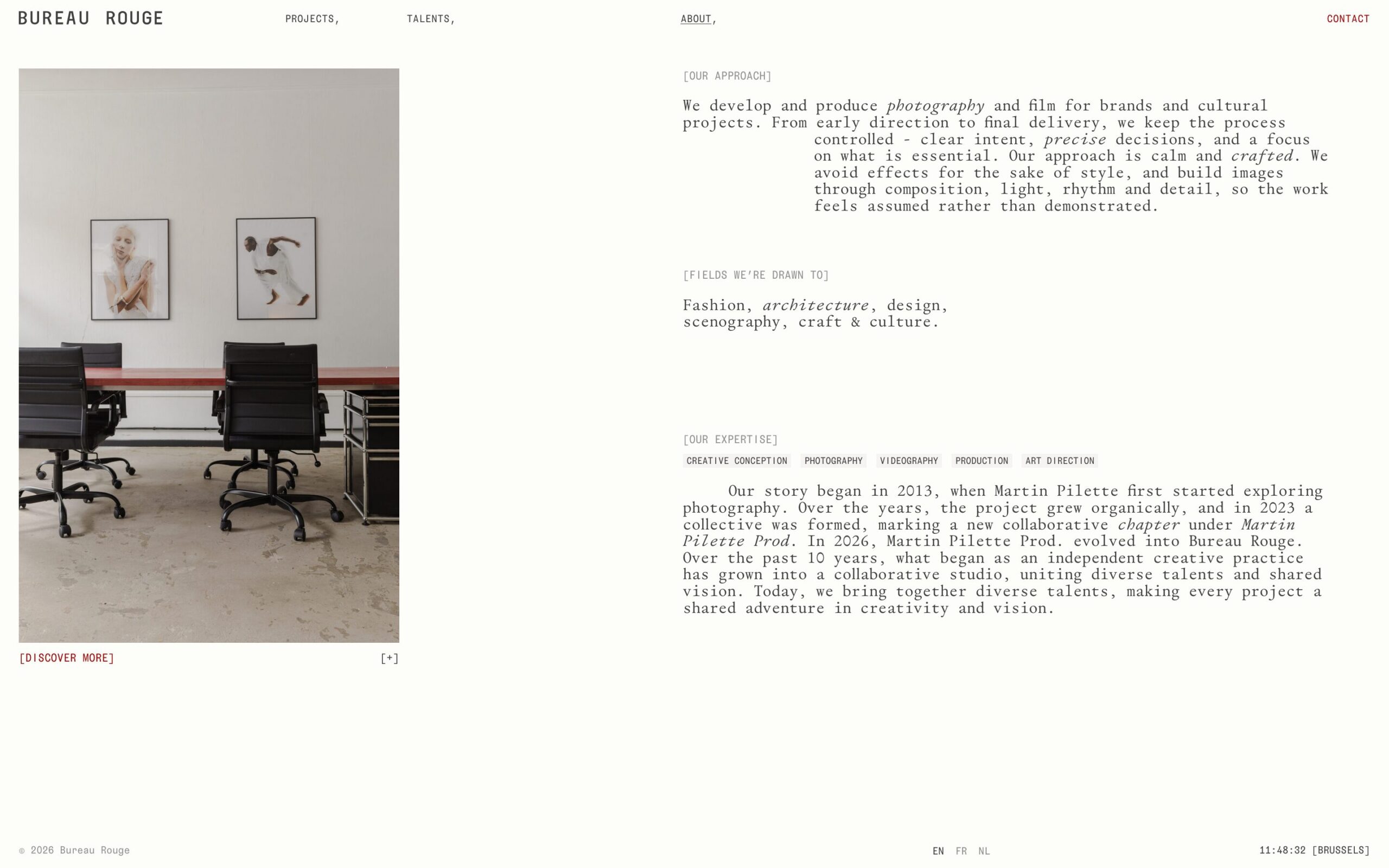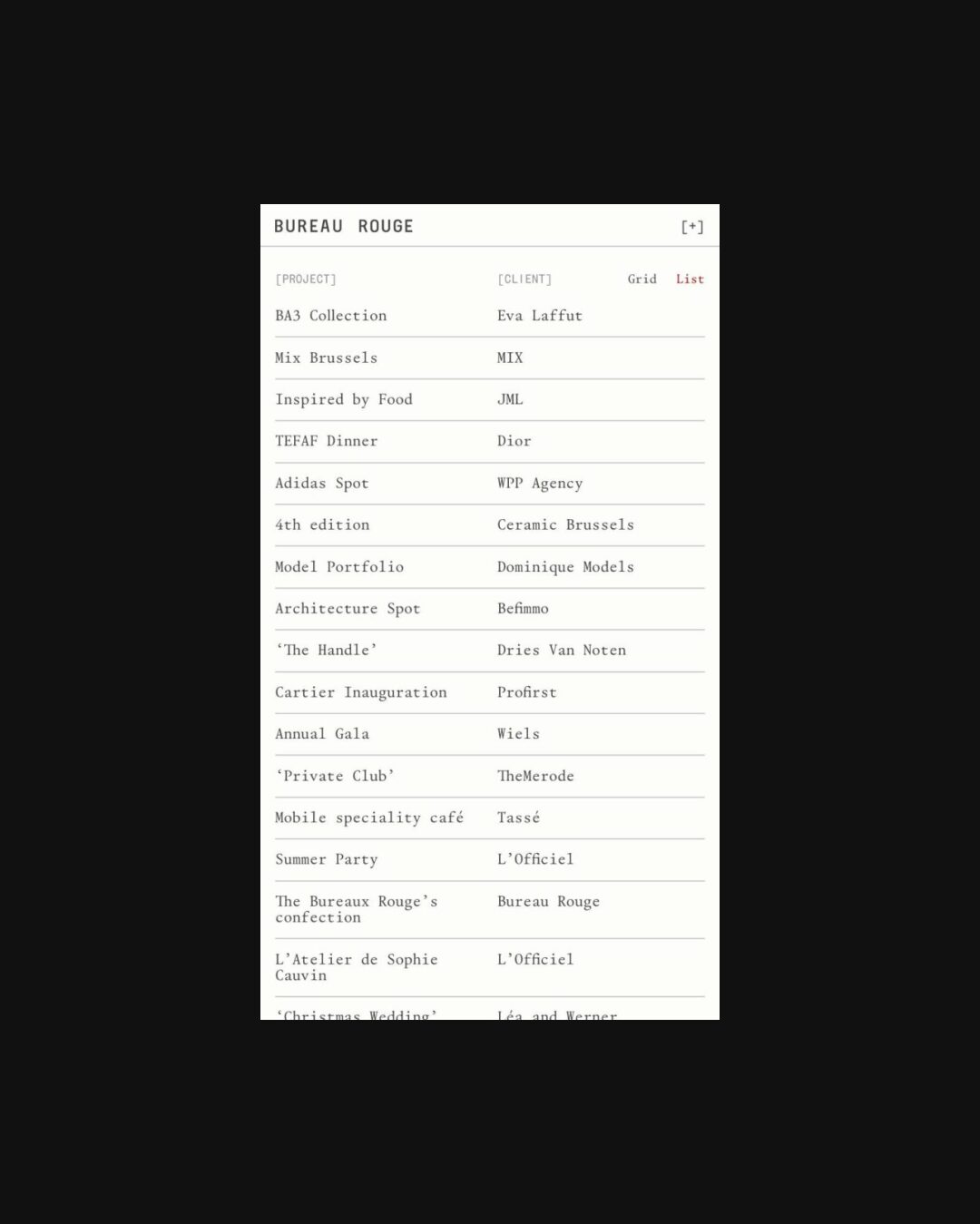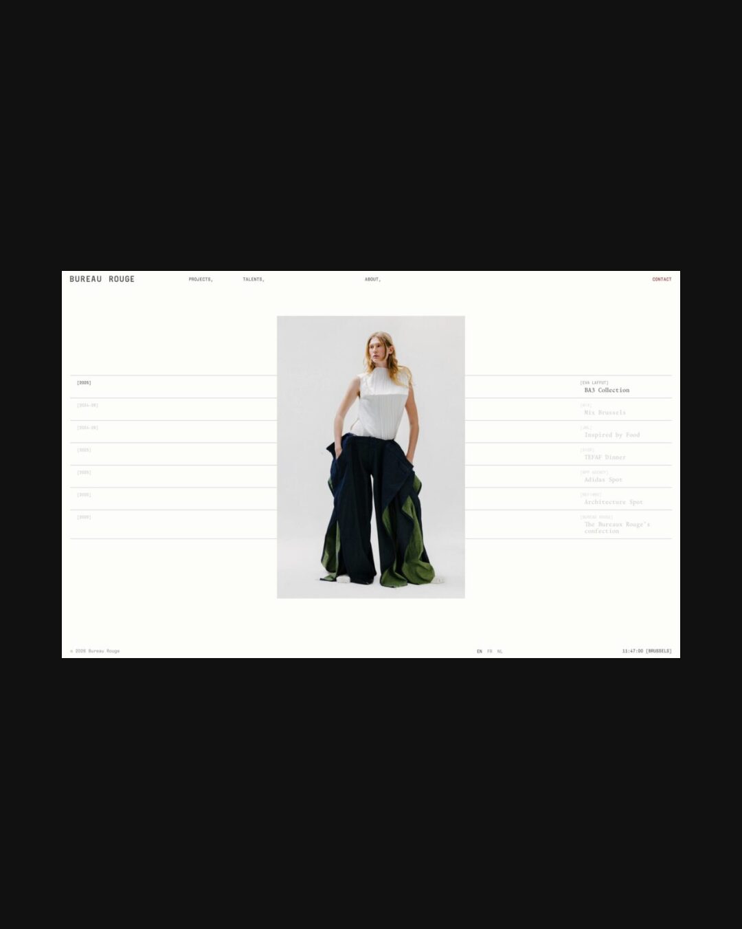 1332 bureaurouge.com Creative Studio, Bright, Clean, Grid, Large Scale, Layered, Light, List, Minimal, Mono Typeface, Simple, Small Typography, White Space, Black, Chocolate, Belgium. Design: Natalia Karczewska. Development: Theo Plawinski. (27-04-2026) ←Close
