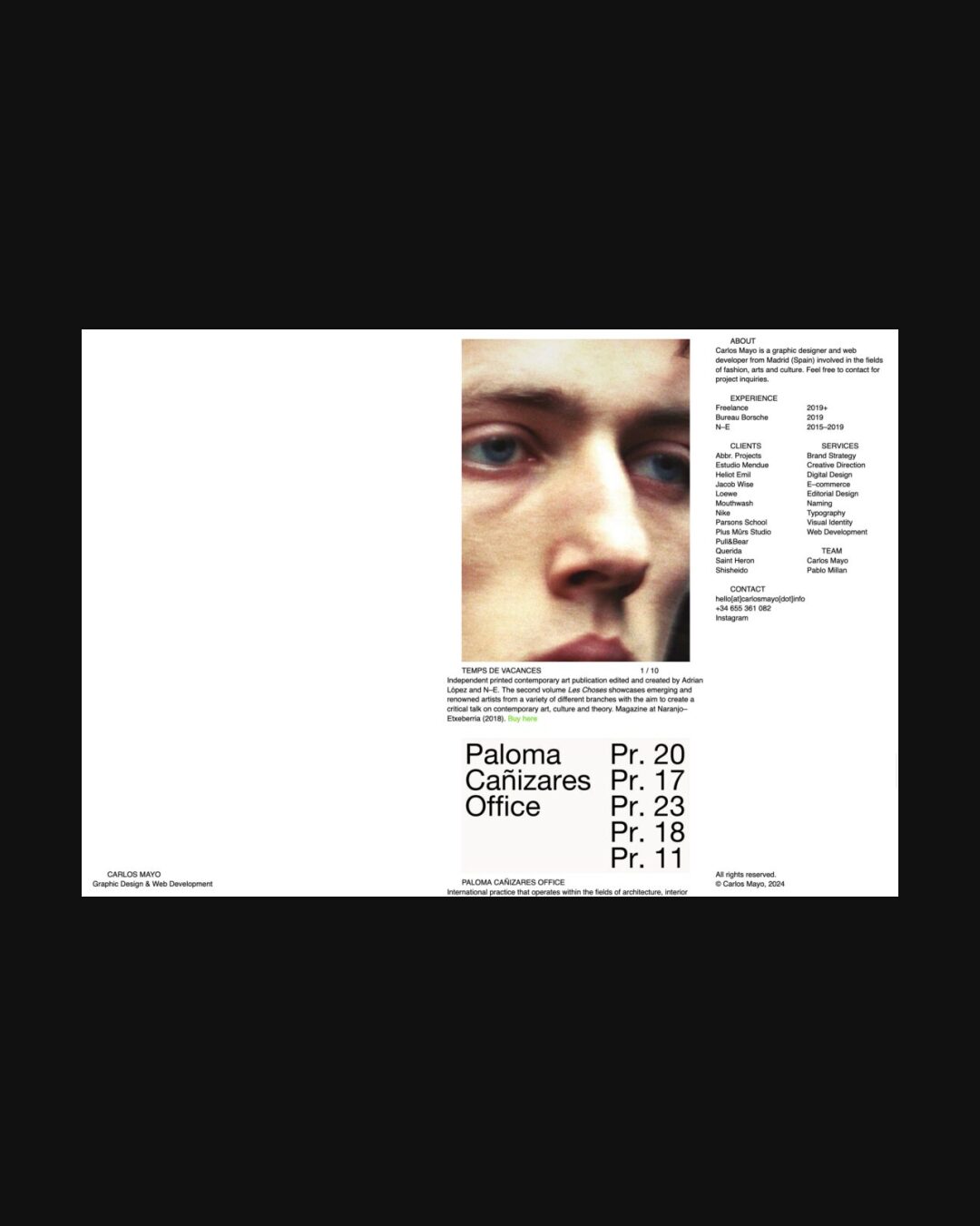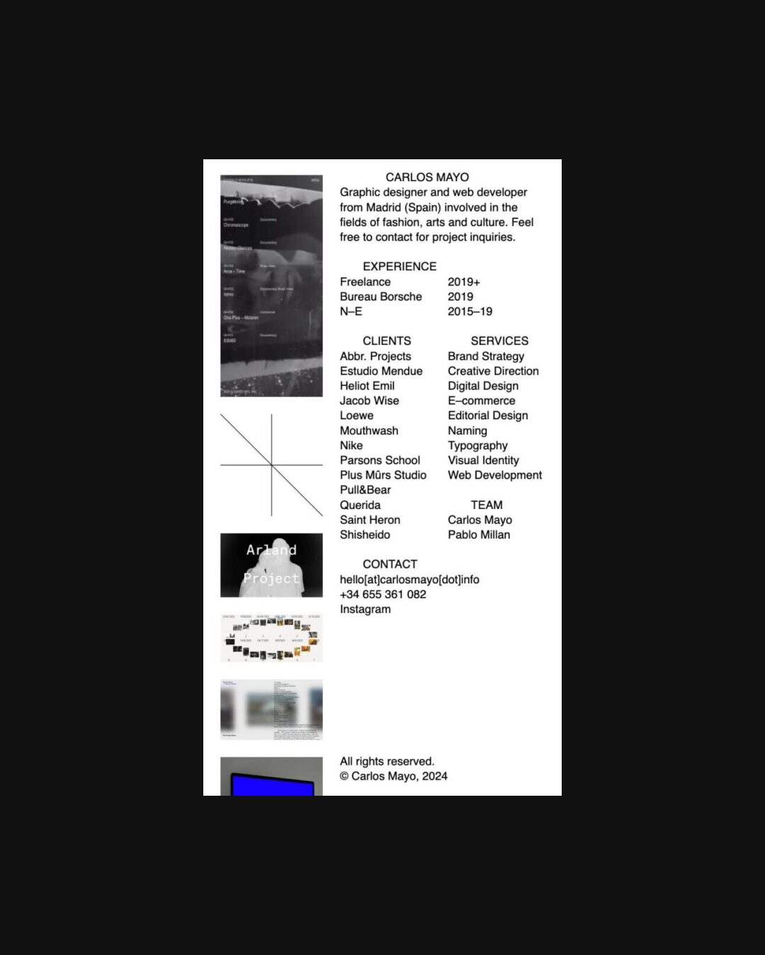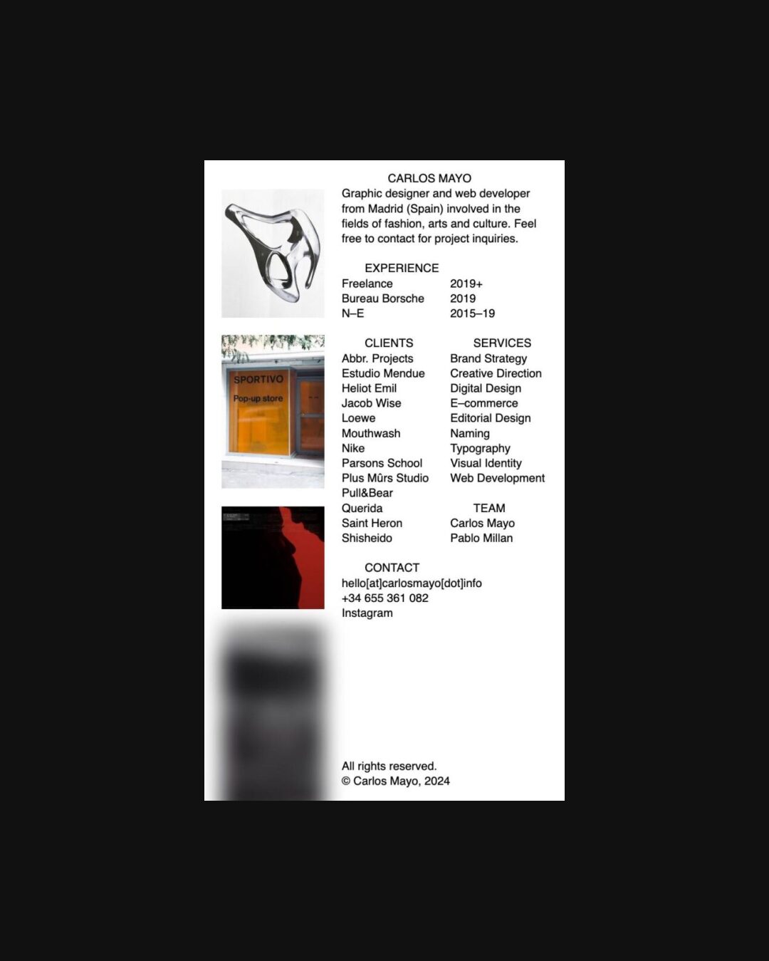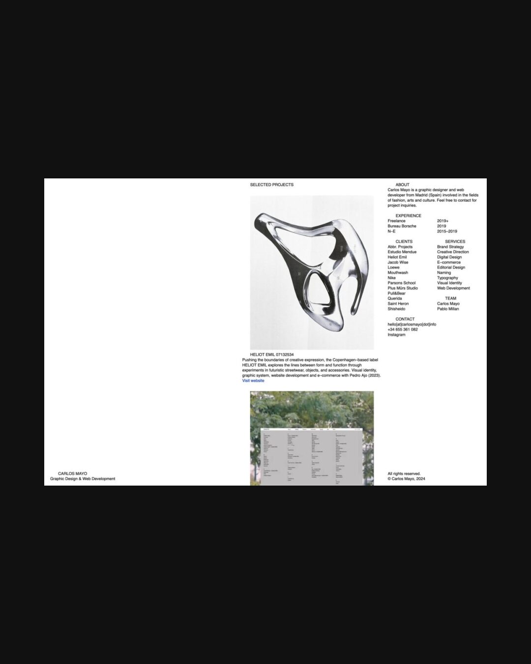 0837 carlosmayo.info Design, Brutalist, Grid, Light, Minimal, One Page, Scroll Events, Simple, Slider, Split Scroll, White Space, Silver, White, Spain. Design: Carlos Mayo. Development: Carlos Mayo. (14-03-2024) ←Close