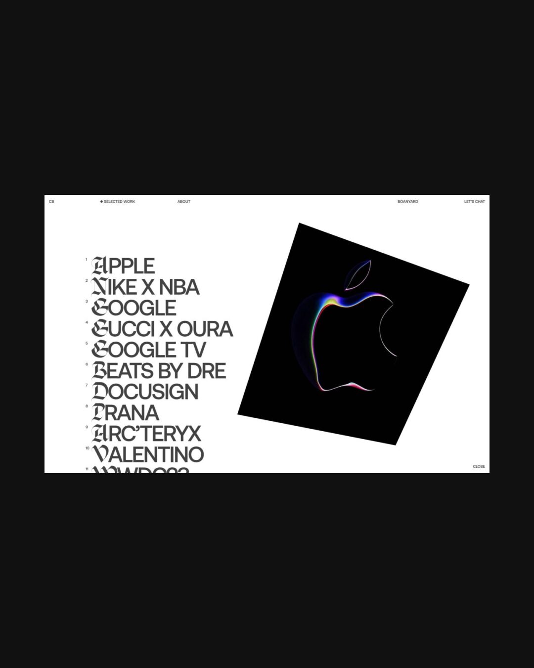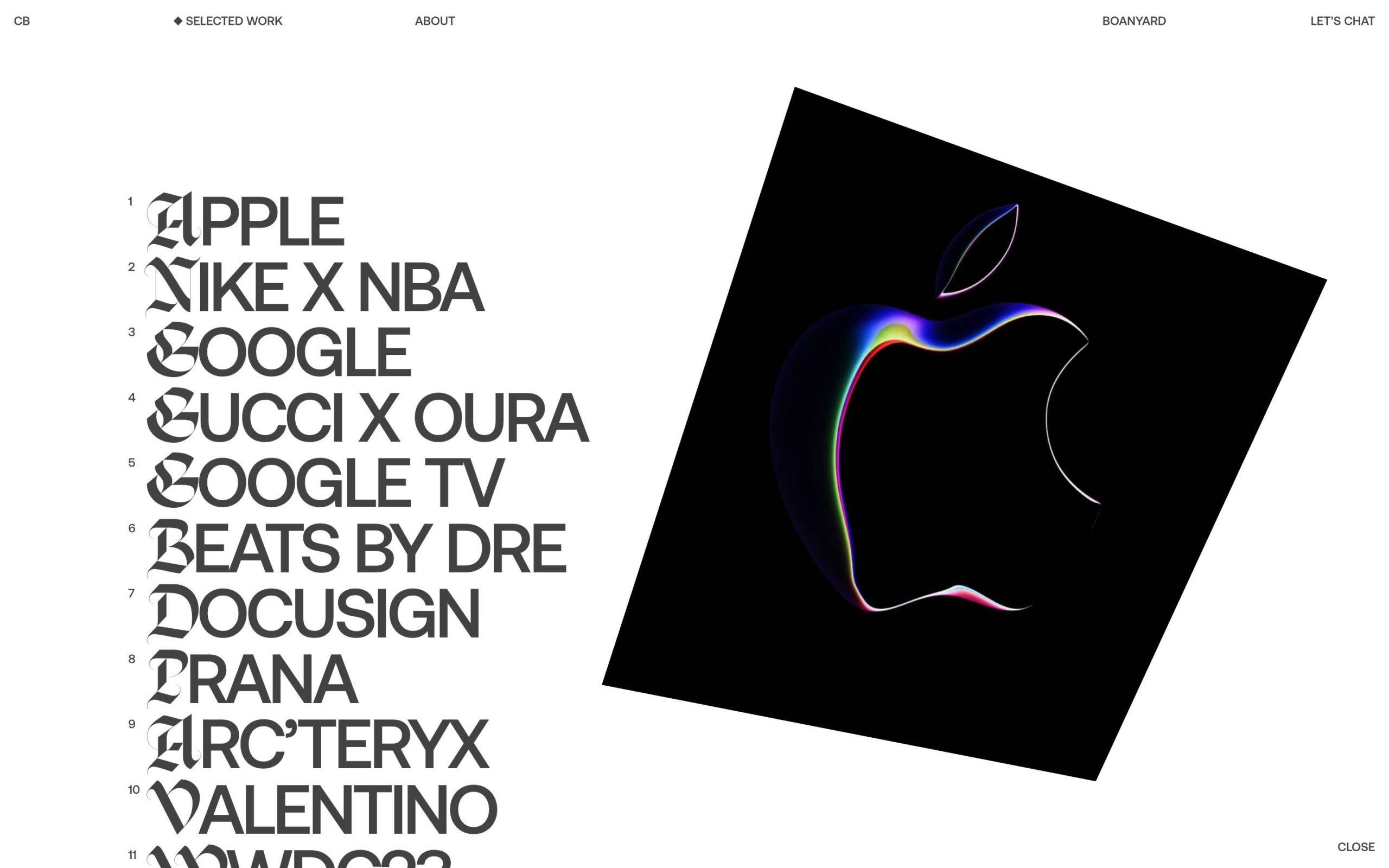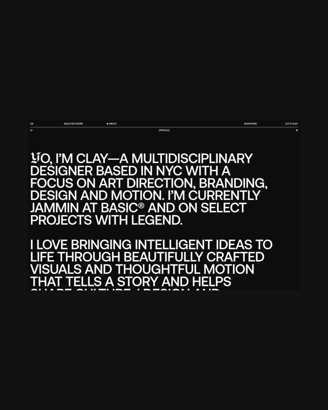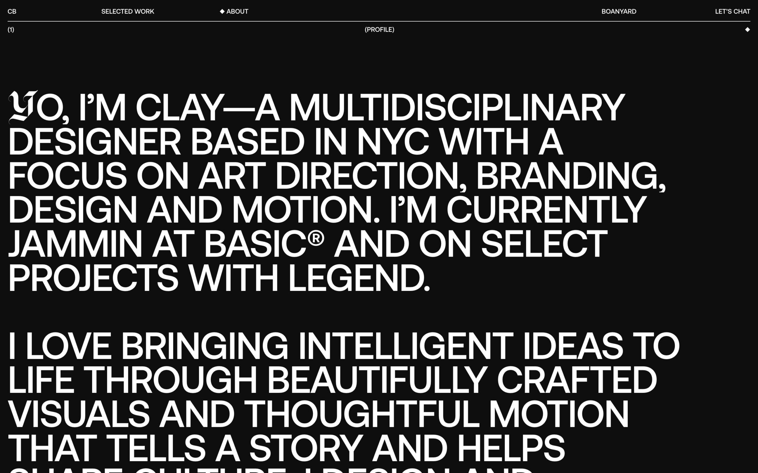 1344 clayboan.com Design, Animations, Big Title, Big Typography, Clean, Dark, Large Scale, Light, List, Mixed Style Typefaces, Scroll Position Animation, Technical, Uppercase, Video, White Space, Black, White, USA. Design: Clay Boan. Development: Rob Smittenaar, Ruud Luijten, Thomas Van Glabeke. (06-01-2026) ←Close