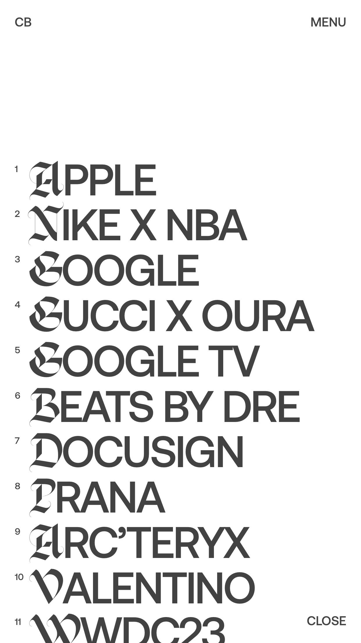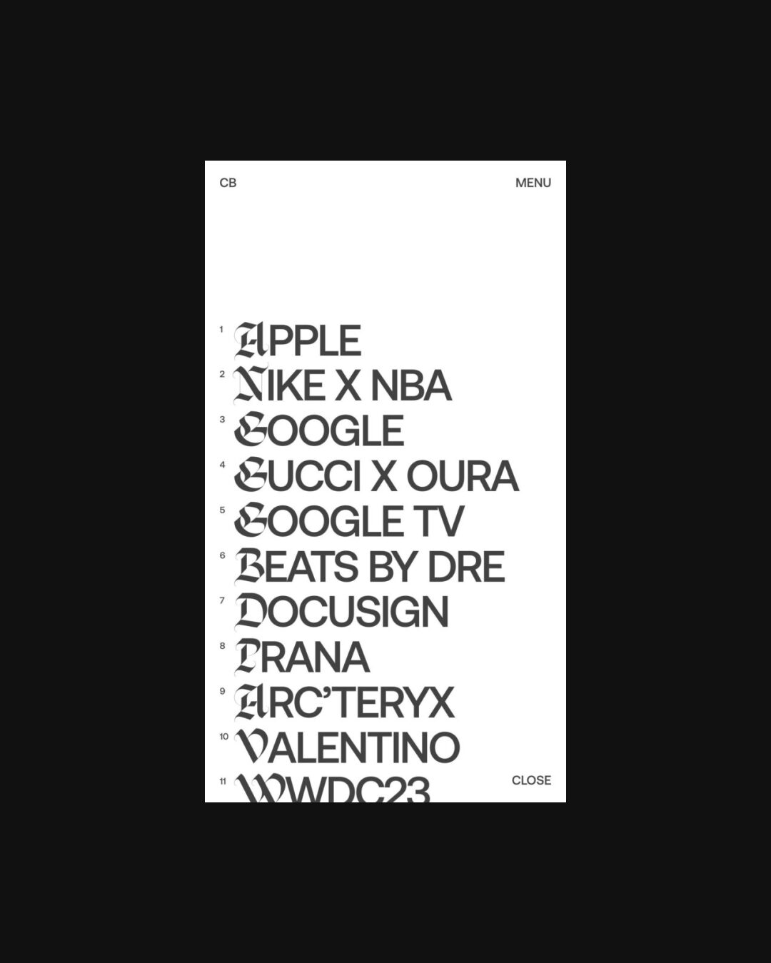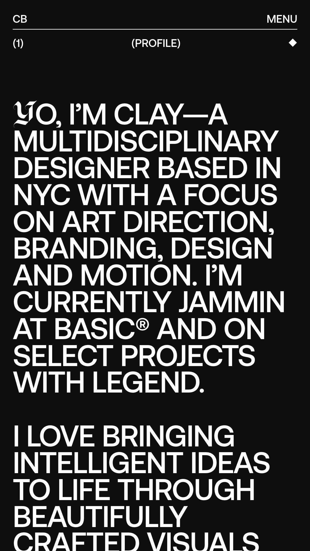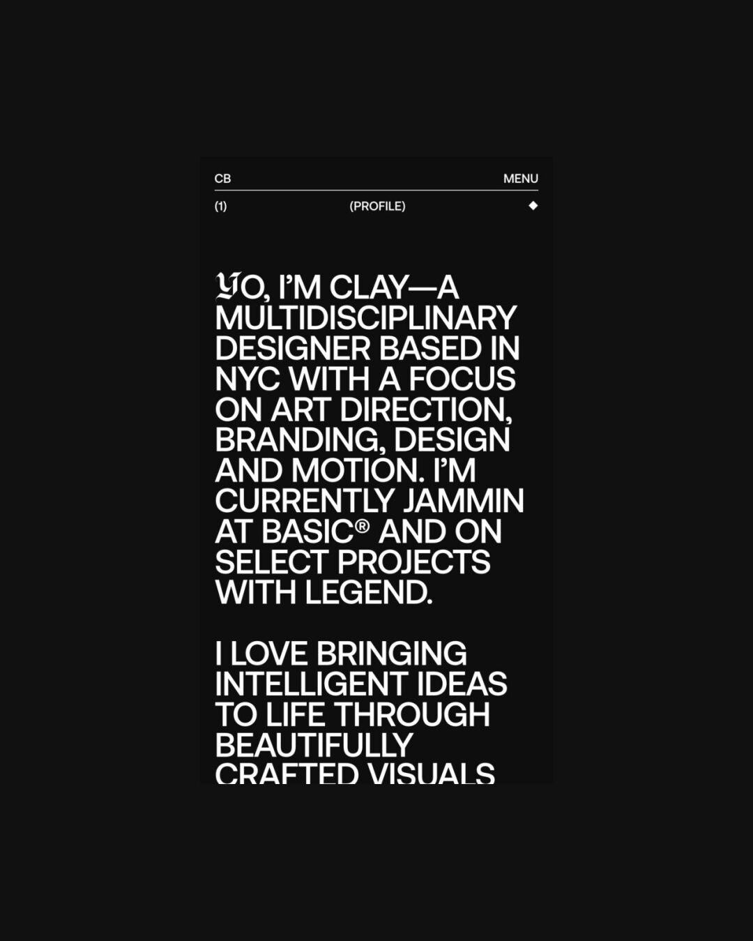 1344 clayboan.com Design, Animations, Big Title, Big Typography, Clean, Dark, Large Scale, Light, List, Mixed Style Typefaces, Scroll Position Animation, Technical, Uppercase, Video, White Space, Black, White, USA. Design: Clay Boan. Development: Rob Smittenaar, Ruud Luijten, Thomas Van Glabeke. (06-01-2026) ←Close