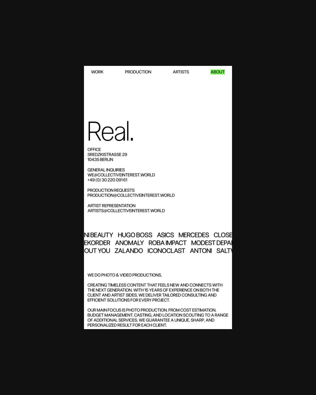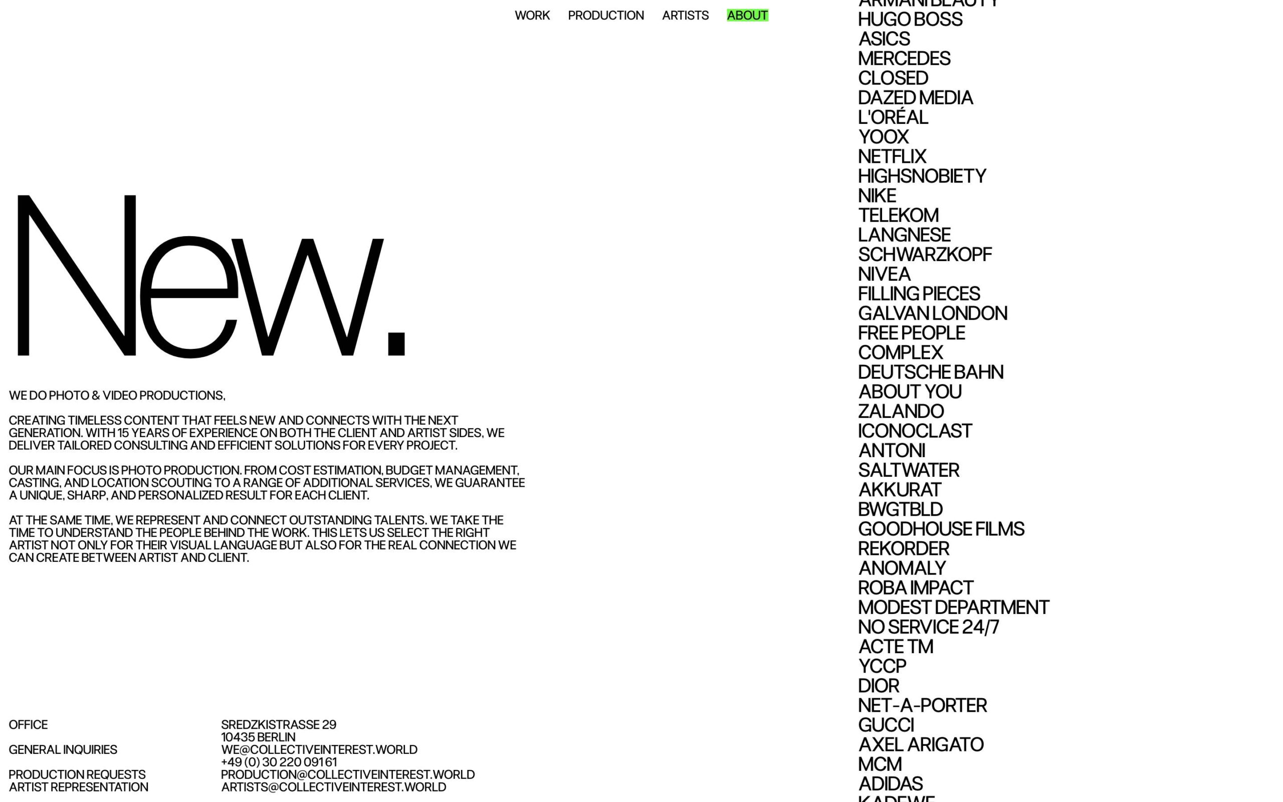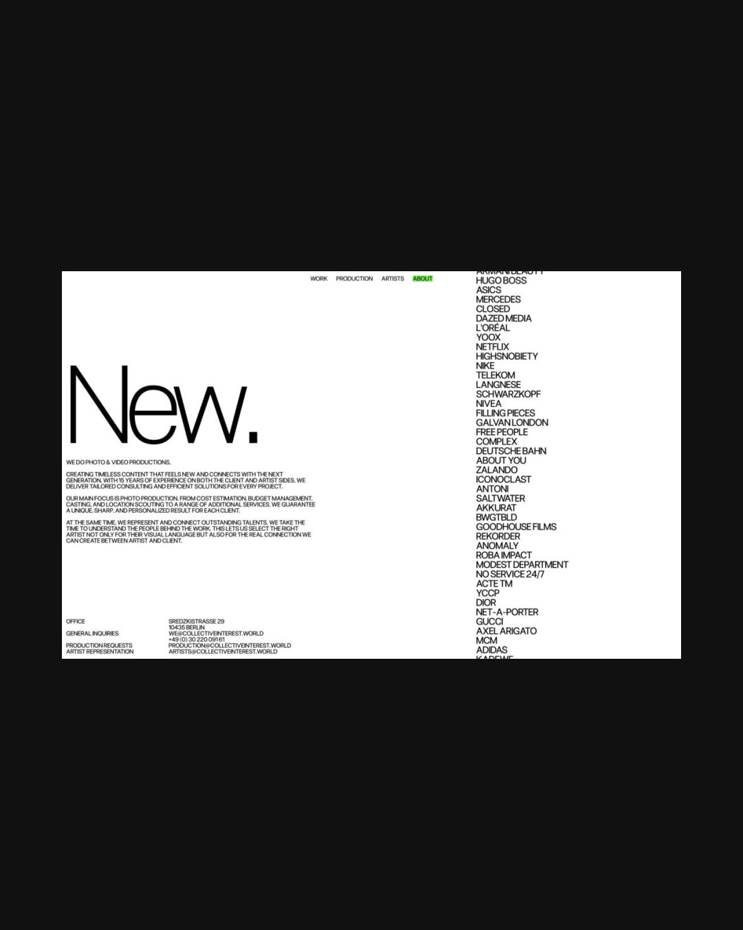 1343 collectiveinterest.de Production, Big Title, Bright, Brutalist, Grid, Large Scale, Light, List, Mixed Style Typefaces, Overlay Containers, Sans Serif Typeface, Video, White Space, Gray, White, Germany. Design: Studio Jacob Lindblad. Development: Dimitris Konstantinou, Sofia Zengu-Niewiadomska. (19-01-2026) ←Close