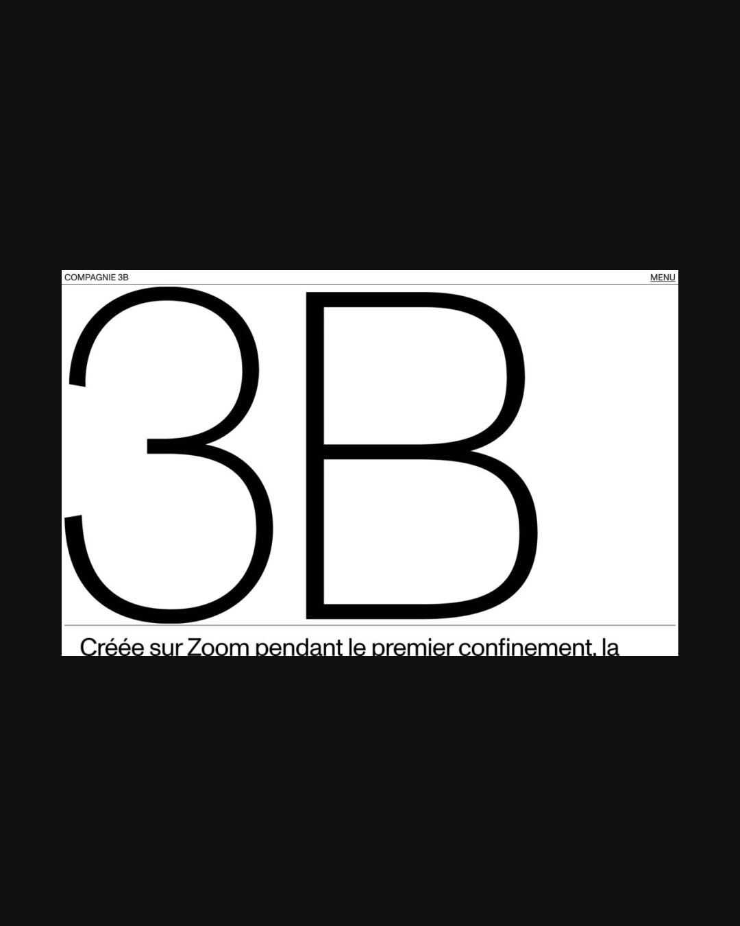 0957 compagnie3b.fr Performing Arts, Animations, Big Title, Big Typography, Brutalist, Clean, Large Scale, Light, Sans Serif Typeface, Black, White, France. Design: Florian Cornut, Habillage Graphique. Development: Florian Cornut, Habillage Graphique. (26-08-2024) ←Close