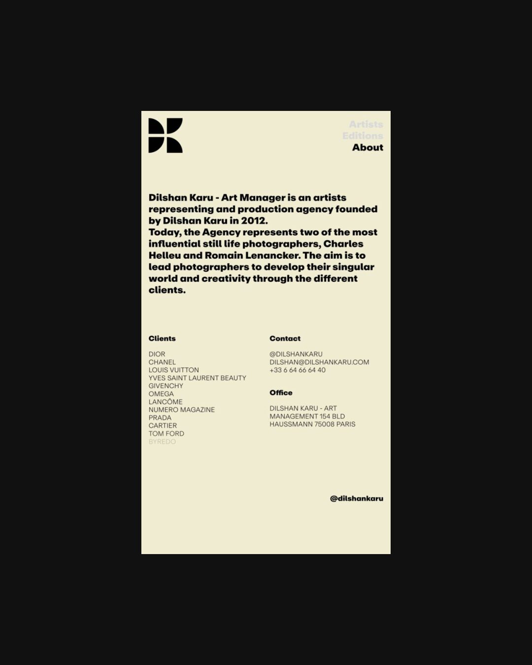 1254 dilshankaru.com Management, Bold, Bright, Clean, Grid, Hover Events, Large Scale, Layered, Light, Sans Serif Typeface, White Space, Black, White, France. Design: Laand Studio. Development: Roko Gabrilo. (25-09-2025) ←Close