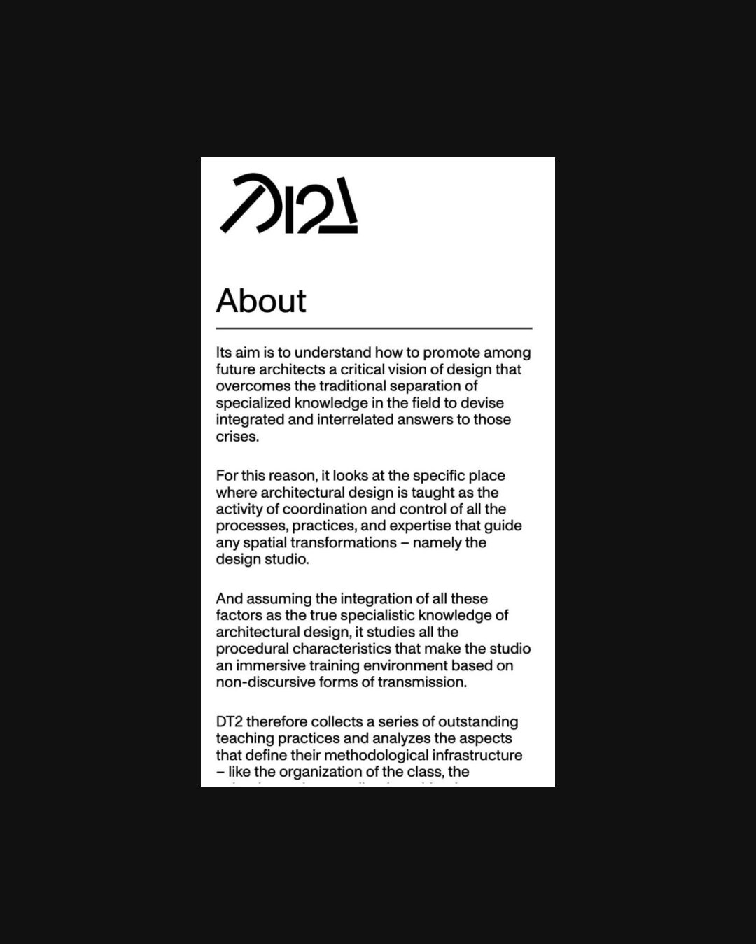 1174 dt2.polimi.it Education, Big Title, Big Typography, Black & White, Brutalist, Grid, International Style, Large Scale, Light, Minimal, Sans Serif Typeface, Simple, Text Only, White Space, Black, White, Italy. Design: Giorgia Florenzano, Studio Óbelo. Development: Carlo Schlatter. (12-06-2025) ←Close