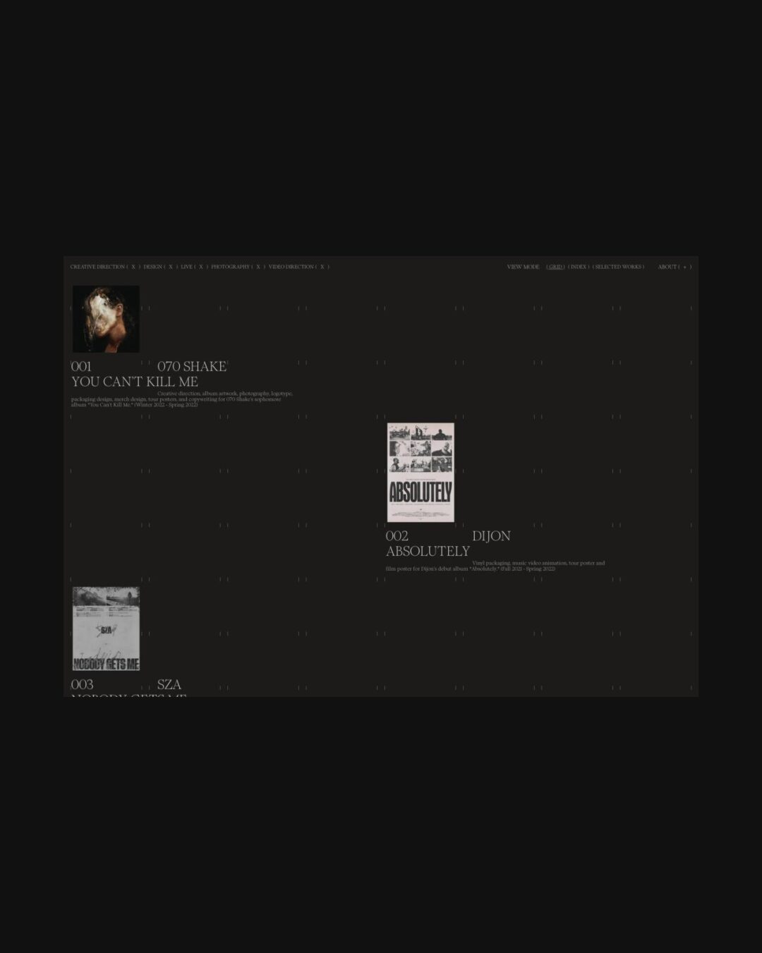 #3D #Animations #Ascii #Asymmetrical Grid #Audio #Bauhaus #Big Images #Big Title #Big Typography #Black & White #Blocks #Blur #Bold #Bright #Brutalist #Buttons #Camera Tracking #Clean #Collage #Collapsing containers #Colorful #Creative Layout #Cursor Follow #Custom Cursor #Custom Scroll #Dadaist #Dark #Draggable Elements #Duo-tone #E-commerce #Editorial #Forms #Gradient #Grainy #Gray #Grid #Gritty #Halftone #Holding Page #Horizontal Scroll #Hover Events #Illustrations #International Style #Large Scale #Layered #Light #List #Lo-FI #Map #Marquee #Mini Site #Minimal #Mixed Style Typefaces #Mode Switch #Mono Typeface #Monotone #Multicolor #Newspaper #One Page #Overlay Containers #Page Transitions #Parallax #Playful #ppercase #Retro #Rotated Text #Sans Serif Typeface #Scaling #Scroll Events #Scroll Position Animation #Serif Typeface #Shapes #Simple #Slider #Small Typography #Split Scroll #Sticky Elements #Stretched Text #Table #Technical #Technologic #Text Highlight #Text Only #Thin #Typographic #Uppercase #Variable Title #Vertical Text #Video #White Space #Y Scroll