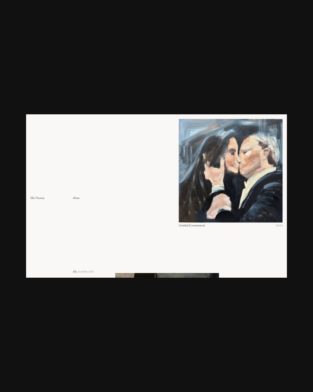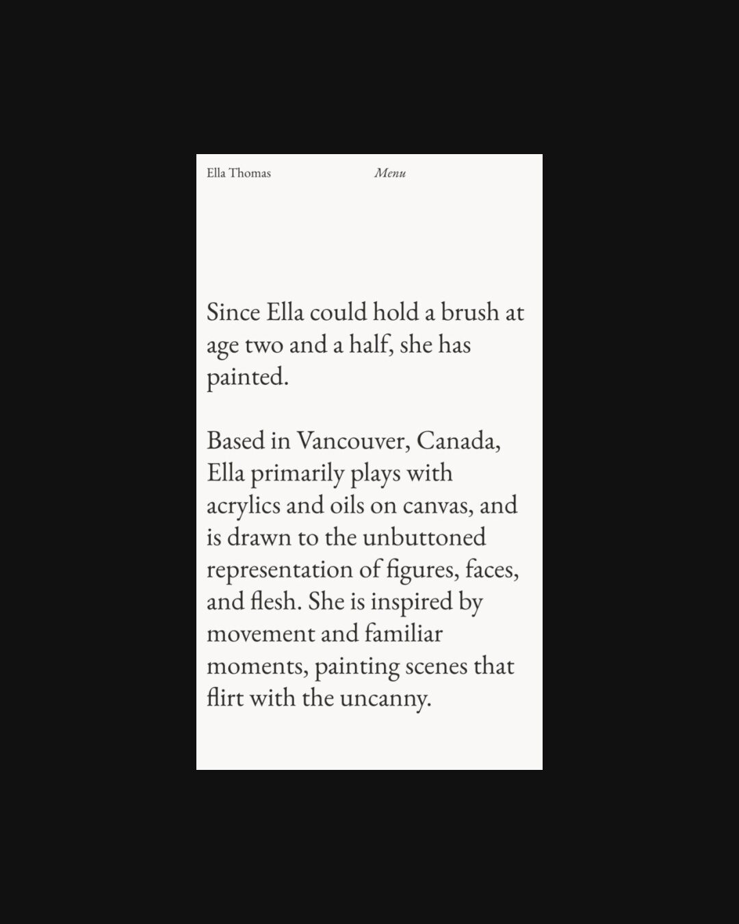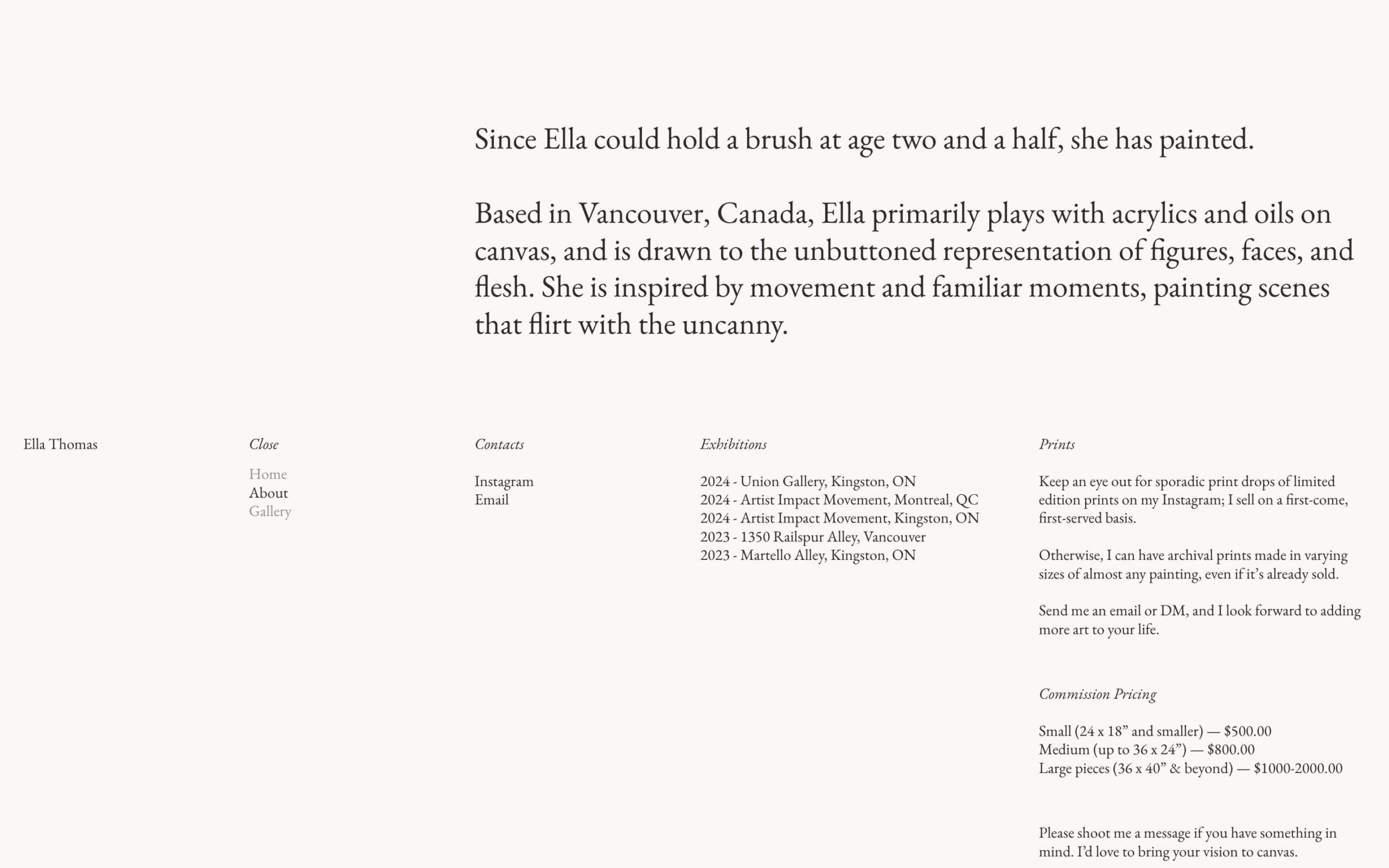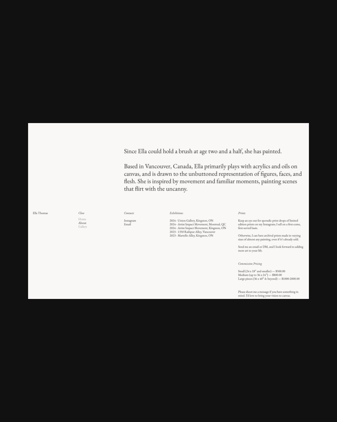1213 ellaethomas.com Art, Bright, Clean, Large Scale, Light, Minimal, Serif Typeface, Simple, Slider, White Space, Black, White, Canada. Design: Roko Gabrilo. Development: Roko Gabrilo. (17-11-2025) ←Close