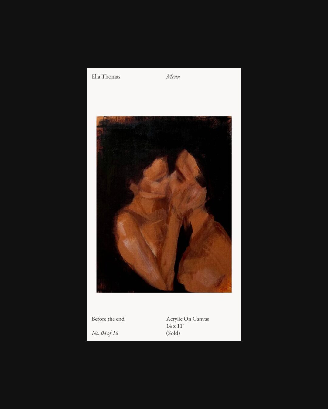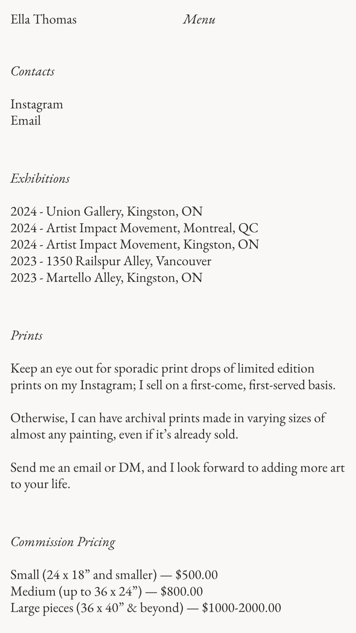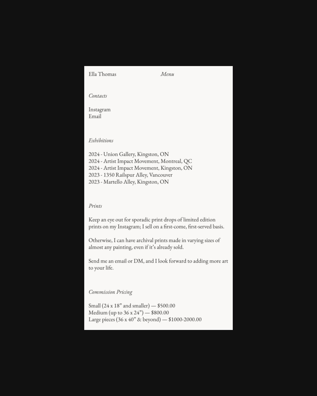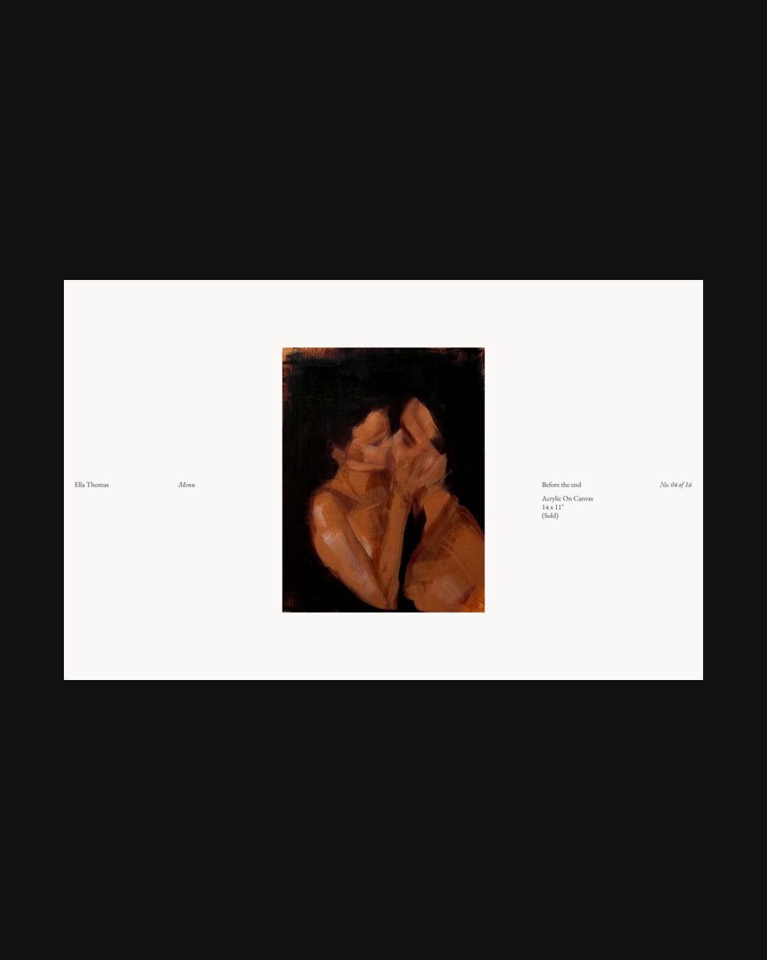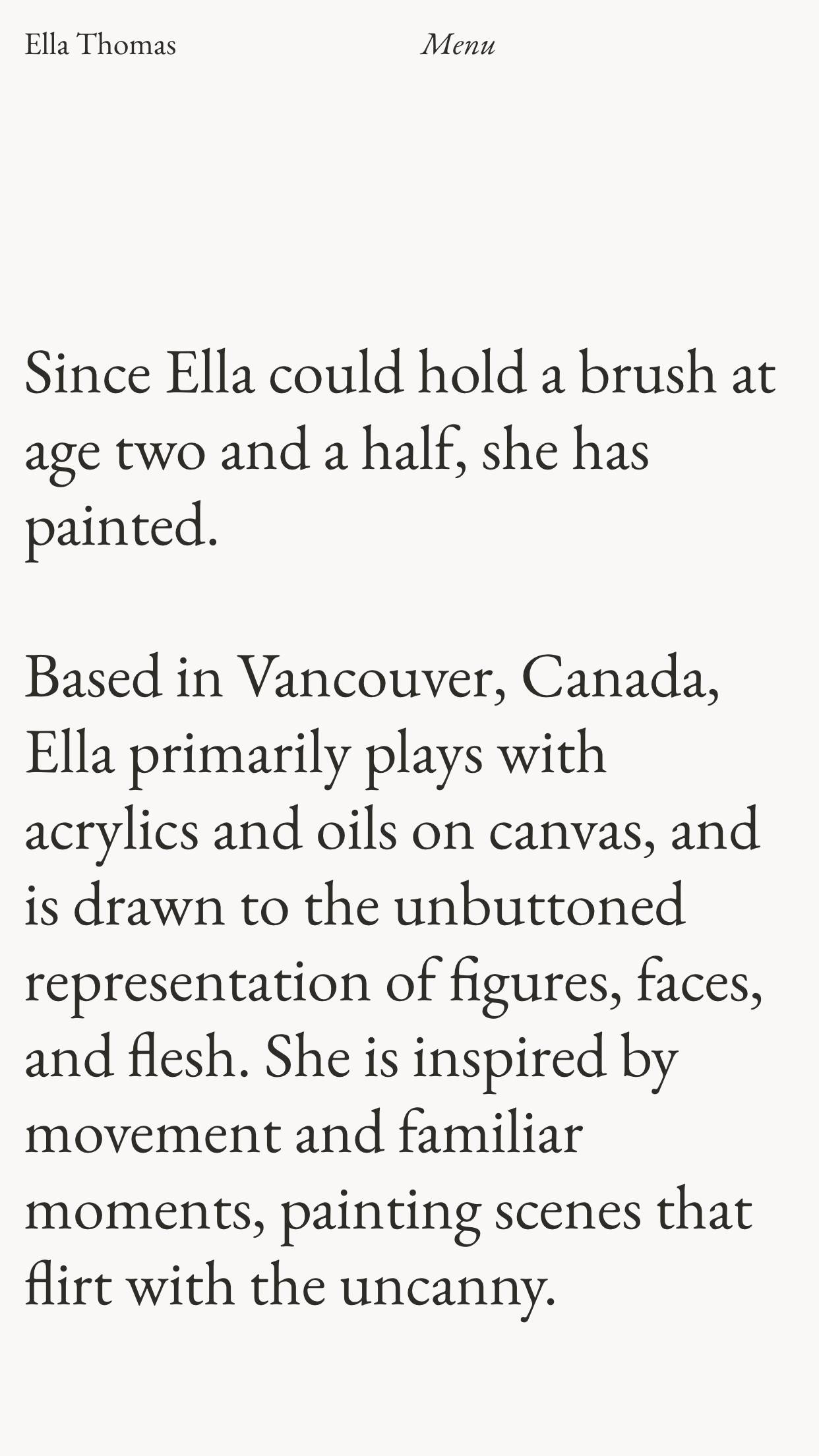 1213 ellaethomas.com Art, Bright, Clean, Large Scale, Light, Minimal, Serif Typeface, Simple, Slider, White Space, Black, White, Canada. Design: Roko Gabrilo. Development: Roko Gabrilo. (17-11-2025) ←Close