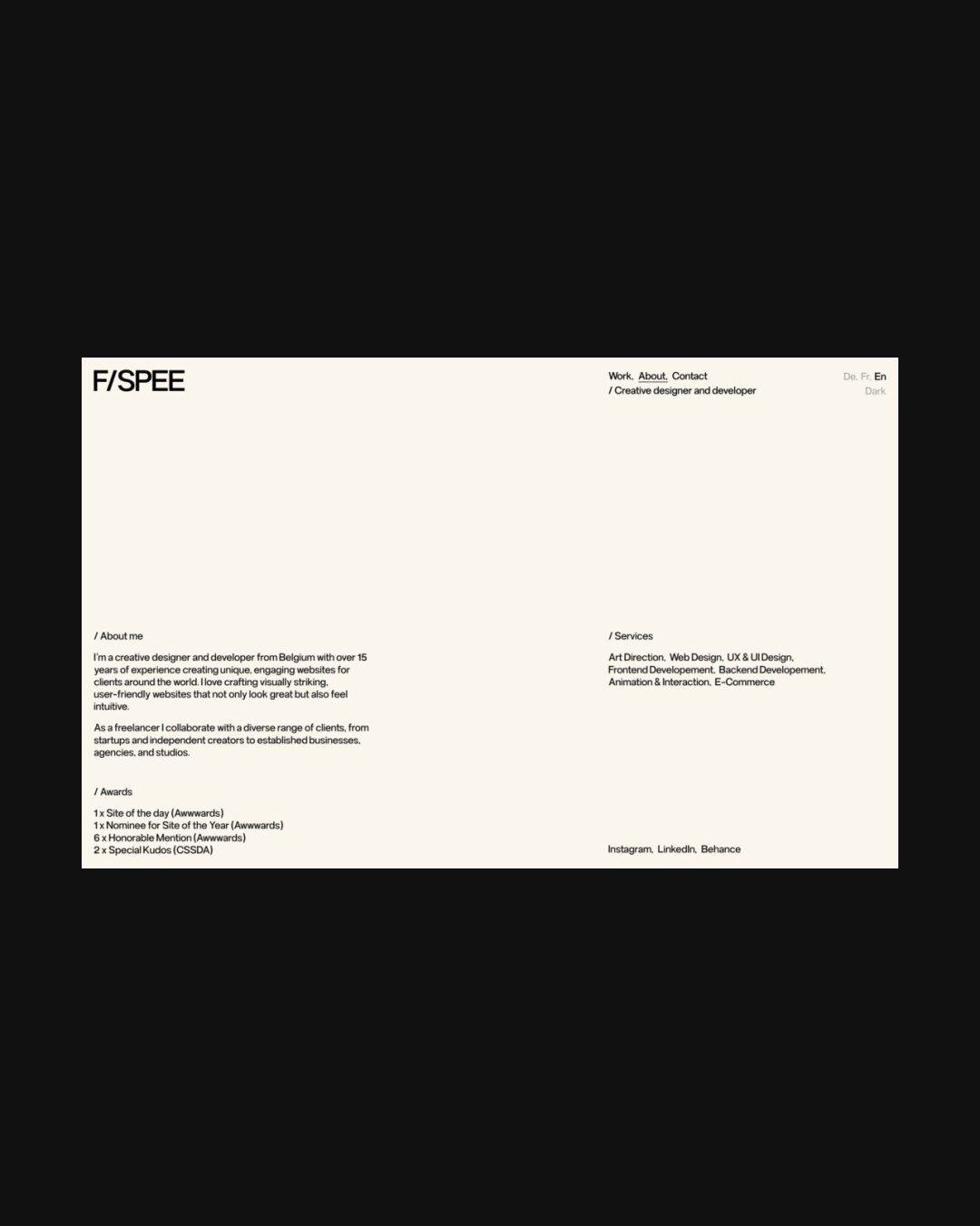 1267 fspee.com Design, Animations, Big Title, Bold, Bright, Clean, Custom Scroll, Light, Sans Serif Typeface, Scroll Events, Video, White Space, Black, White, Belgium. Design: F/SPEE. Development: F/SPEE. (26-09-2025) ←Close
