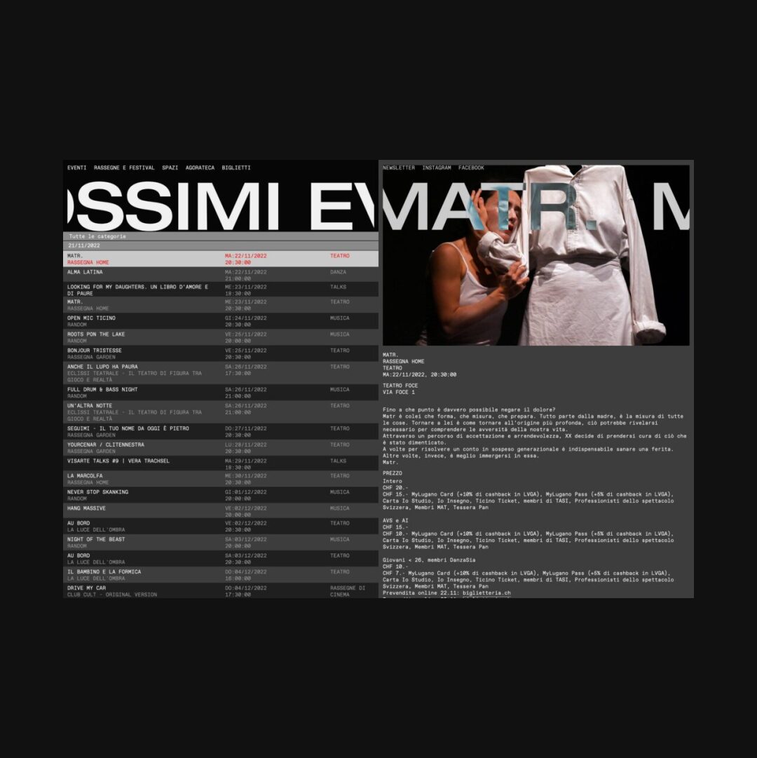 0541 foce.ch Theatre, Big Title, Brutalist, Creative Layout, Dark, Large Scale, Marquee, Typographic, Black, Gray, Switzerland. Design: Leonardo Angelucci, Sabrina Cerea. Development: Leonardo Angelucci, Sabrina Cerea. (21-11-2022) ←Close