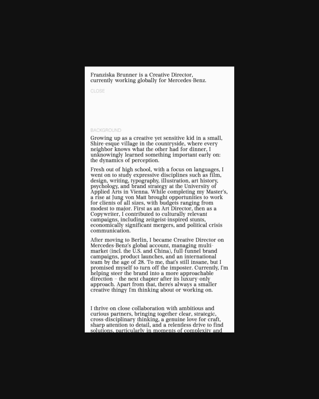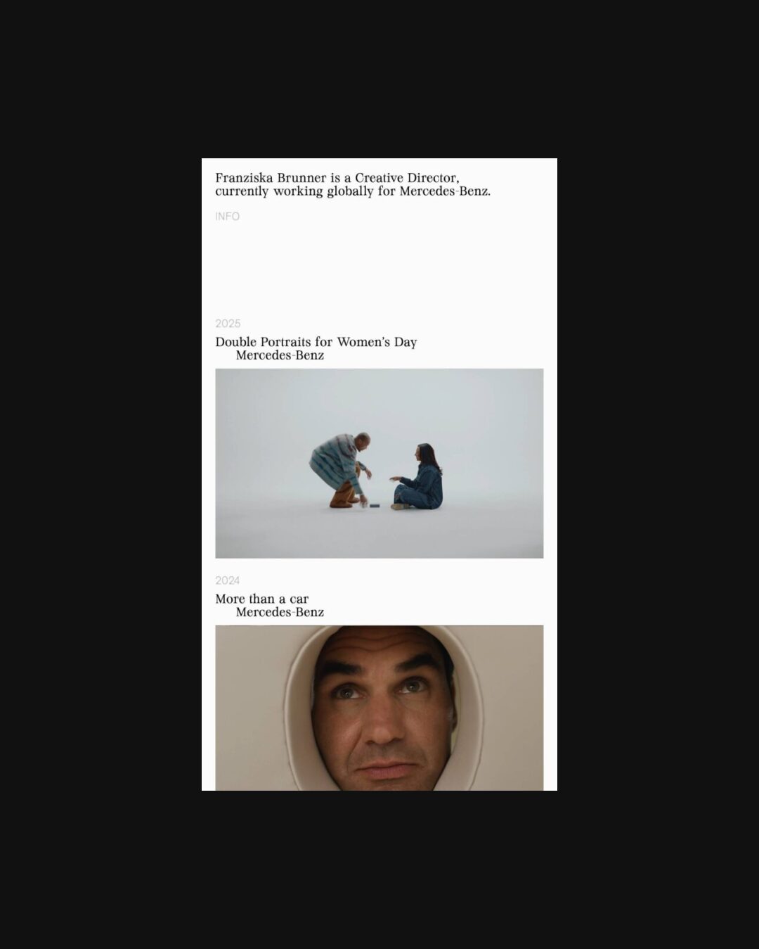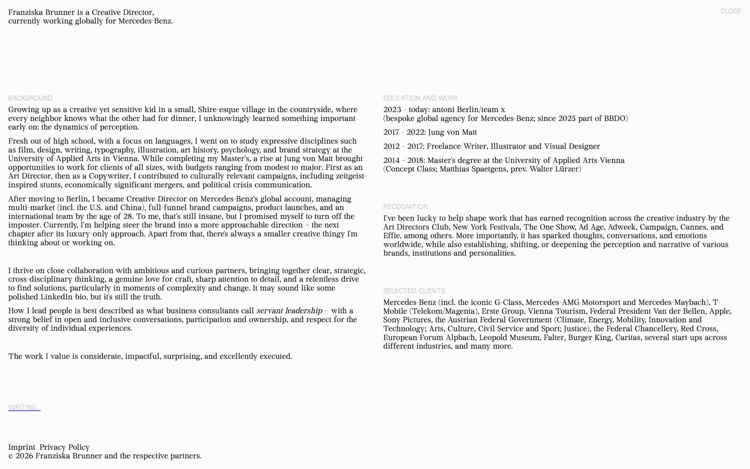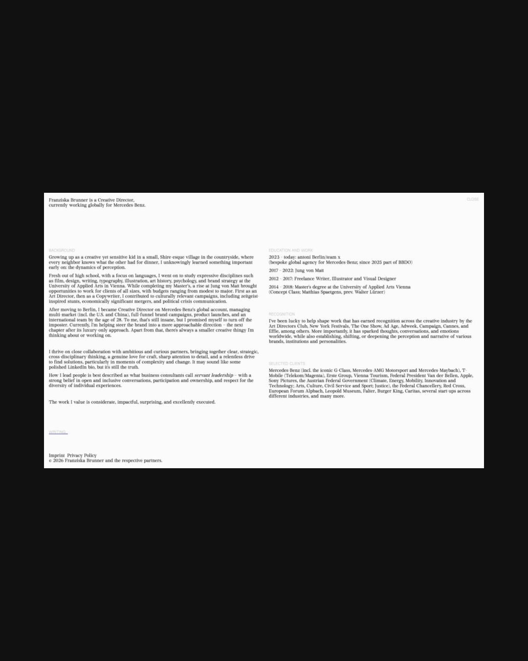 1349 franziskabrunner.com Creative Director, Big Title, Big Typography, Bright, Clean, Editorial, Grid, Large Scale, Light, Minimal, Mixed Style Typefaces, Page Transitions, Serif Typeface, Simple, Slider, Technical, Typographic, Video, White Space, Silver, White, Germany. Design: Aldo Heubel. Development: Aldo Heubel. (28-01-2026) ←Close