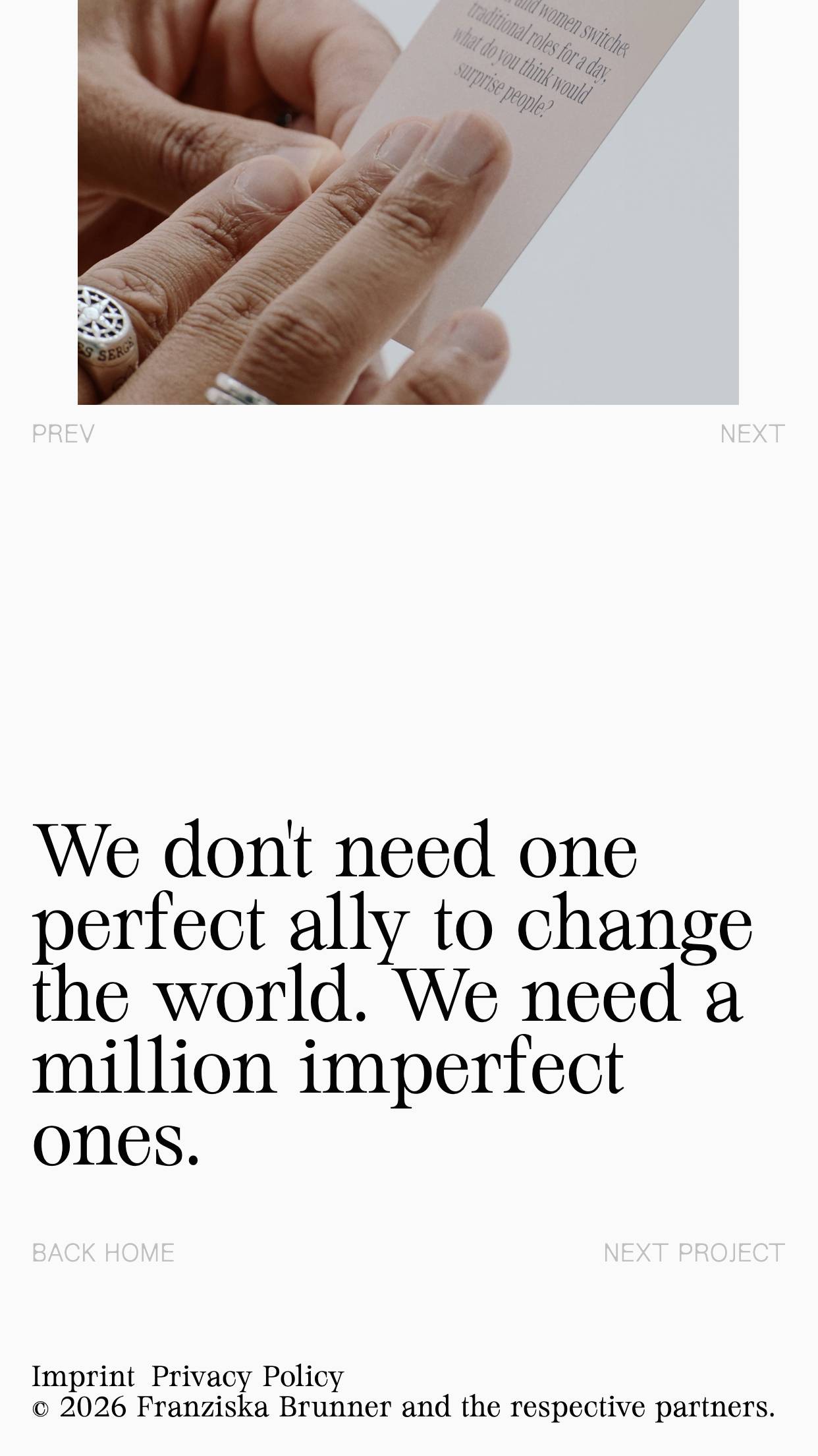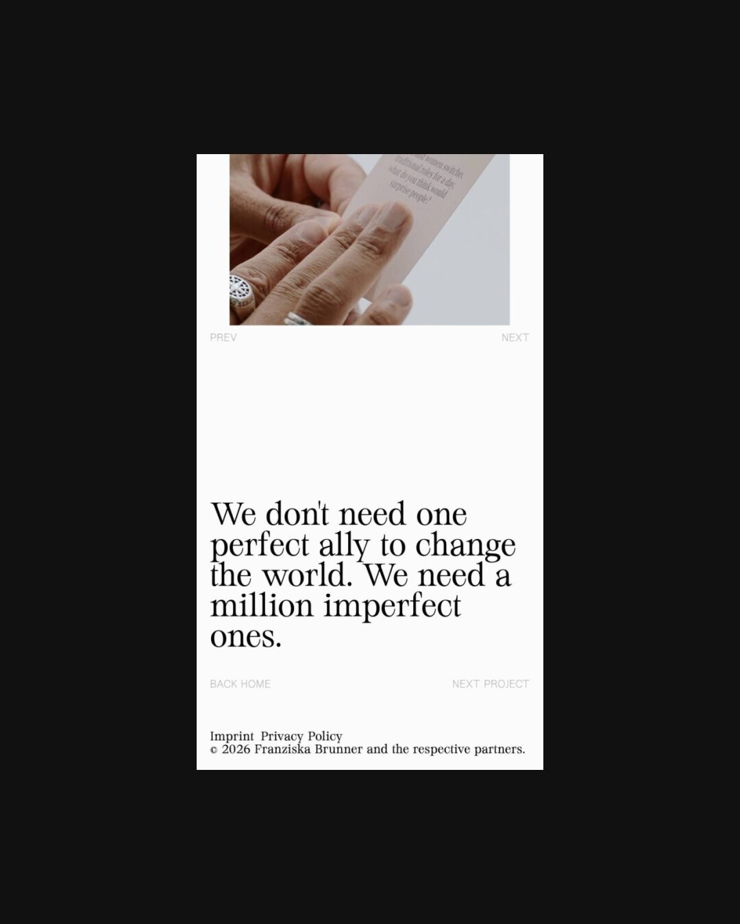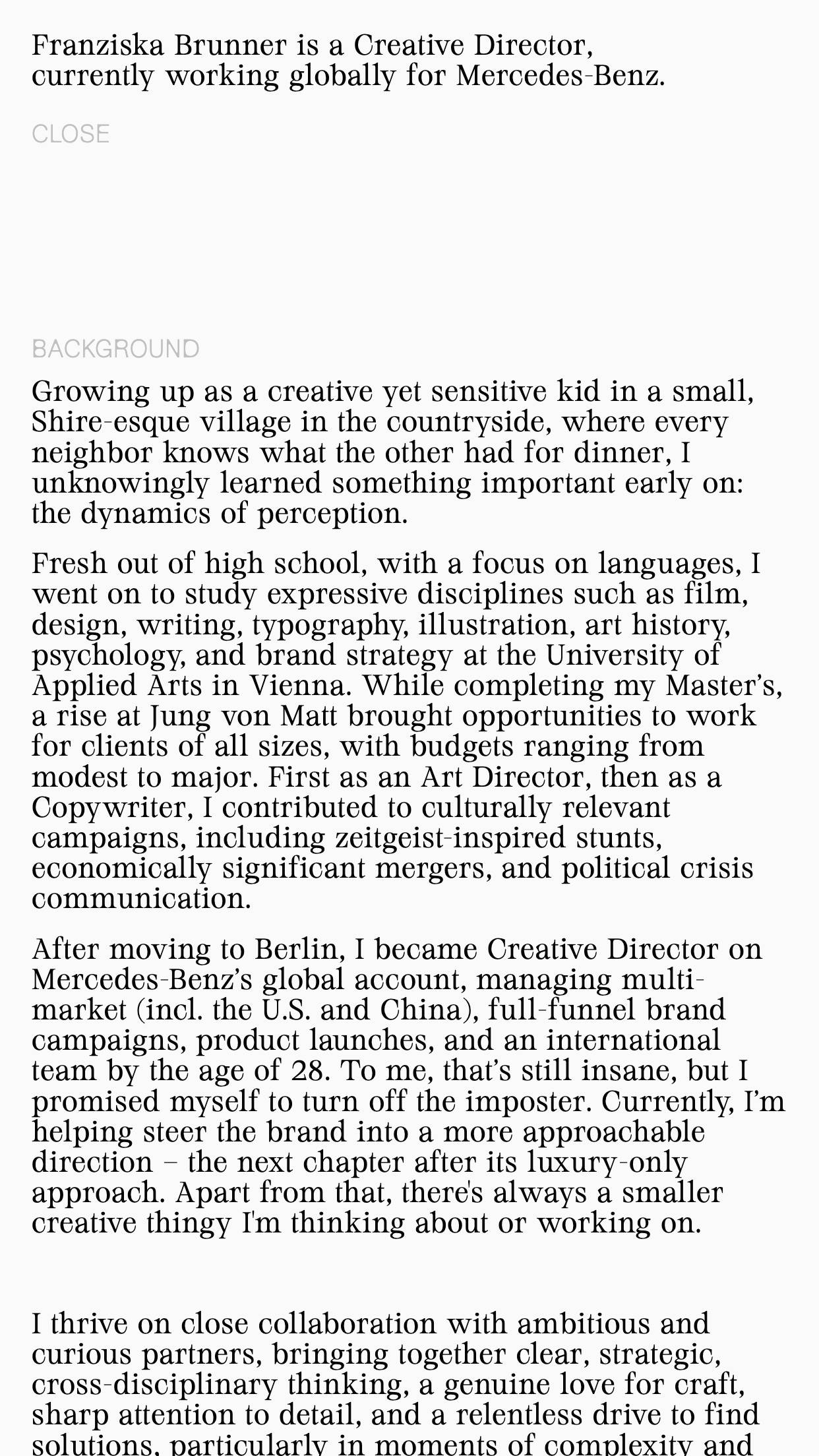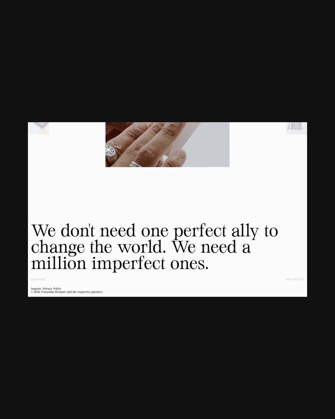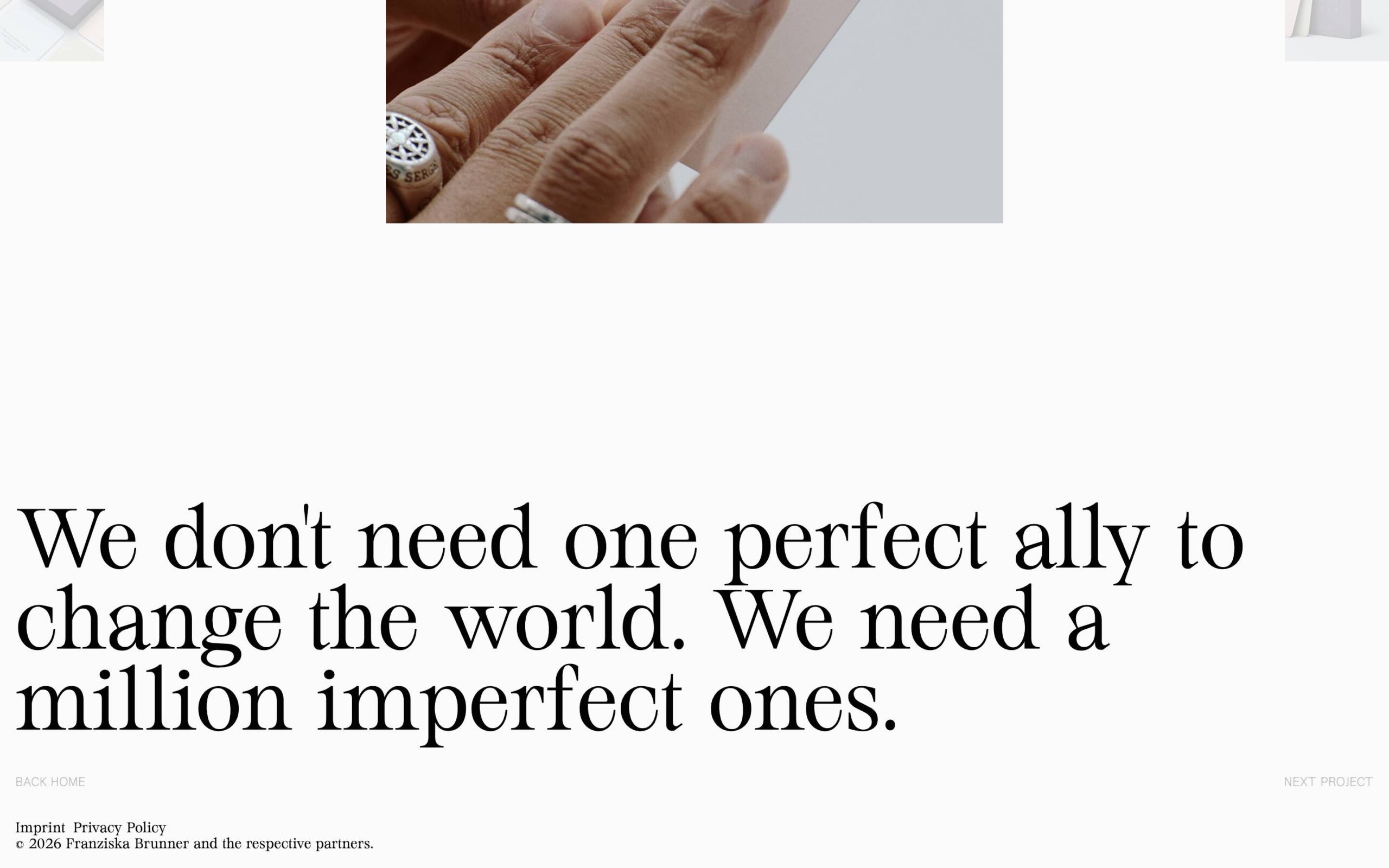 1349 franziskabrunner.com Creative Director, Big Title, Big Typography, Bright, Clean, Editorial, Grid, Large Scale, Light, Minimal, Mixed Style Typefaces, Page Transitions, Serif Typeface, Simple, Slider, Technical, Typographic, Video, White Space, Silver, White, Germany. Design: Aldo Heubel. Development: Aldo Heubel. (28-01-2026) ←Close