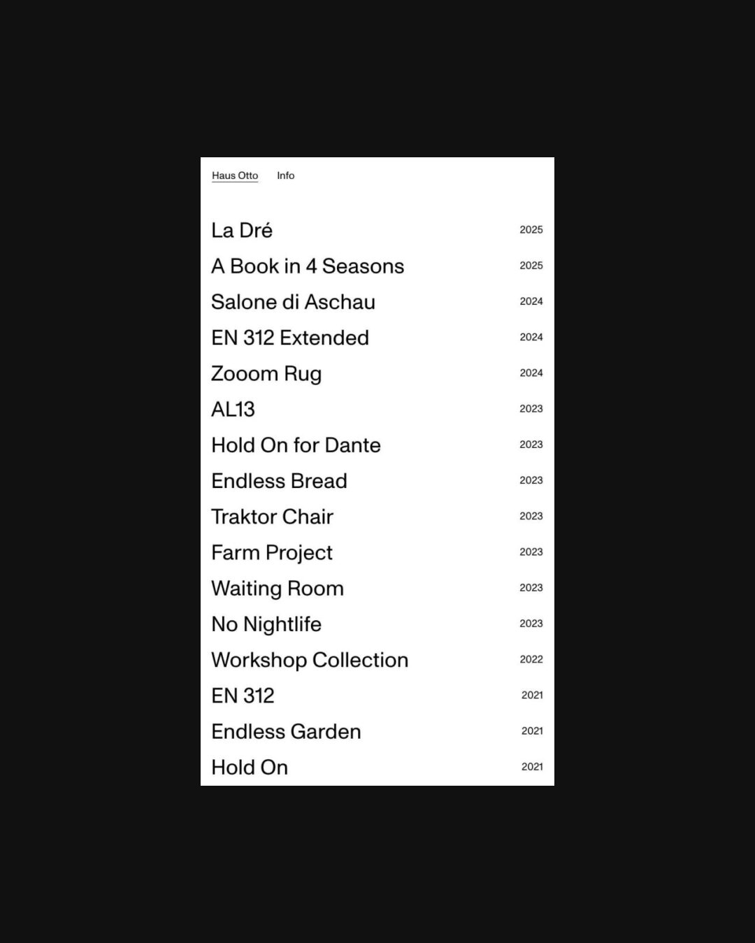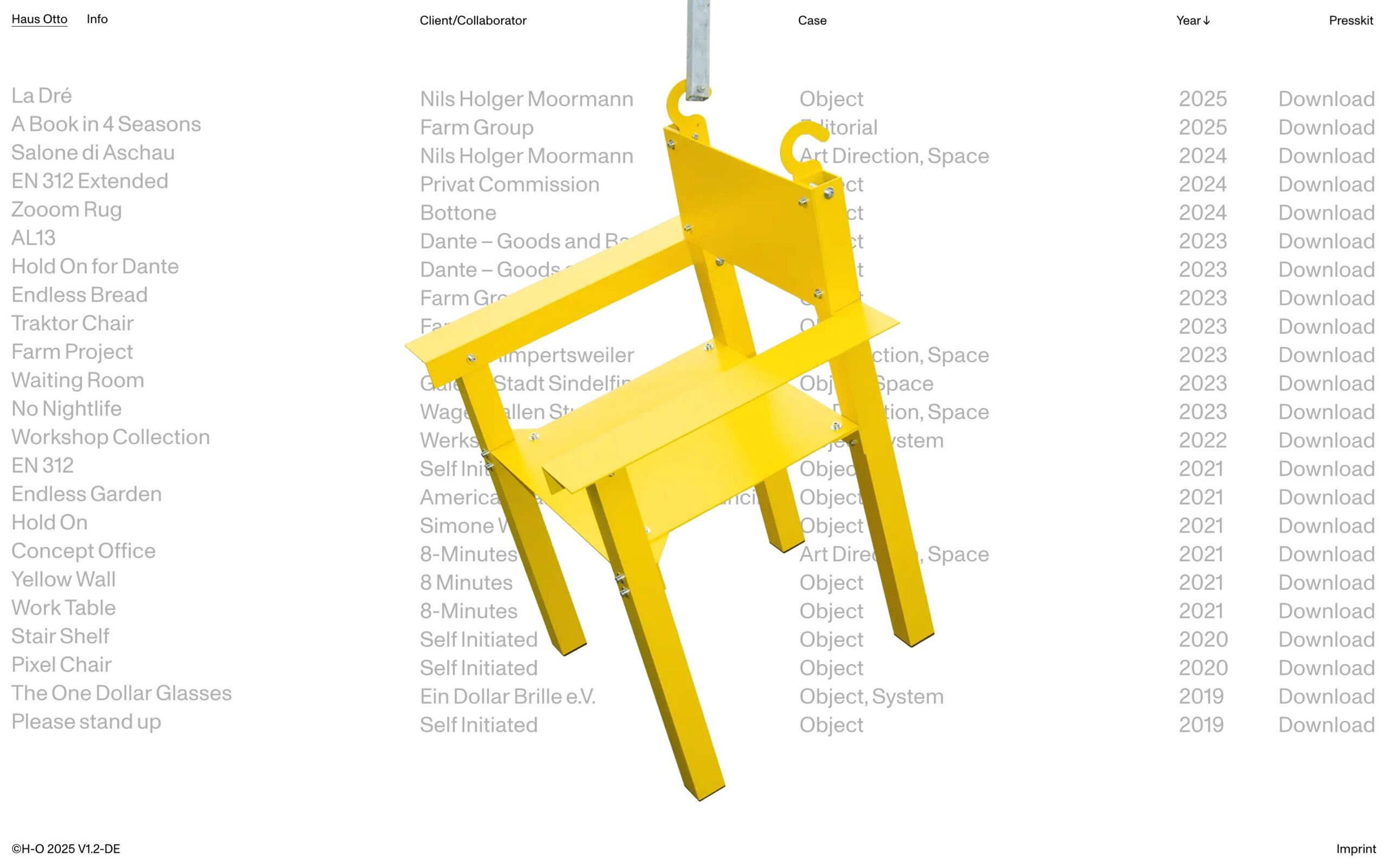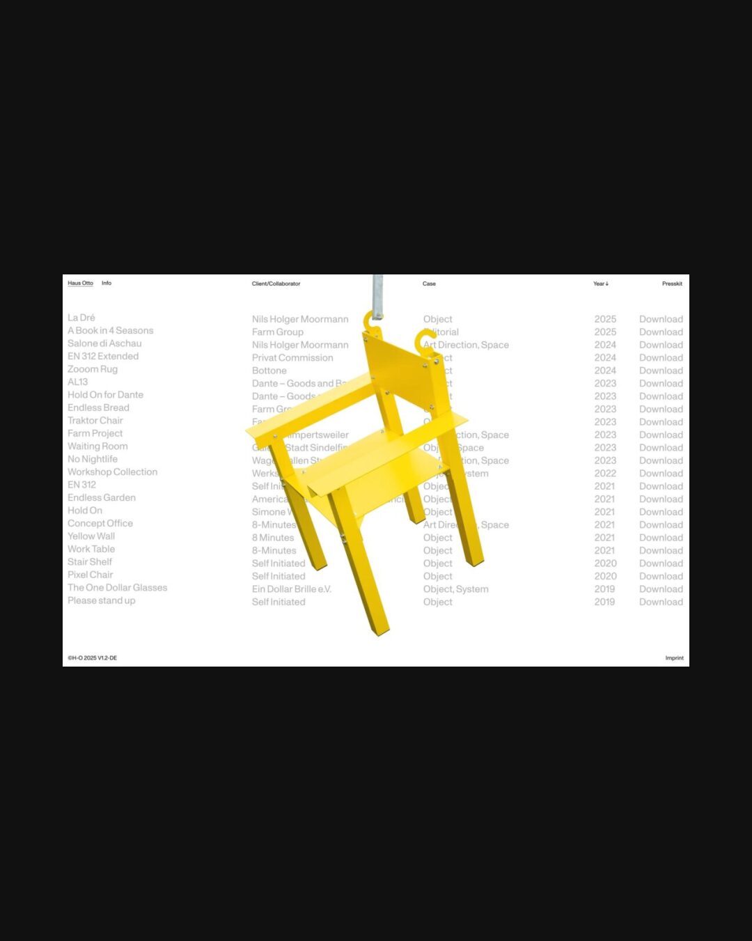 0518 hausotto.com Furniture, Big Images, Brutalist, Large Scale, Light, Small Typography, White Space, Pink, Silver, White, Germany. Design: Leon Reeb, Matter Of. Development: Mark Julien Hahn. (06-02-2023) ←Close