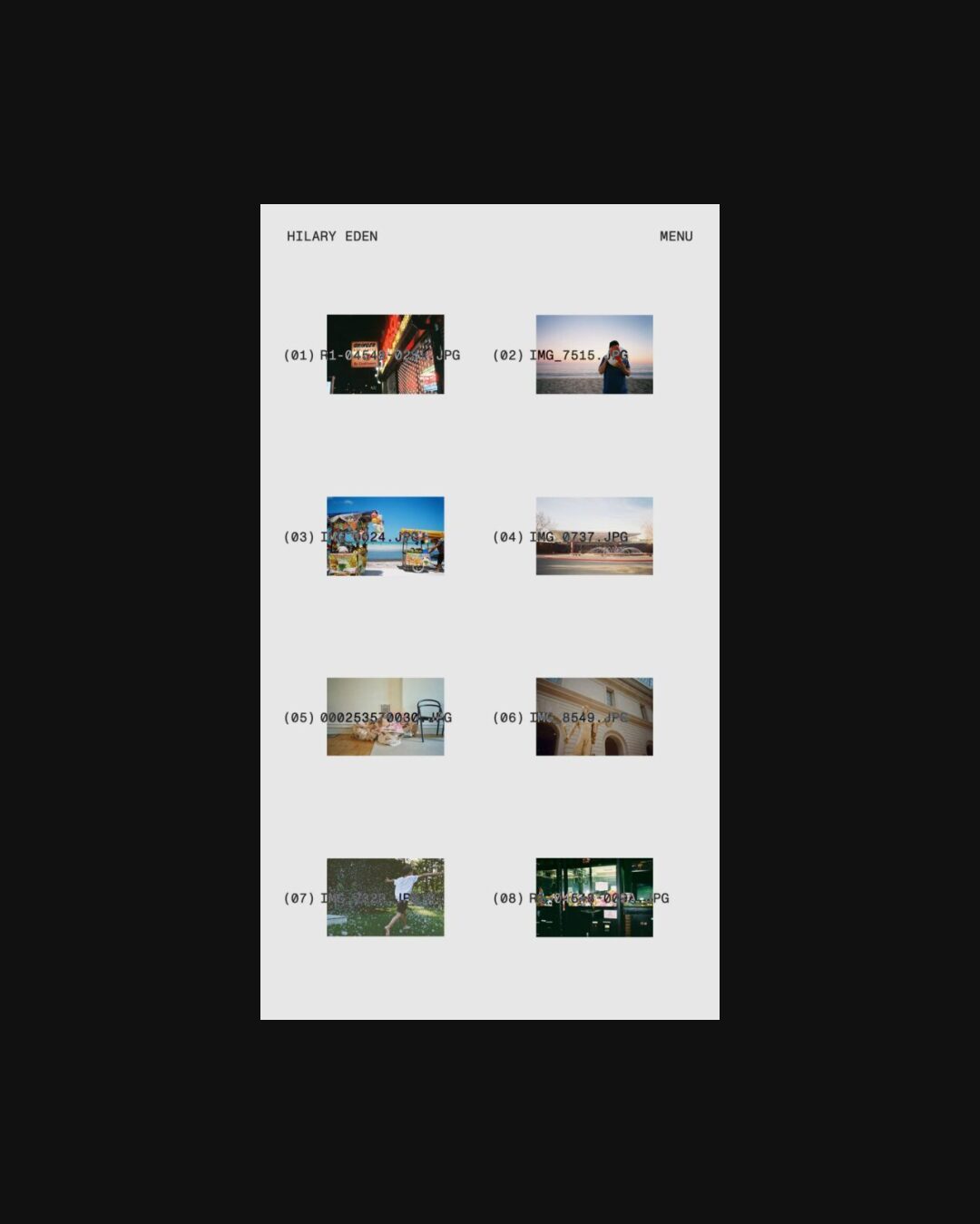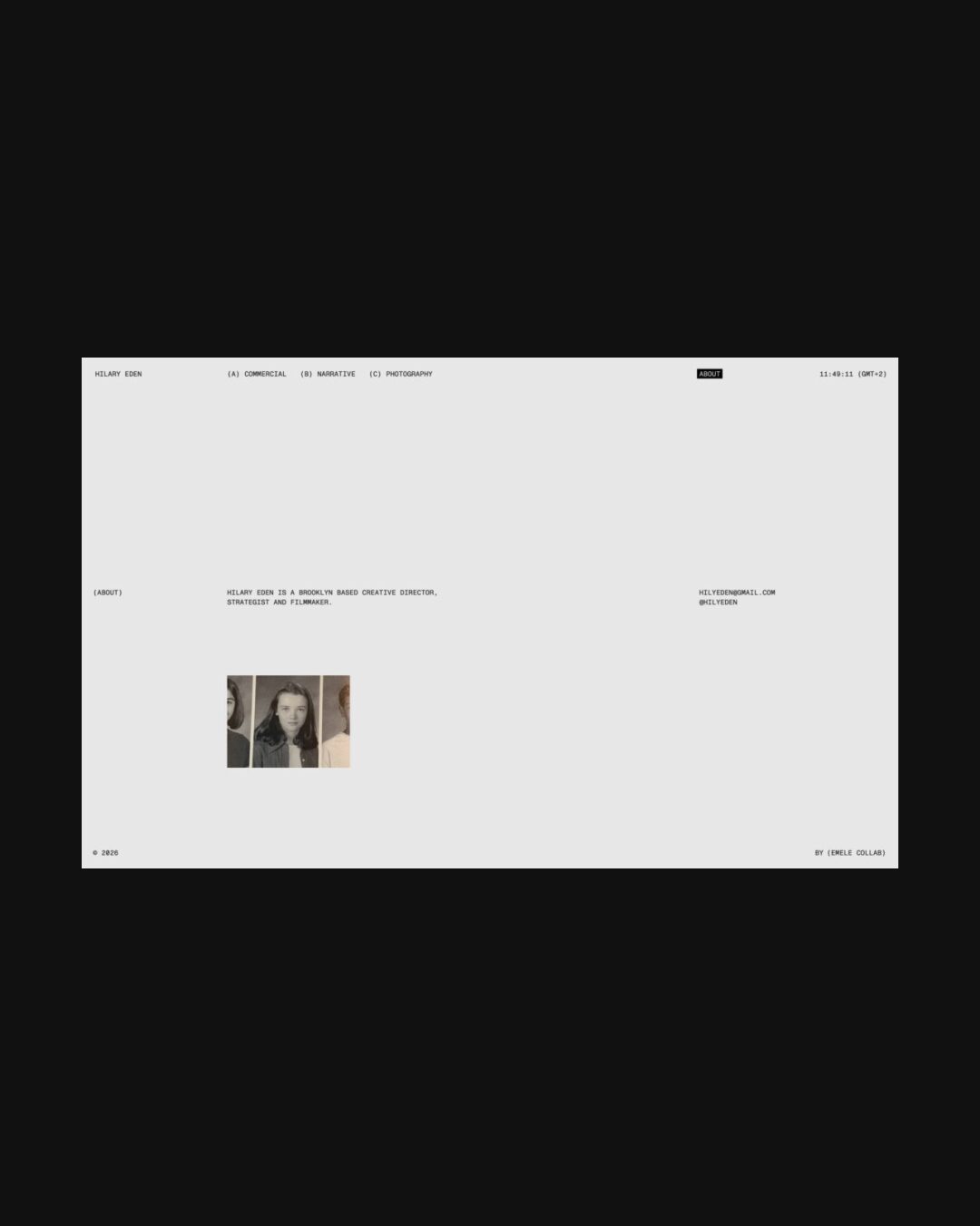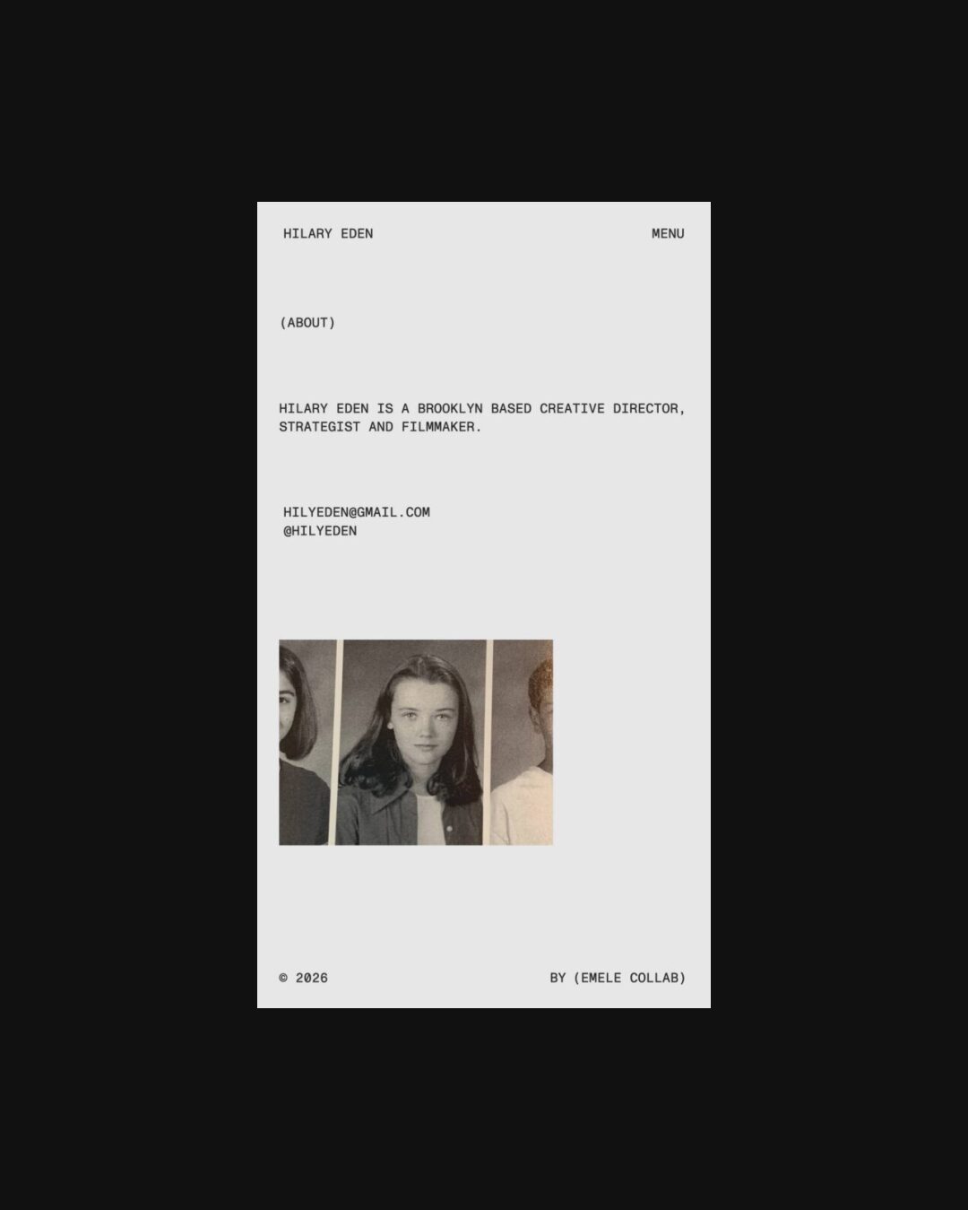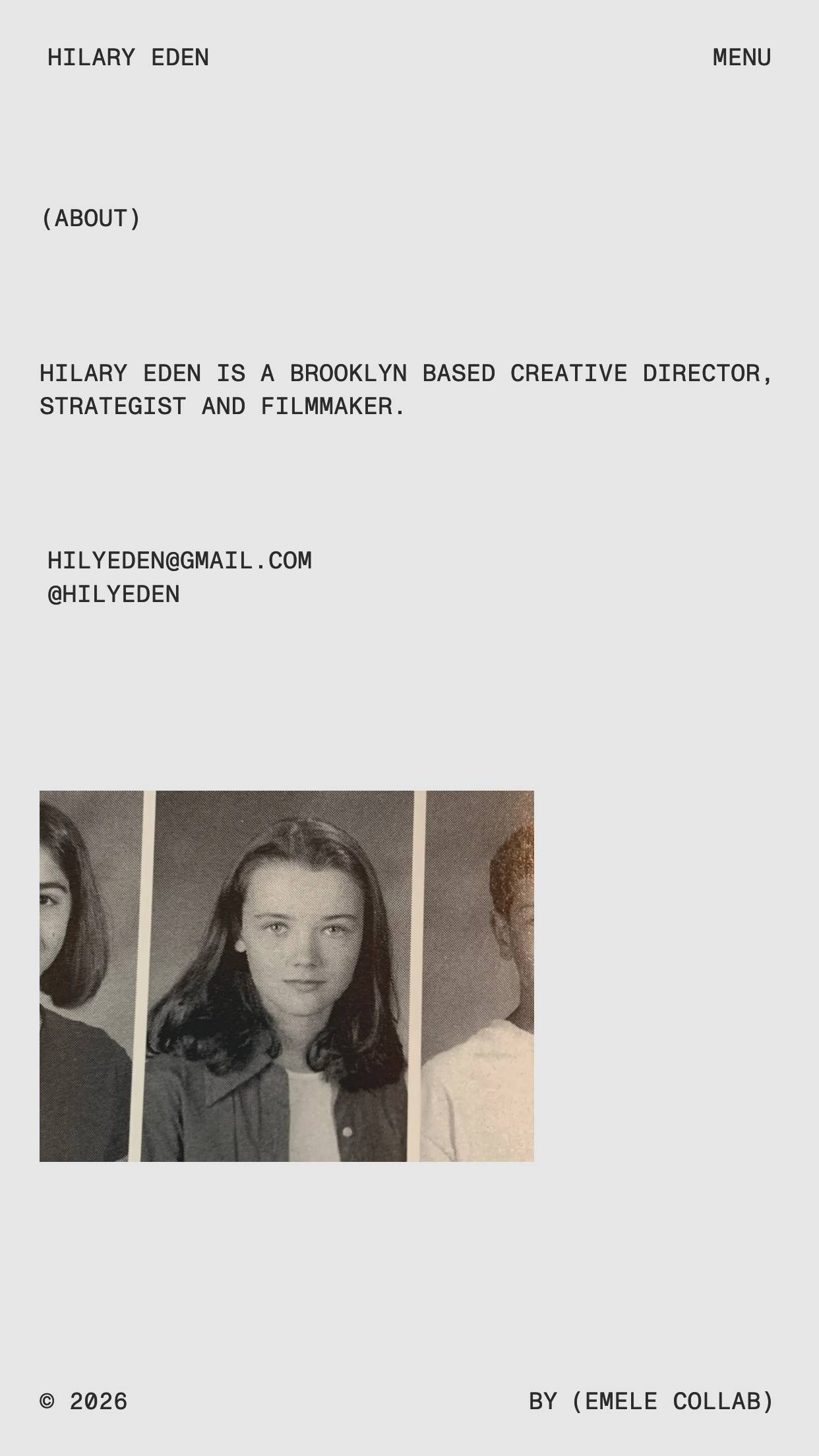 1350 hilaryeden.com Creative Director, Clean, Large Scale, Layered, Light, Minimal, Mono Typeface, Overlay Containers, Simple, White Space, Black, USA. Design: Emele Collab. Development: Emele Collab. (13-01-2026) ←Close