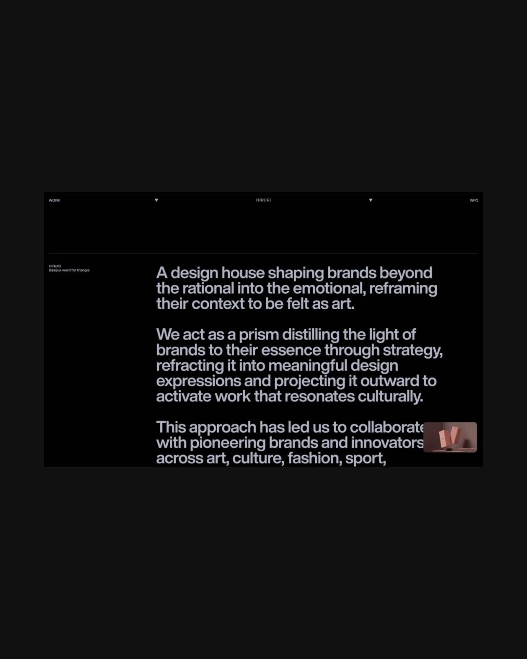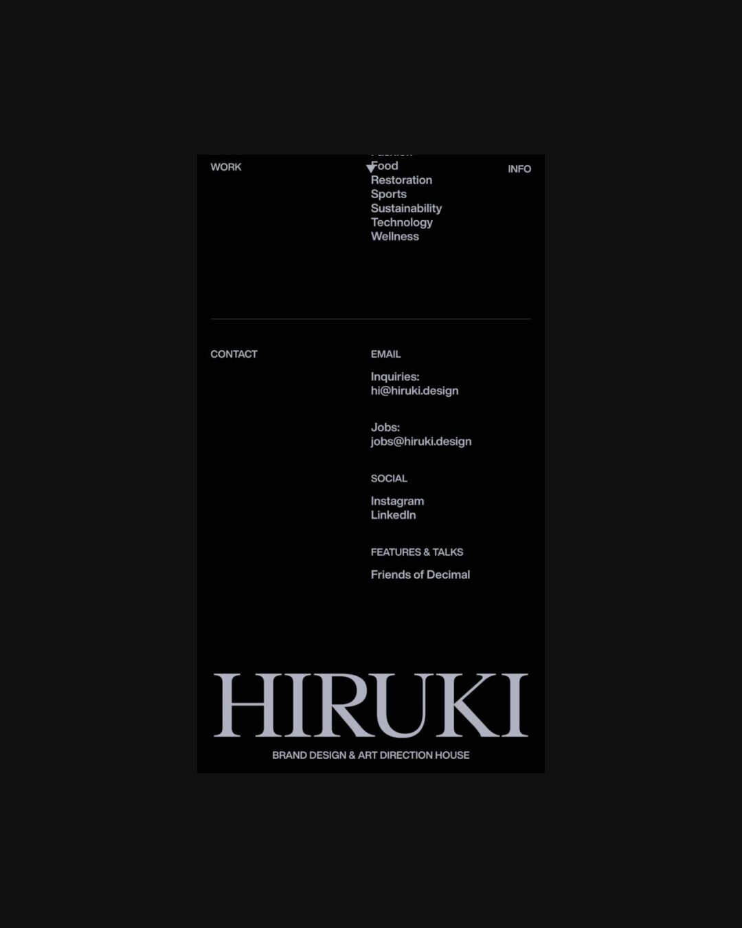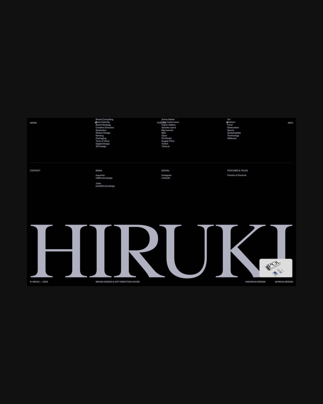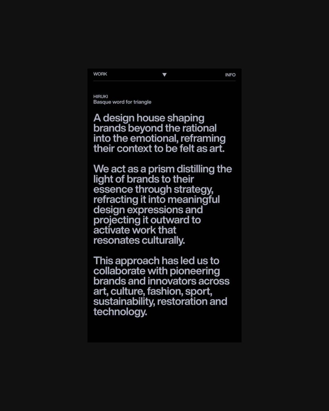 1326 hiruki.design Design, Animations, Big Title, Clean, Dark, List, One Page, Sans Serif Typeface, Scroll Events, Video, White Space, Black, Gray, Lavender, Spain. Design: Julen Saenz. Development: Harry Atkins. (23-12-2025) ←Close