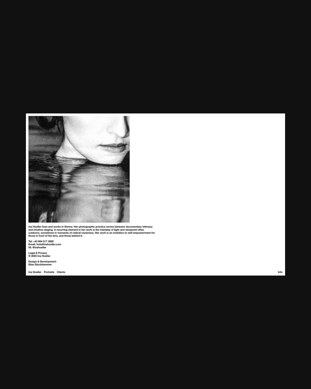 1221 inahoeller.com Photography, Animations, Bold, Bright, Brutalist, Clean, Grid, Layered, Light, Overlay Containers, Sans Serif Typeface, Simple, Slider, Small Typography, White Space, Viridian, White, Austria. Design: Elias Stockhammer. Development: Elias Stockhammer. (29-07-2025) ←Close