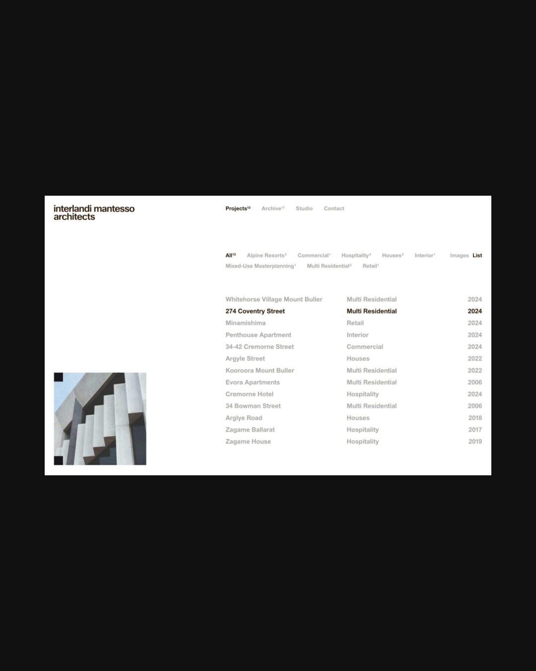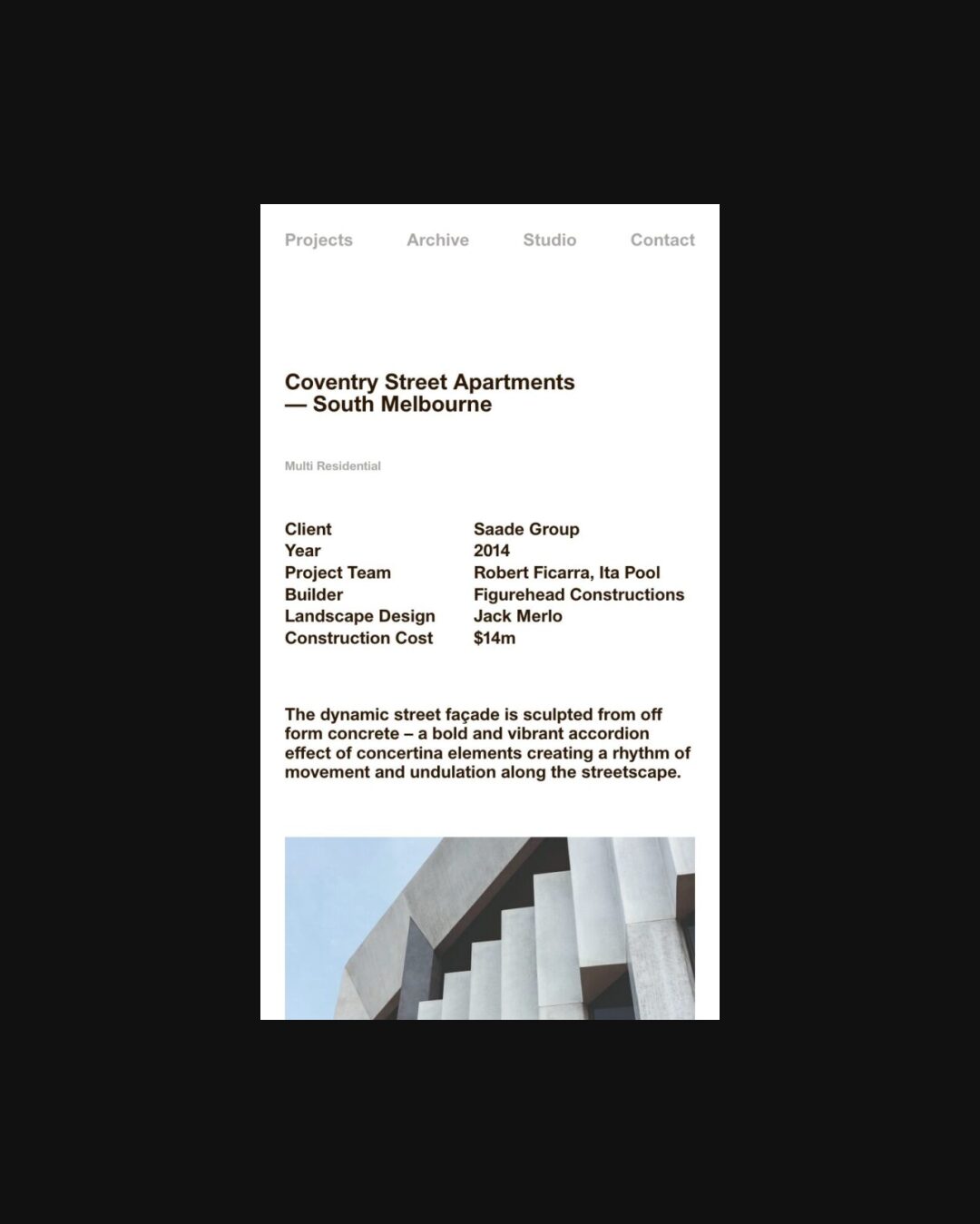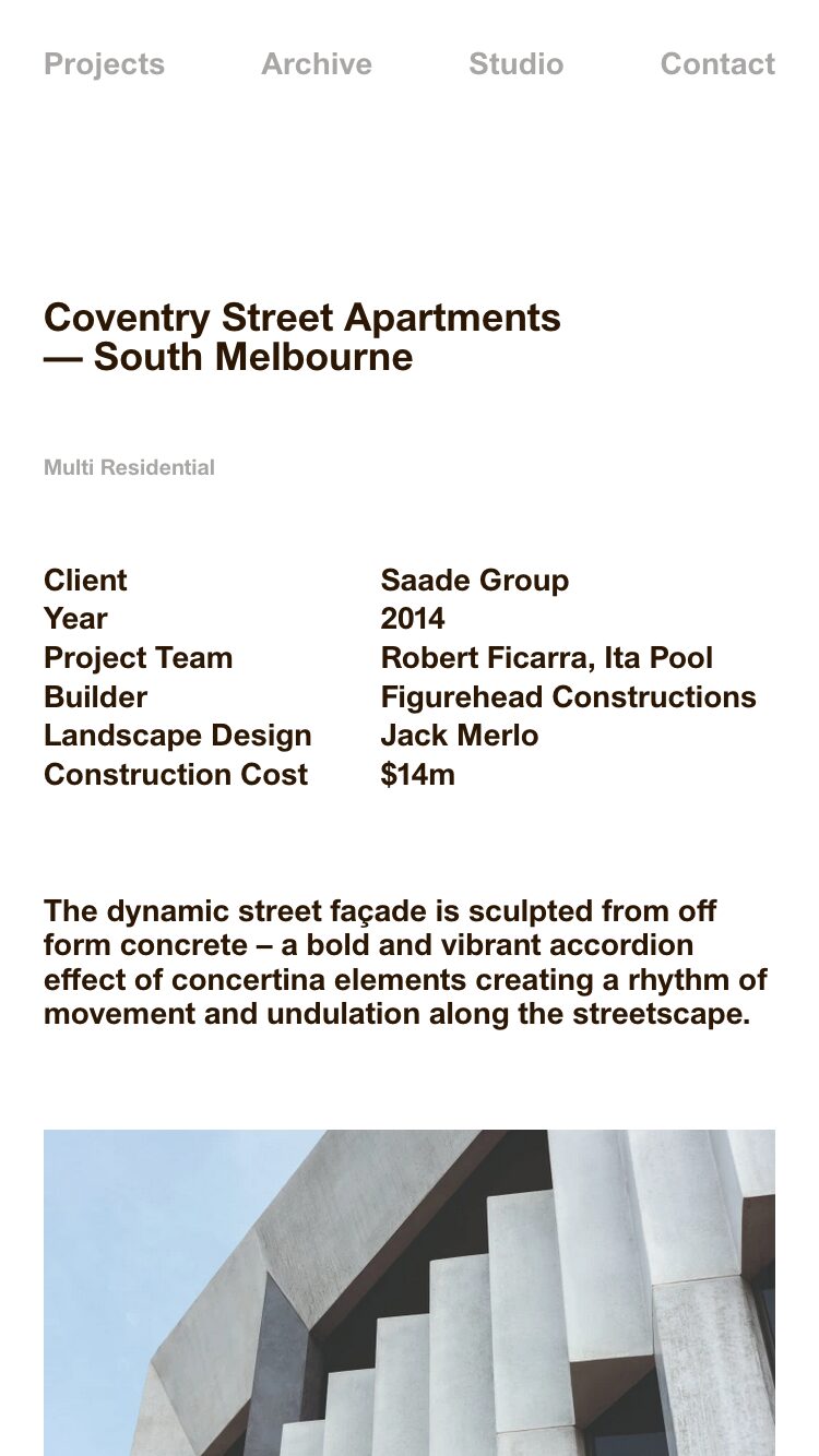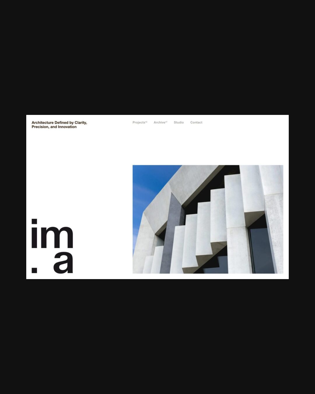 1326 imarchitects.com.au Architecture, Big Title, Bold, Bright, Clean, Grid, Hover Events, Industrial, Large Scale, Light, List, Minimal, Sans Serif Typeface, Simple, Small Typography, Technical, Technologic, White Space, Silver, White, Australia. Design: Univers. Development: Univers. (07-04-2026) ←Close