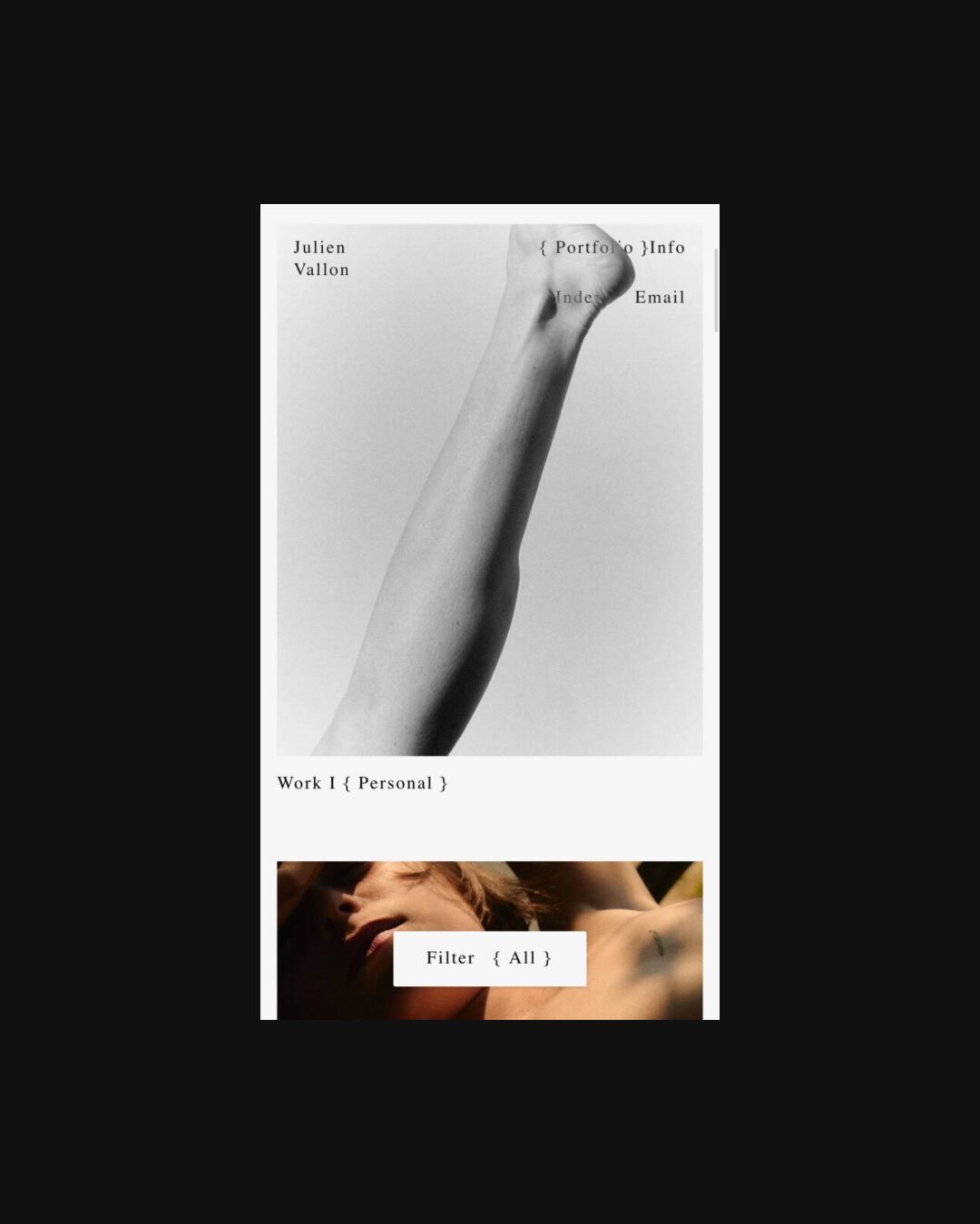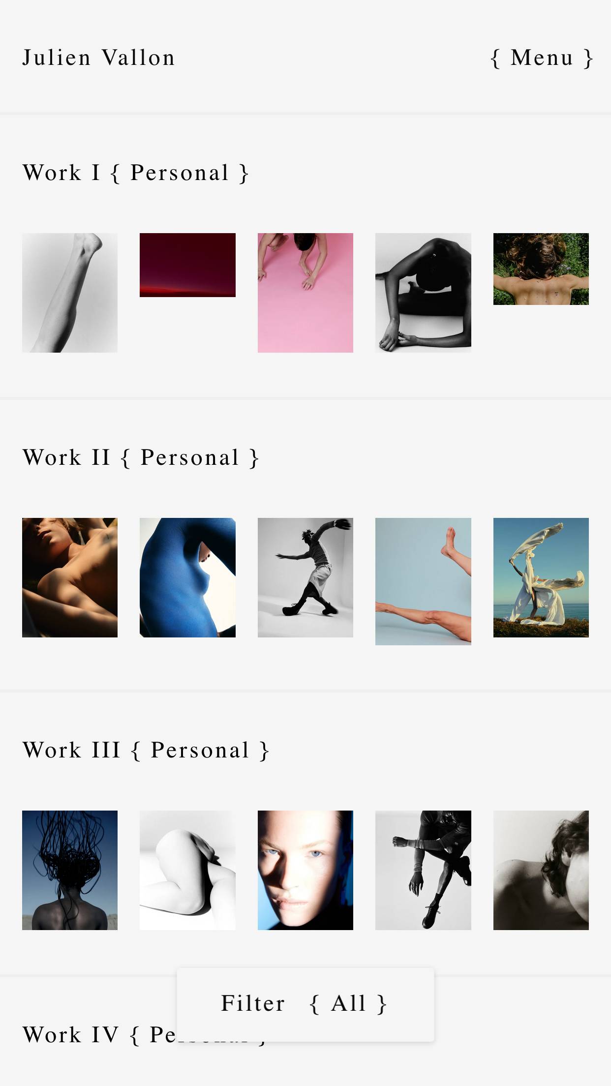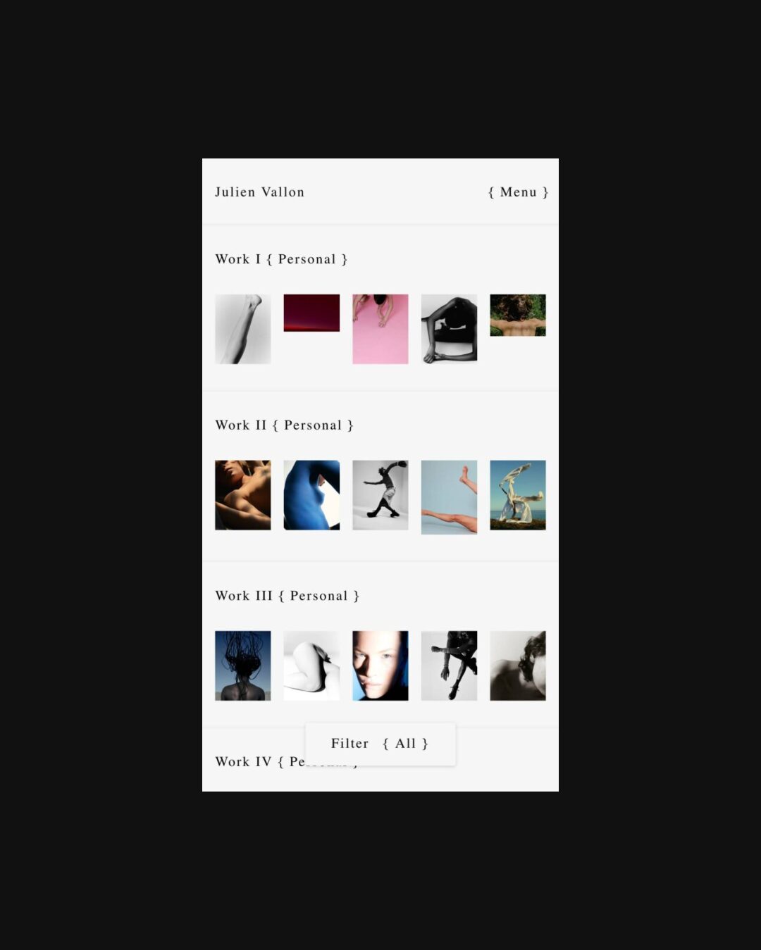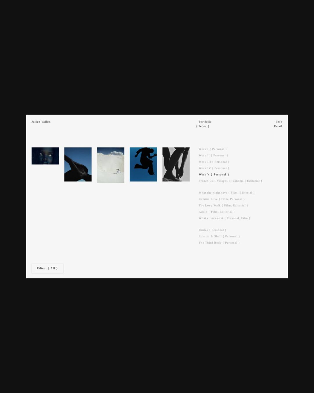 1315 julienvallon.com Visual Artist, Asymmetrical Grid, Bright, Clean, Grid, Large Scale, Light, List, Serif Typeface, Simple, Video, White Space, Silver, White, France. Design: Lovelace Studio. Development: Lovelace Studio. (25-11-2025) ←Close