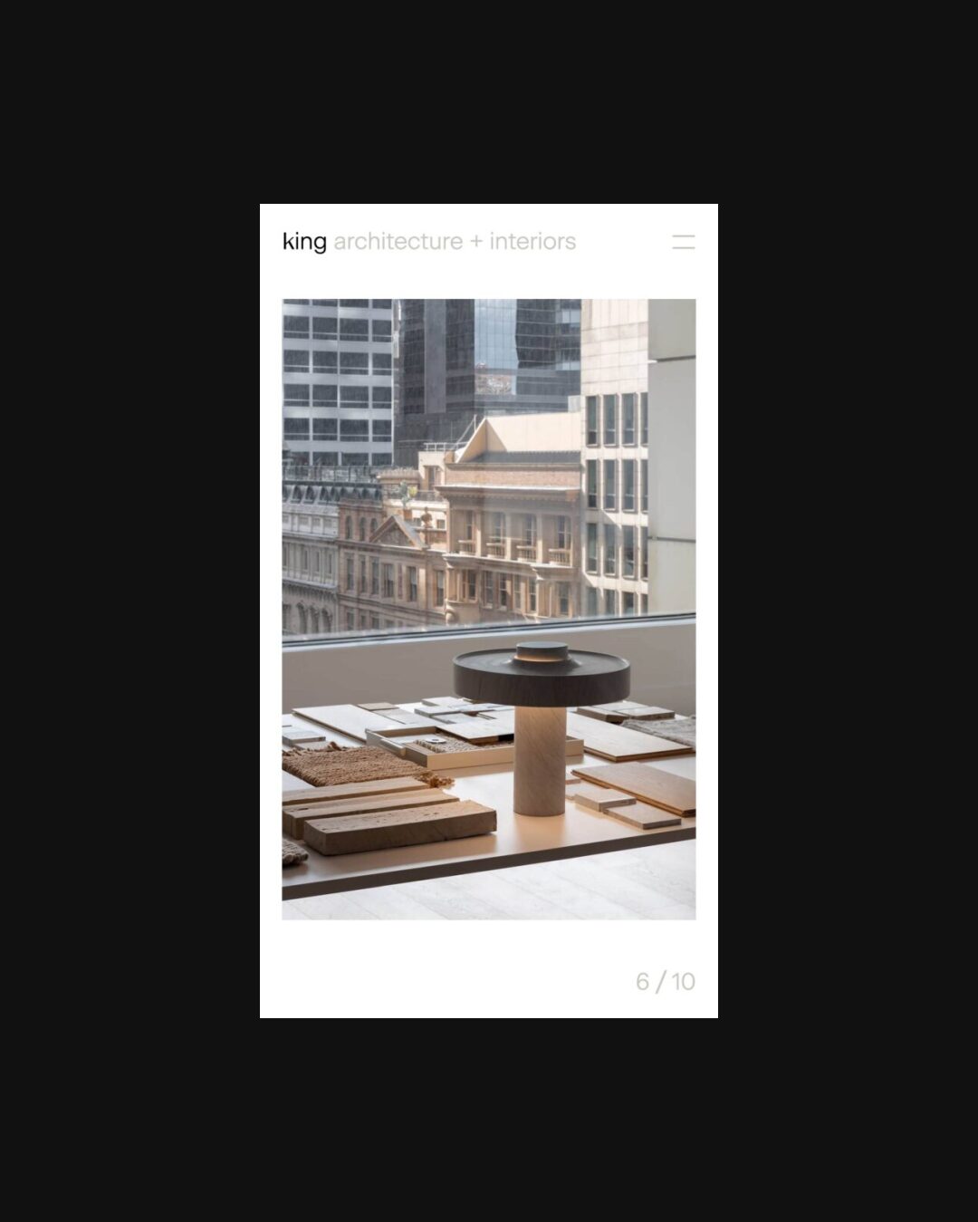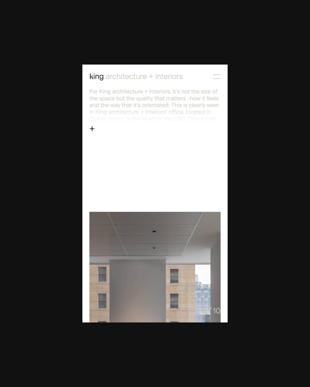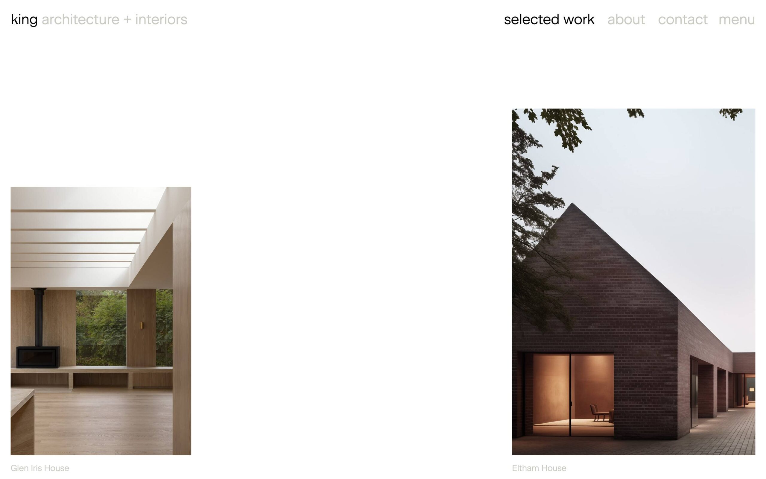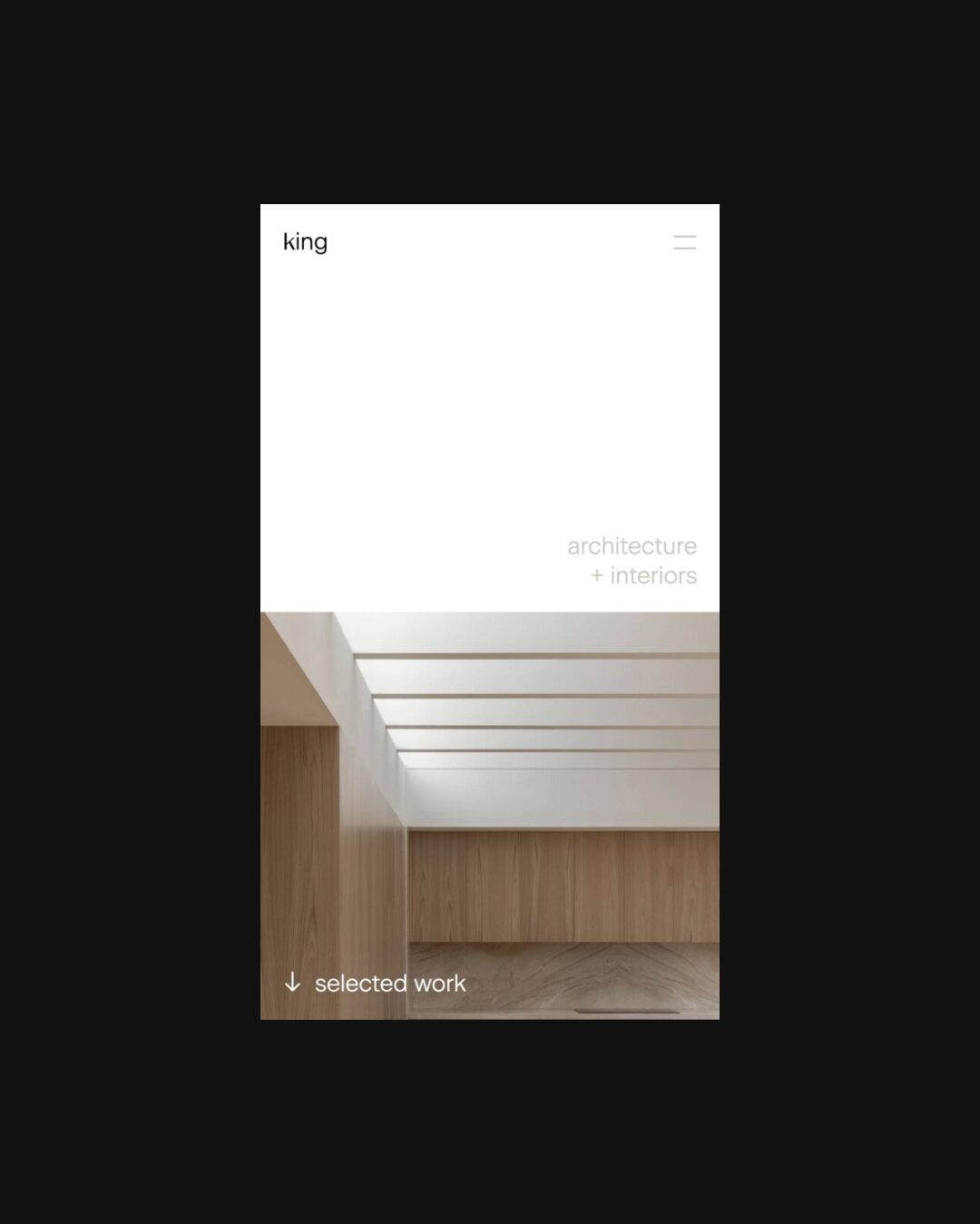 1299 kingarchitecture.com.au Architecture, Big Typography, Bright, Clean, Large Scale, Light, Minimal, Sans Serif Typeface, Scroll Events, Simple, White Space, Silver, White, Australia. Design: Studio A. Stein. Development: Studio A. Stein. (05-11-2025) ←Close