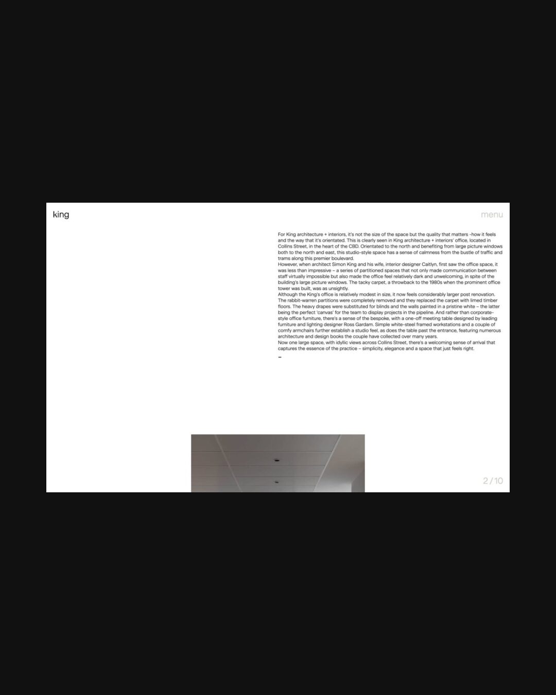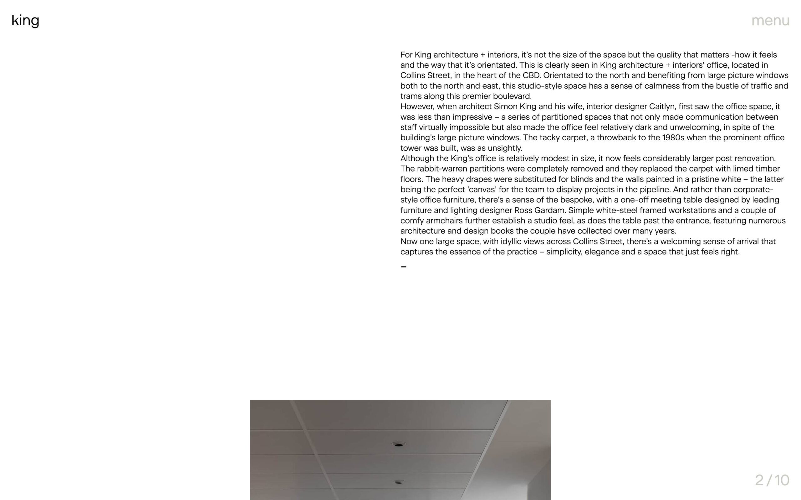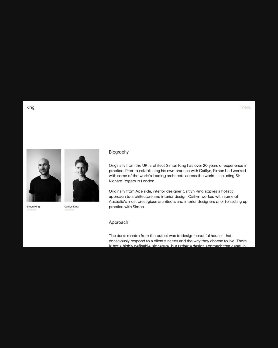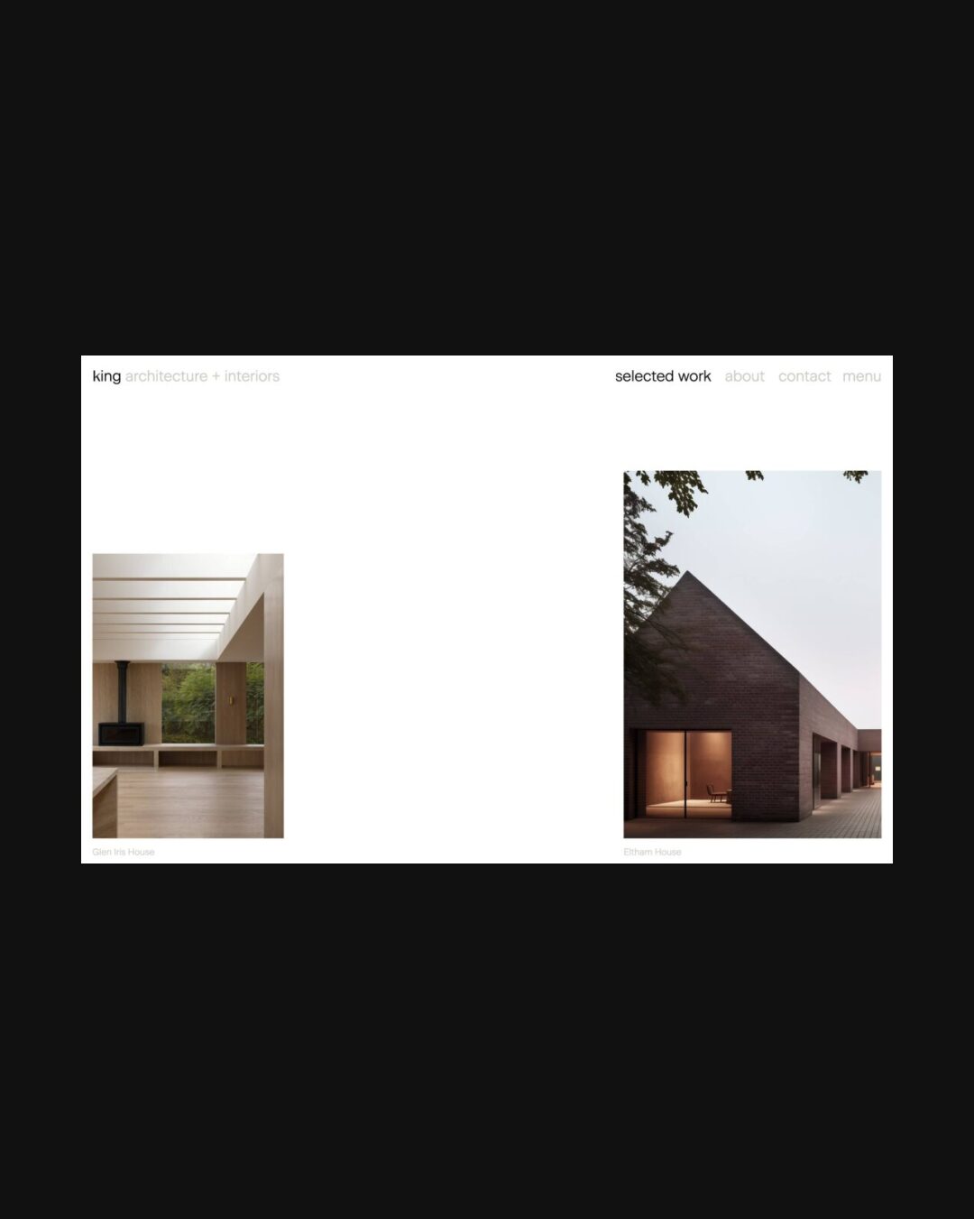 1299 kingarchitecture.com.au Architecture, Big Typography, Bright, Clean, Large Scale, Light, Minimal, Sans Serif Typeface, Scroll Events, Simple, White Space, Silver, White, Australia. Design: Studio A. Stein. Development: Studio A. Stein. (05-11-2025) ←Close