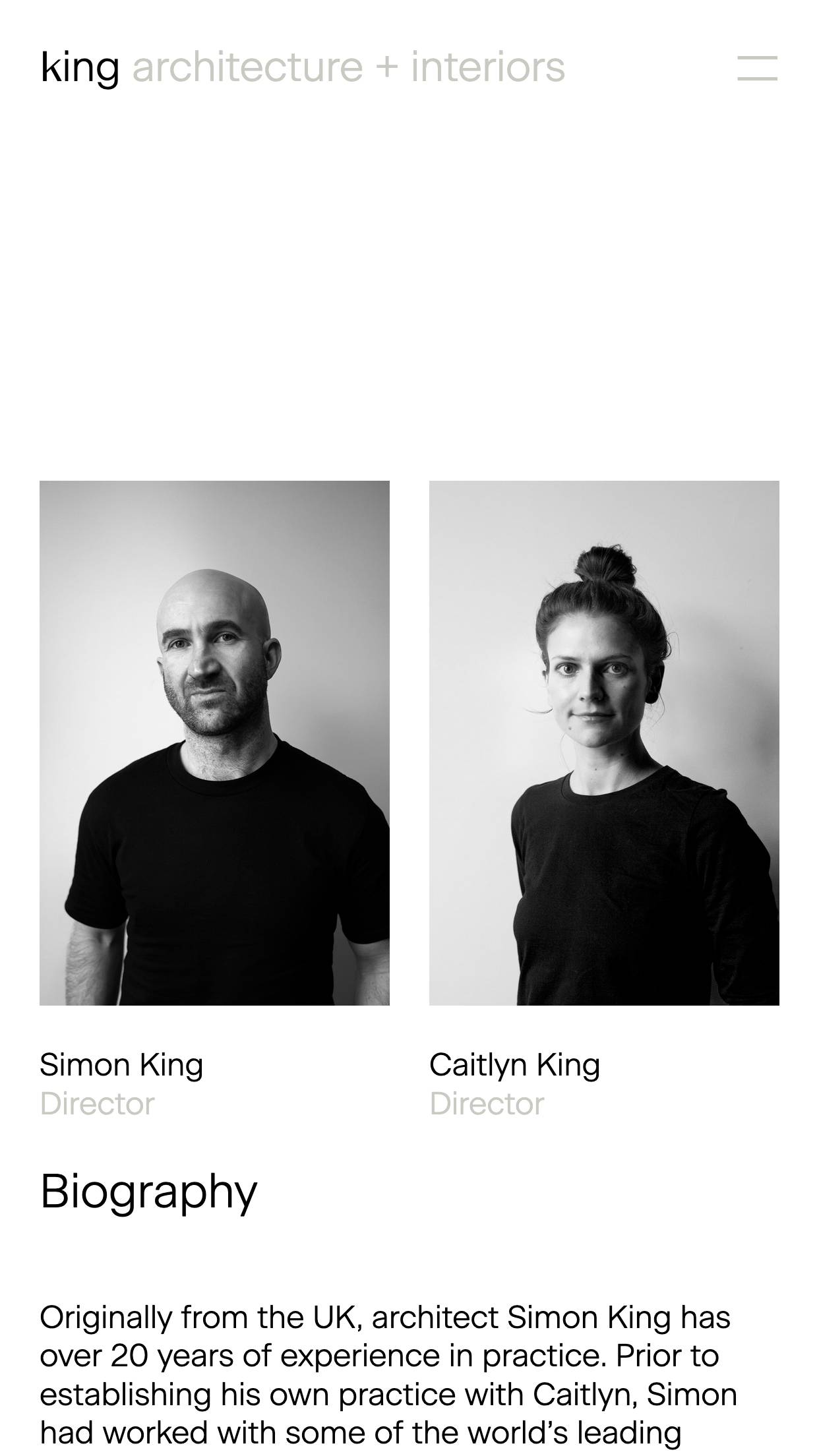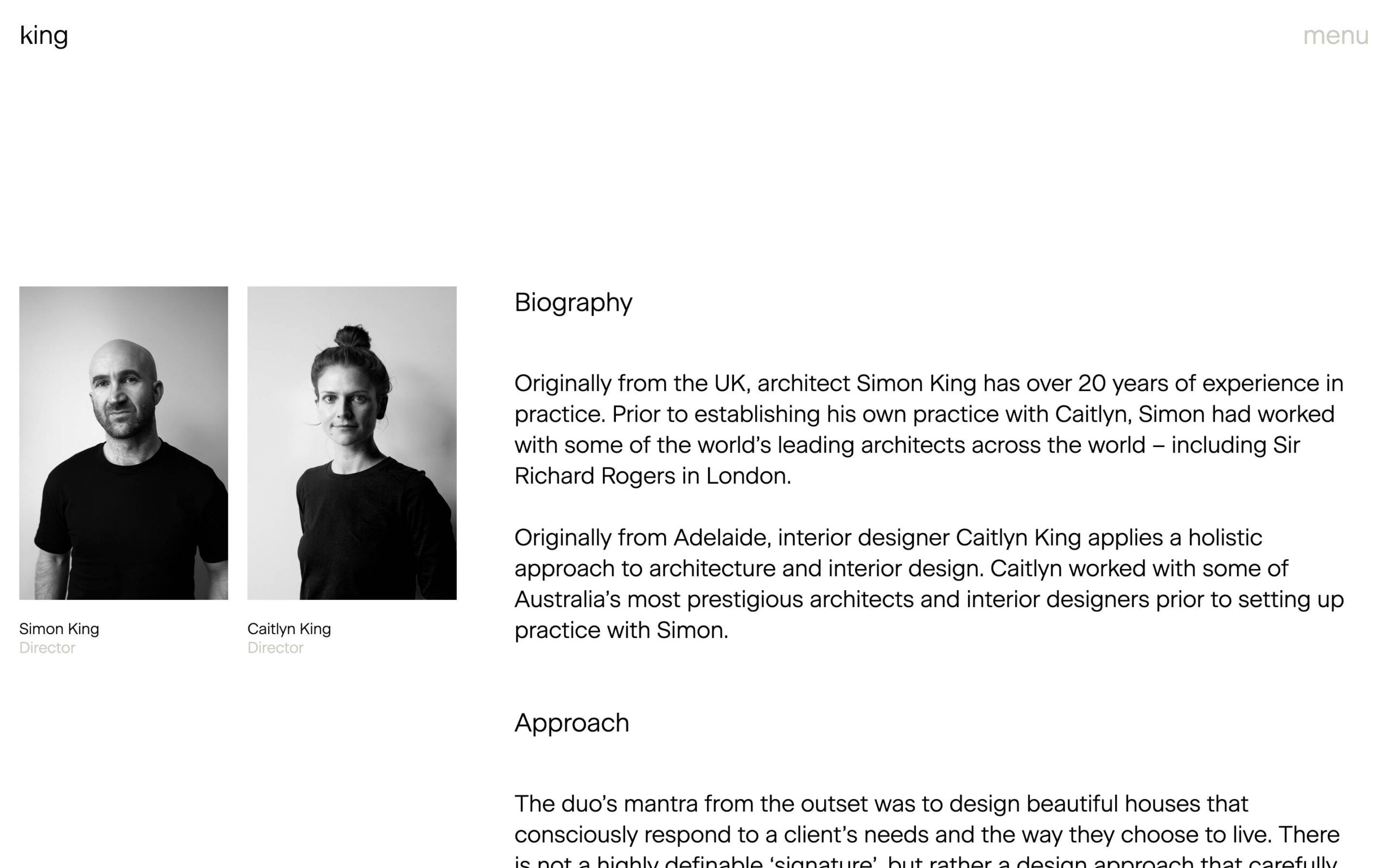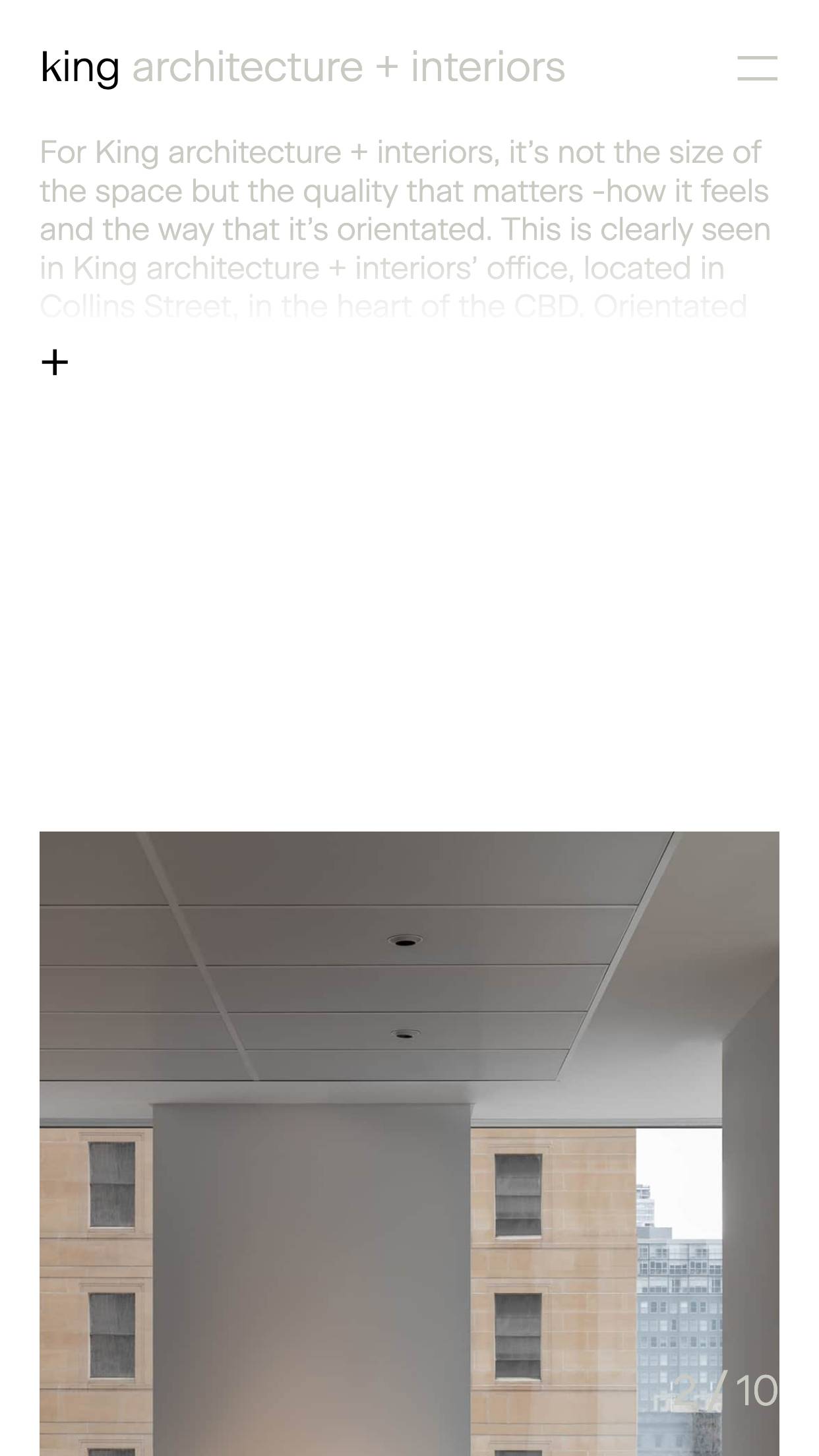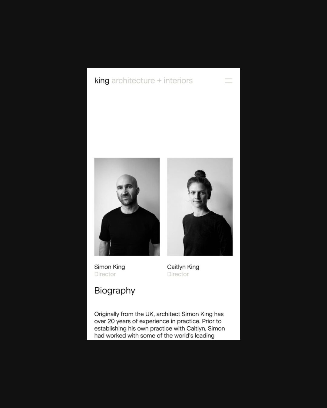 1299 kingarchitecture.com.au Architecture, Big Typography, Bright, Clean, Large Scale, Light, Minimal, Sans Serif Typeface, Scroll Events, Simple, White Space, Silver, White, Australia. Design: Studio A. Stein. Development: Studio A. Stein. (05-11-2025) ←Close