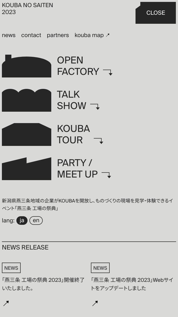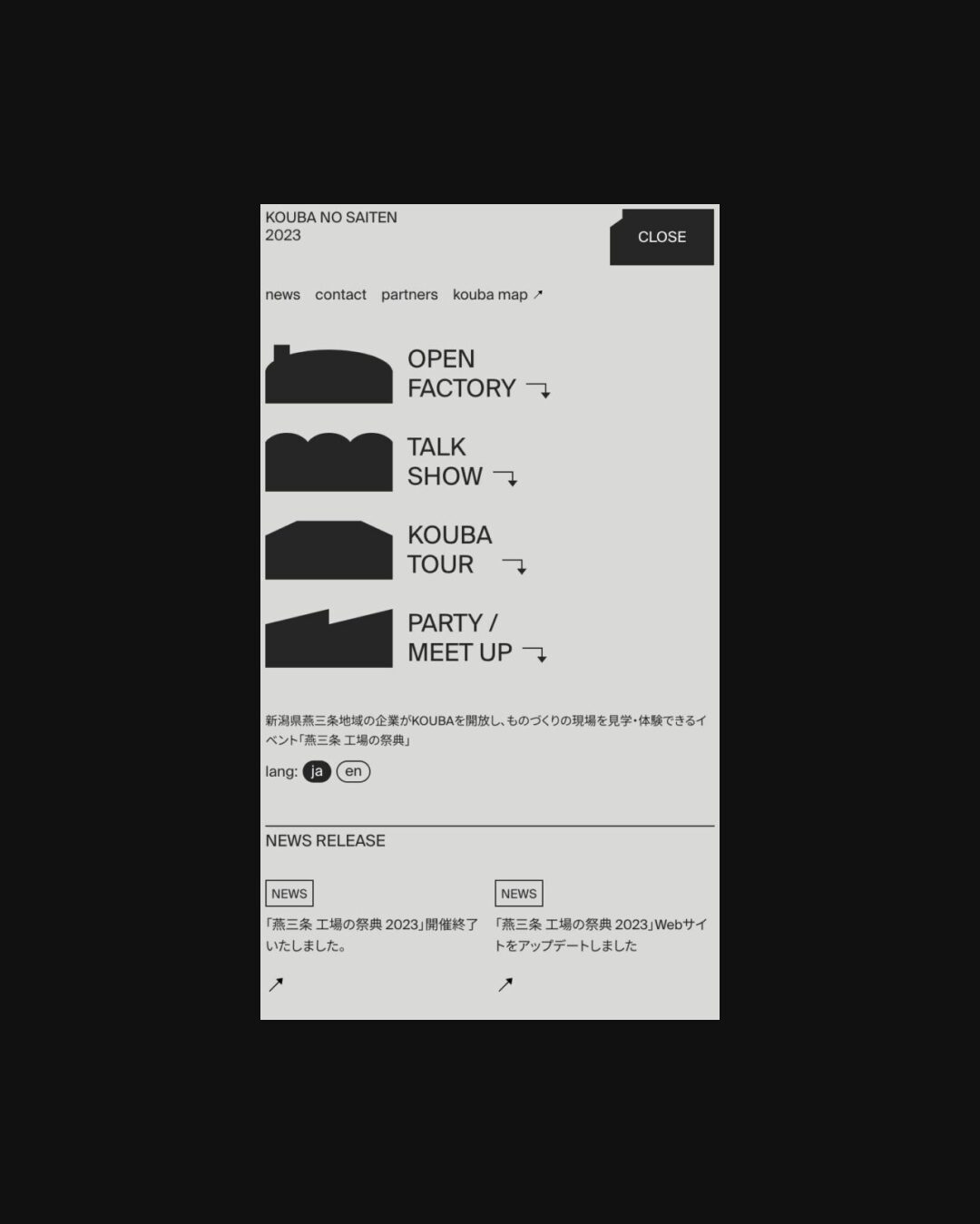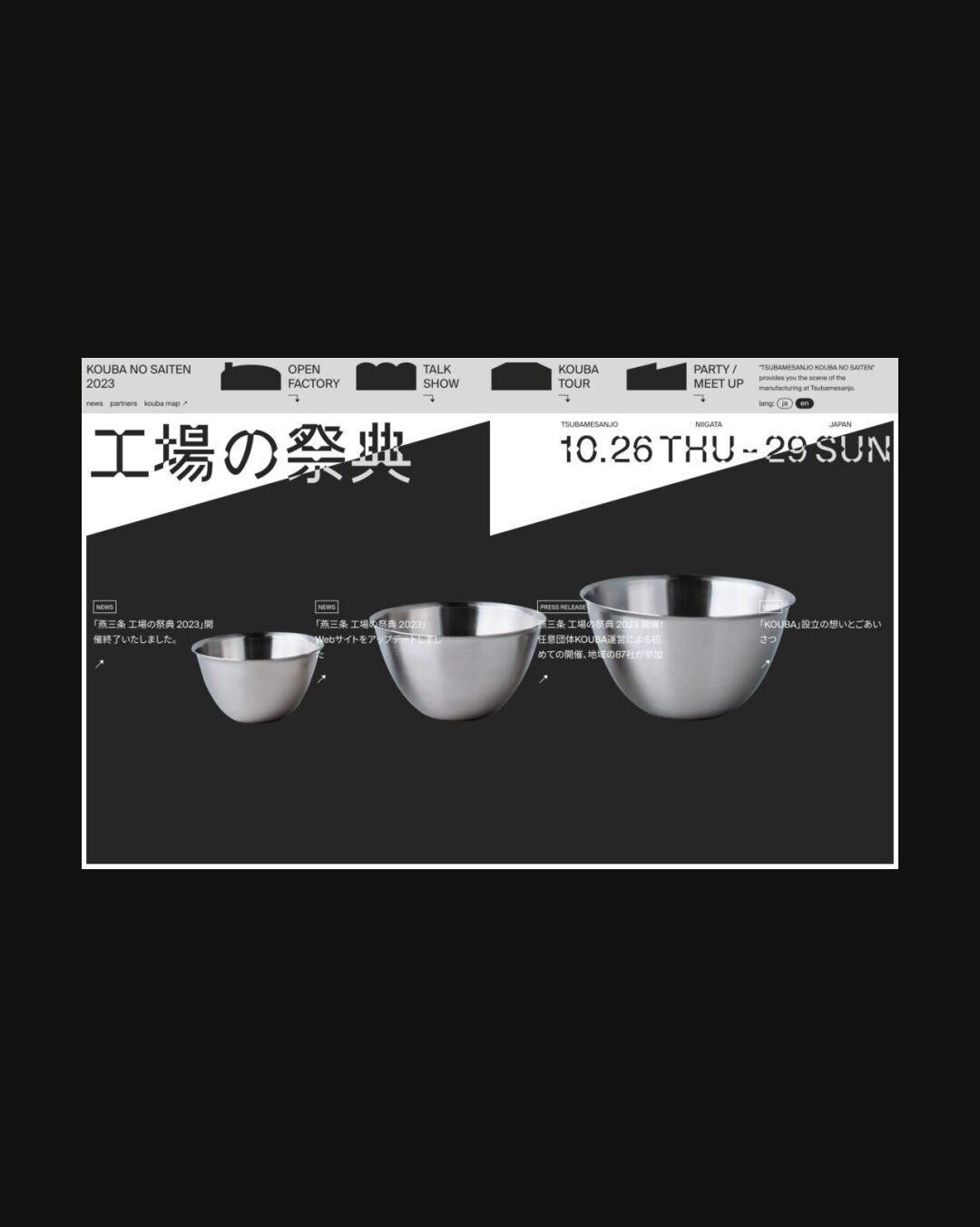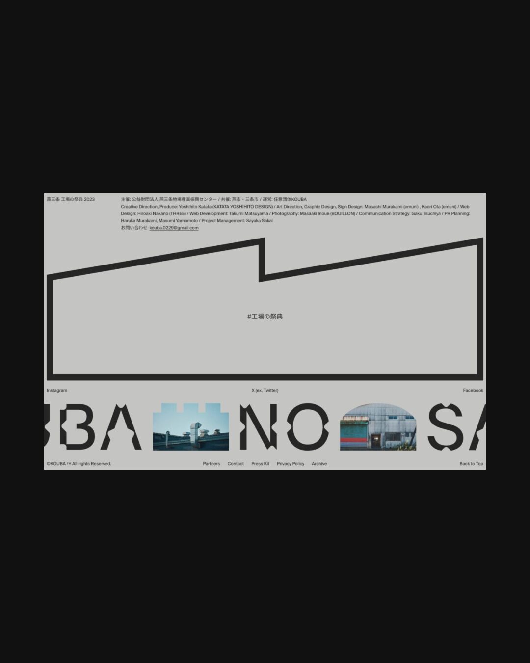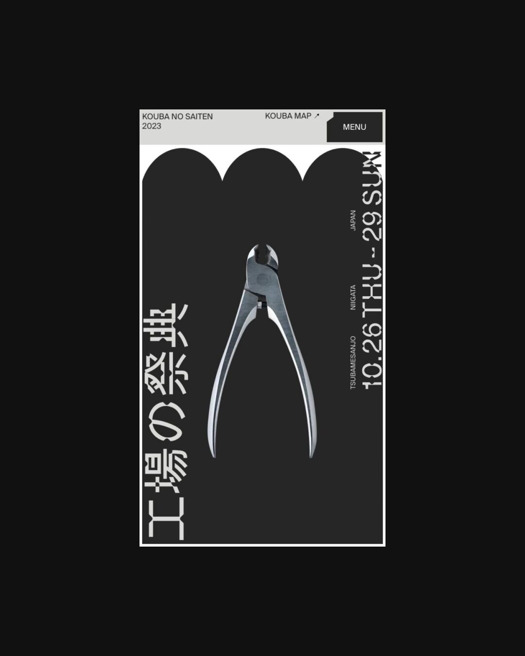 1337 2023.kouba-fes.jp Event, Animations, Big Typography, Industrial, Large Scale, Layered, List, Mixed Style Typefaces, Motion, Overlay Containers, Playful, Sans Serif Typeface, Scroll Events, Scroll Position Animation, Black, White, Japan. Design: Hiroaki Nakano, Katata Yoshihito Design. Development: Matsuyama Takumi. (25-04-2026) ←Close