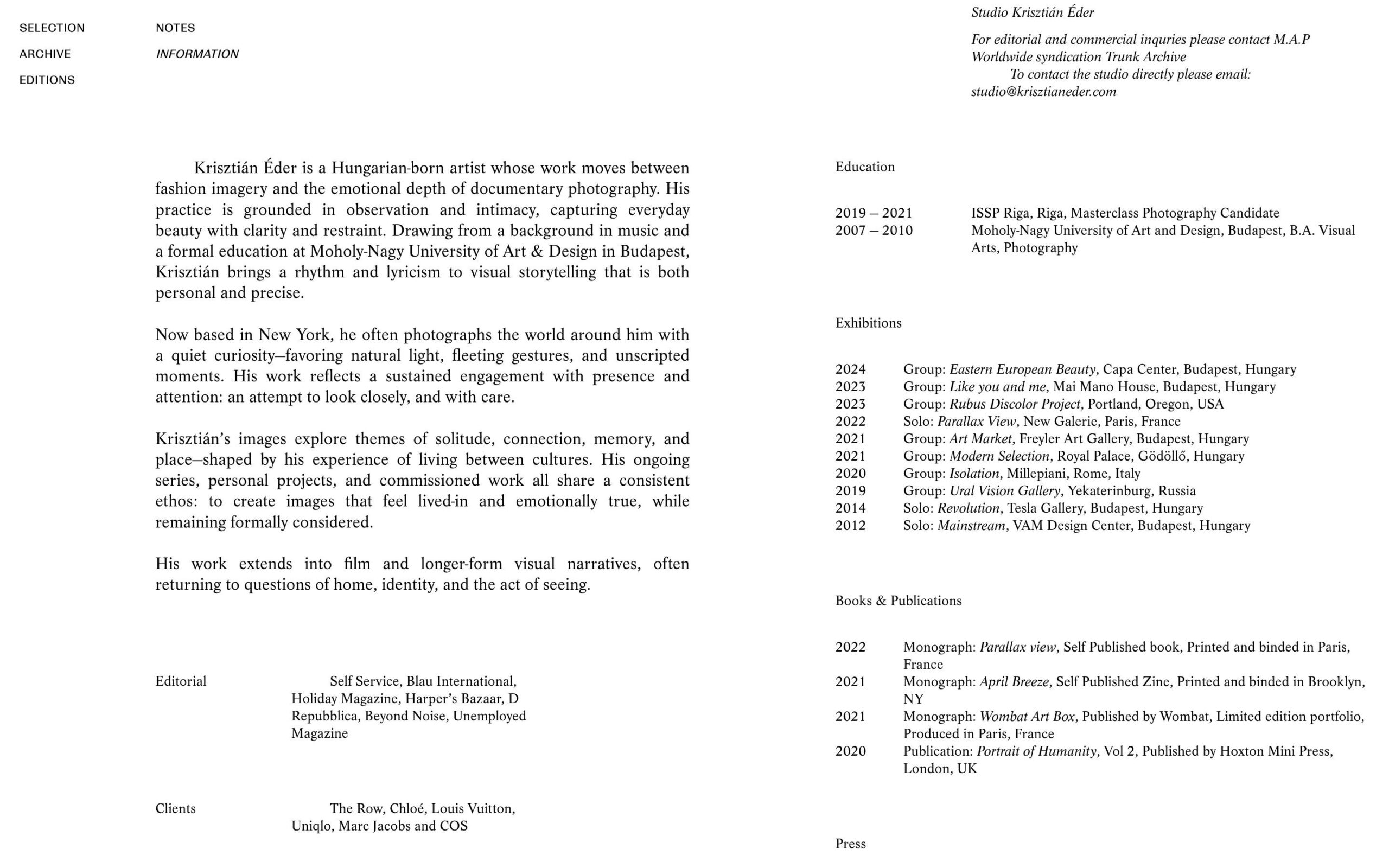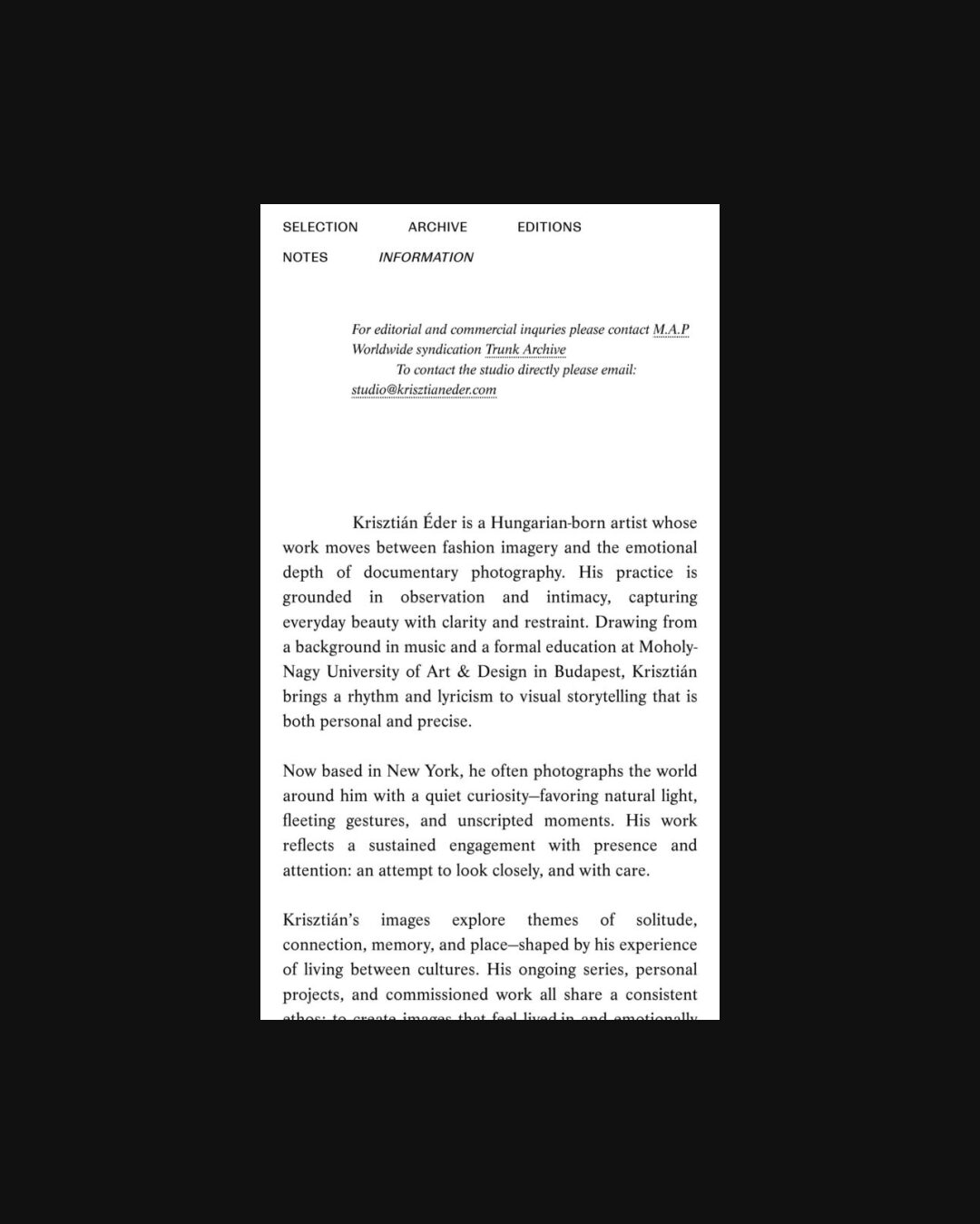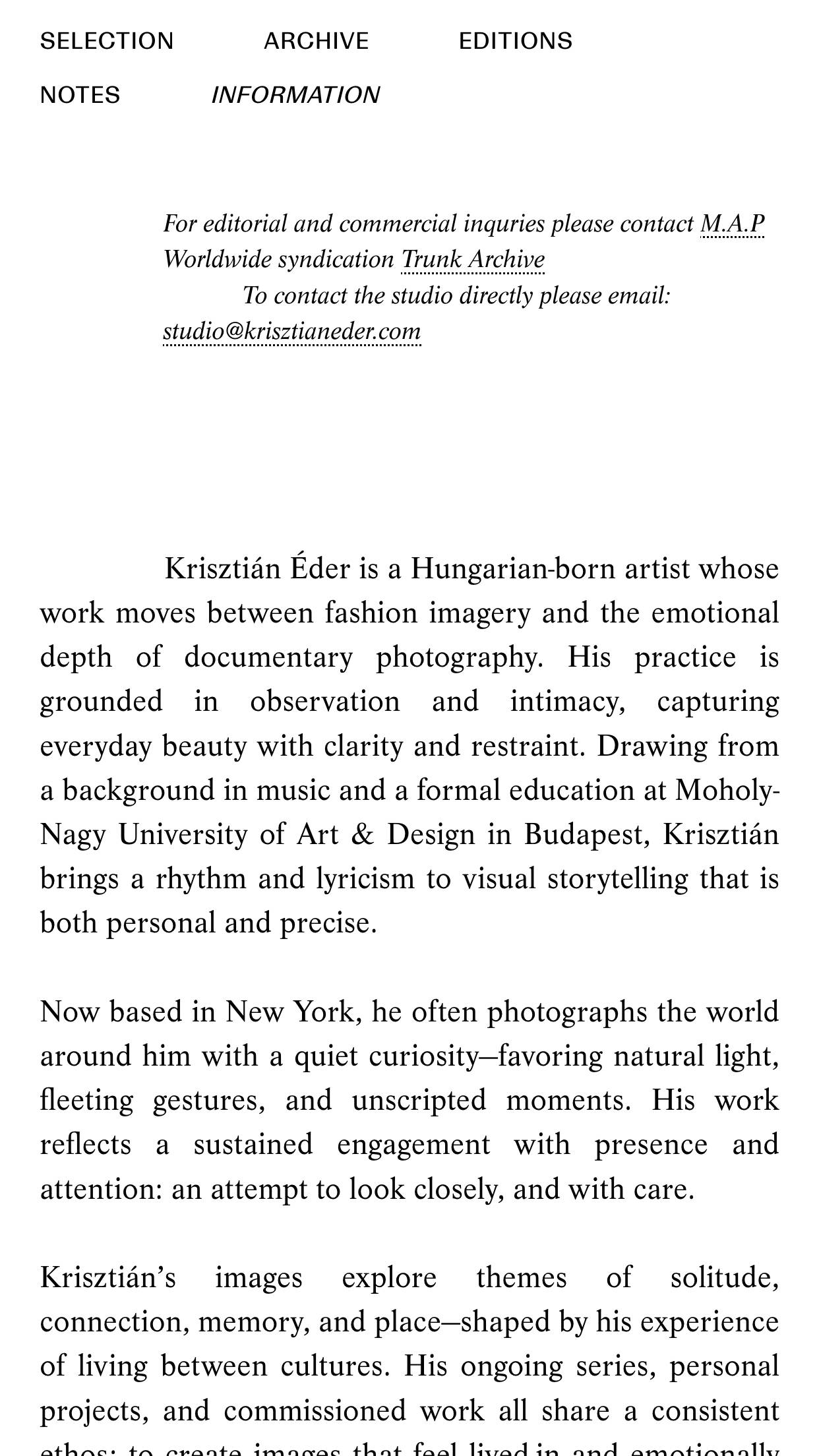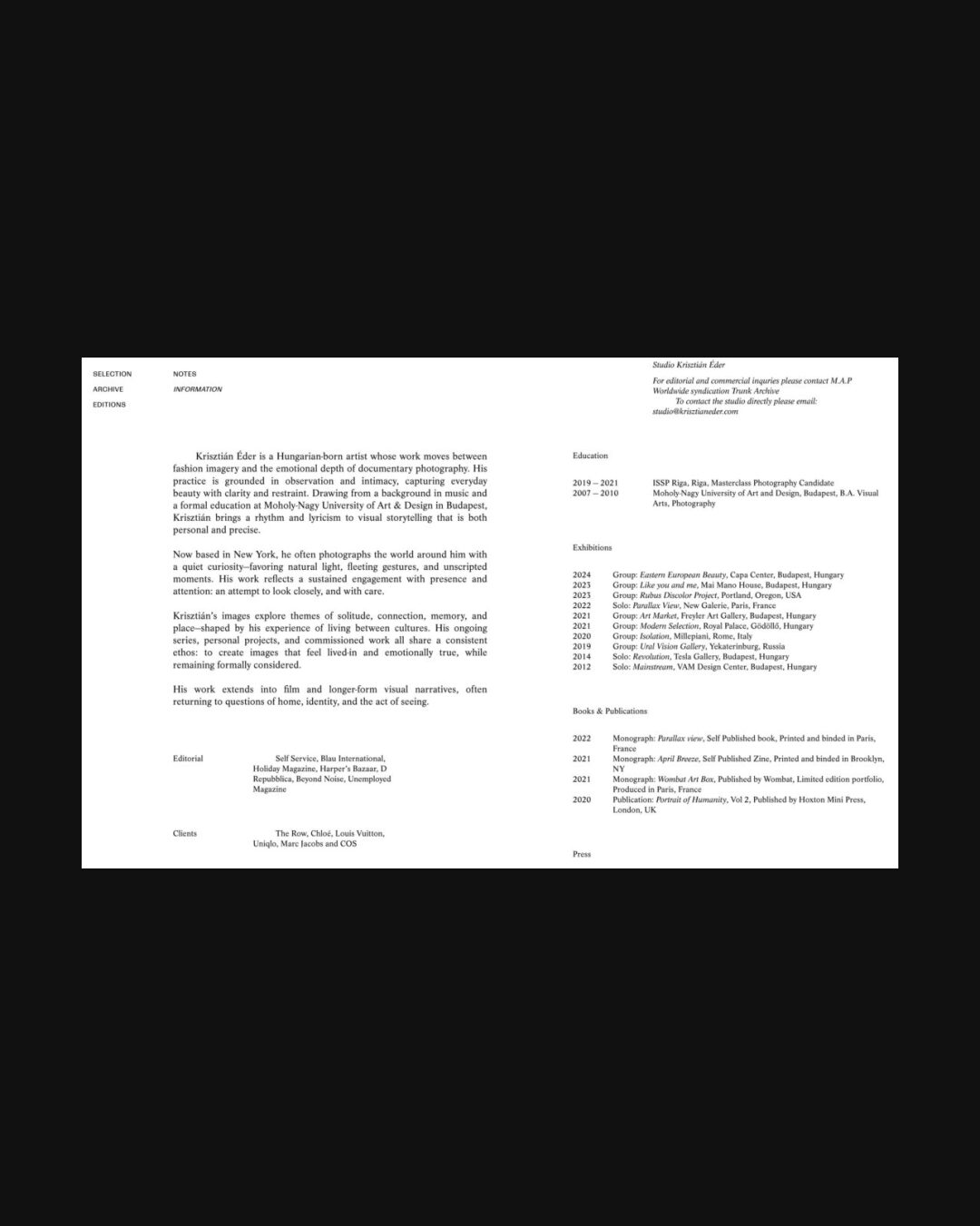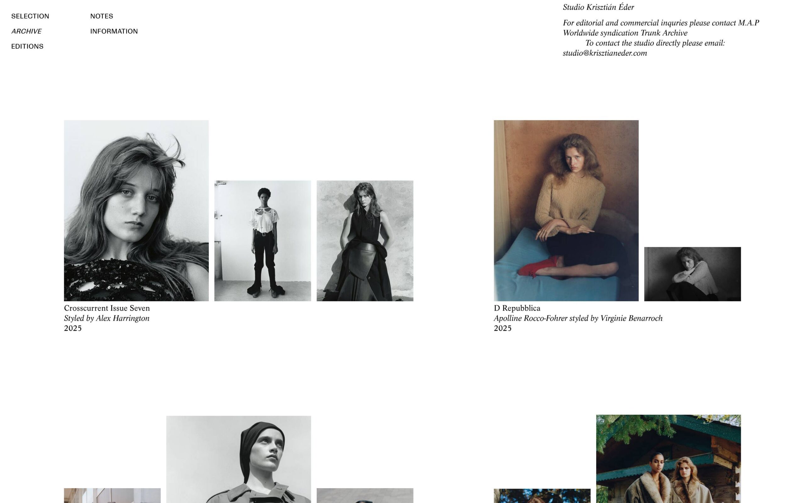 1317 krisztianeder.com Photography, Animations, Brutalist, Clean, Grid, Hover Events, Large Scale, Layered, Light, Minimal, Mixed Style Typefaces, Overlay Containers, Scroll Events, Scroll Position Animation, Scroll Snap, Small Typography, Silver, White, Hungary, USA. Design: No Plans. Development: No Plans. (12-12-2025) ←Close