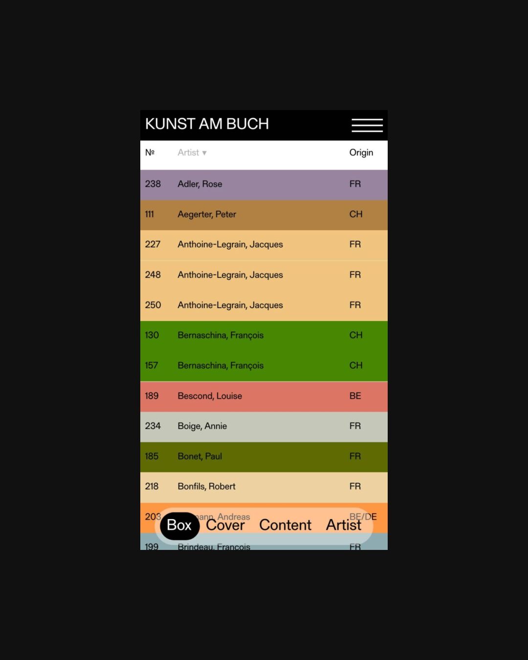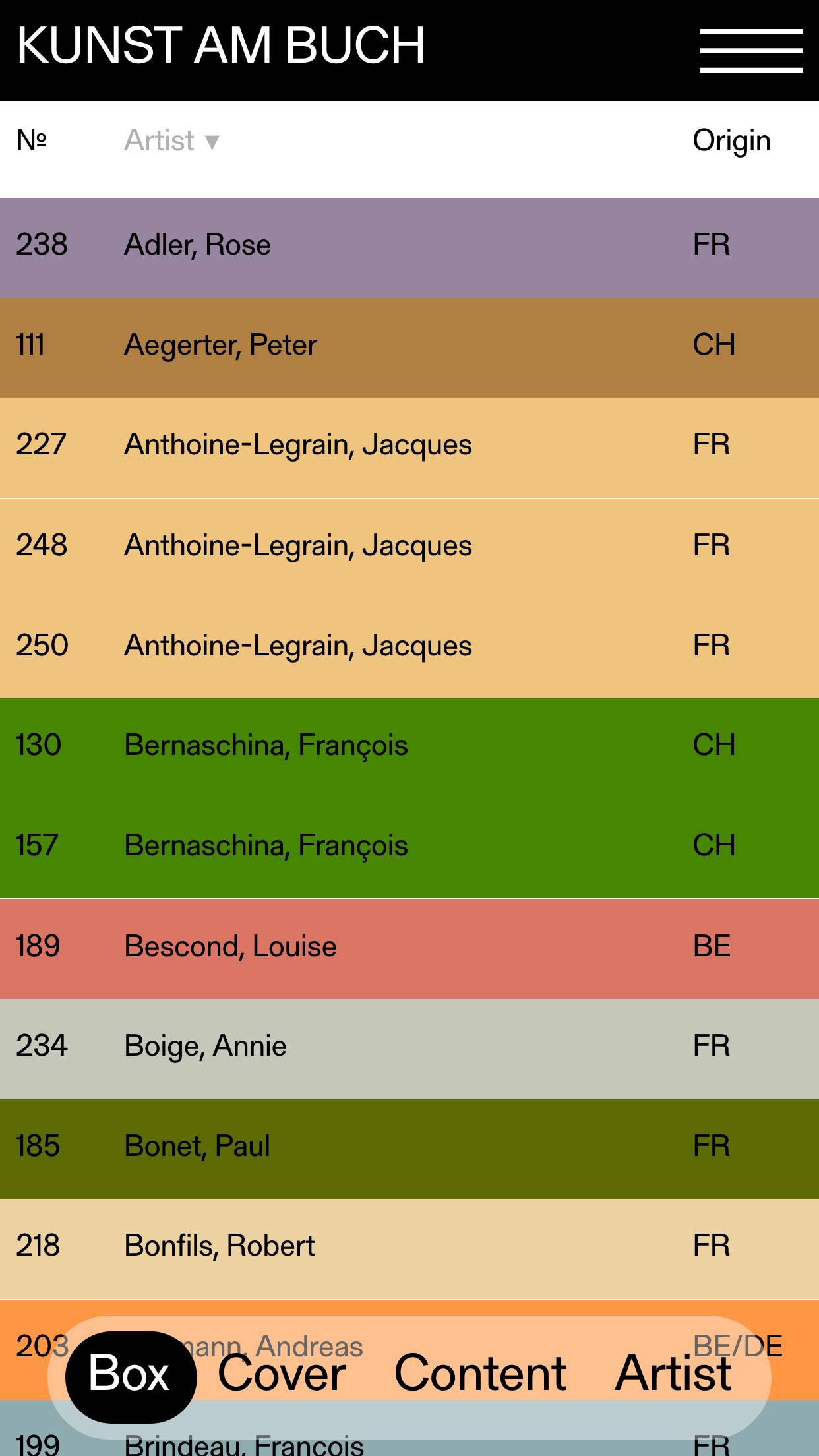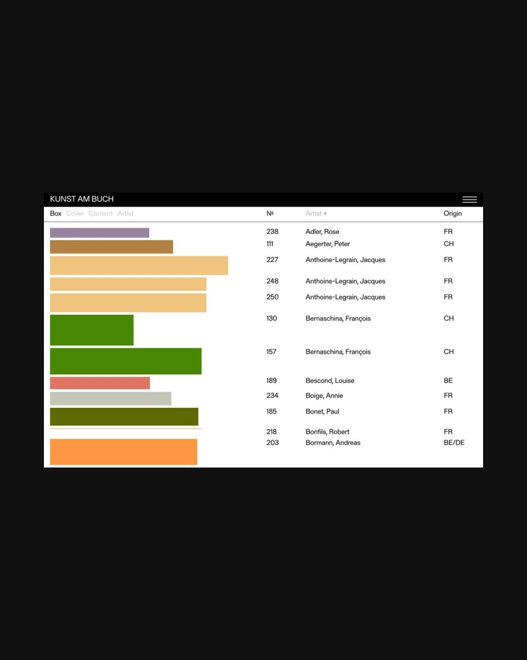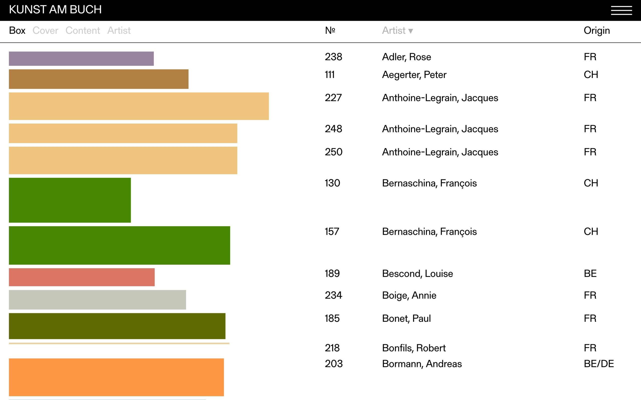 1234 kunstambuch.ch Archival, Big Typography, Brutalist, Colorful, Grid, Large Scale, List, Sans Serif Typeface, Table, Coffee, White, Switzerland. Design: BOB Design. Development: Archive Studio. (11-12-2025) ←Close