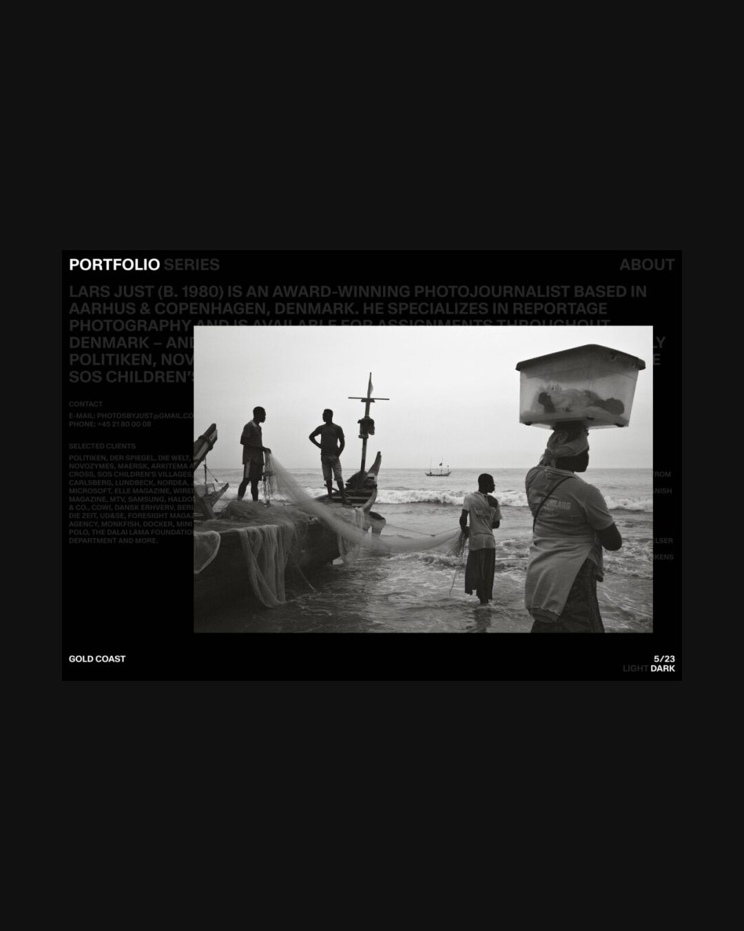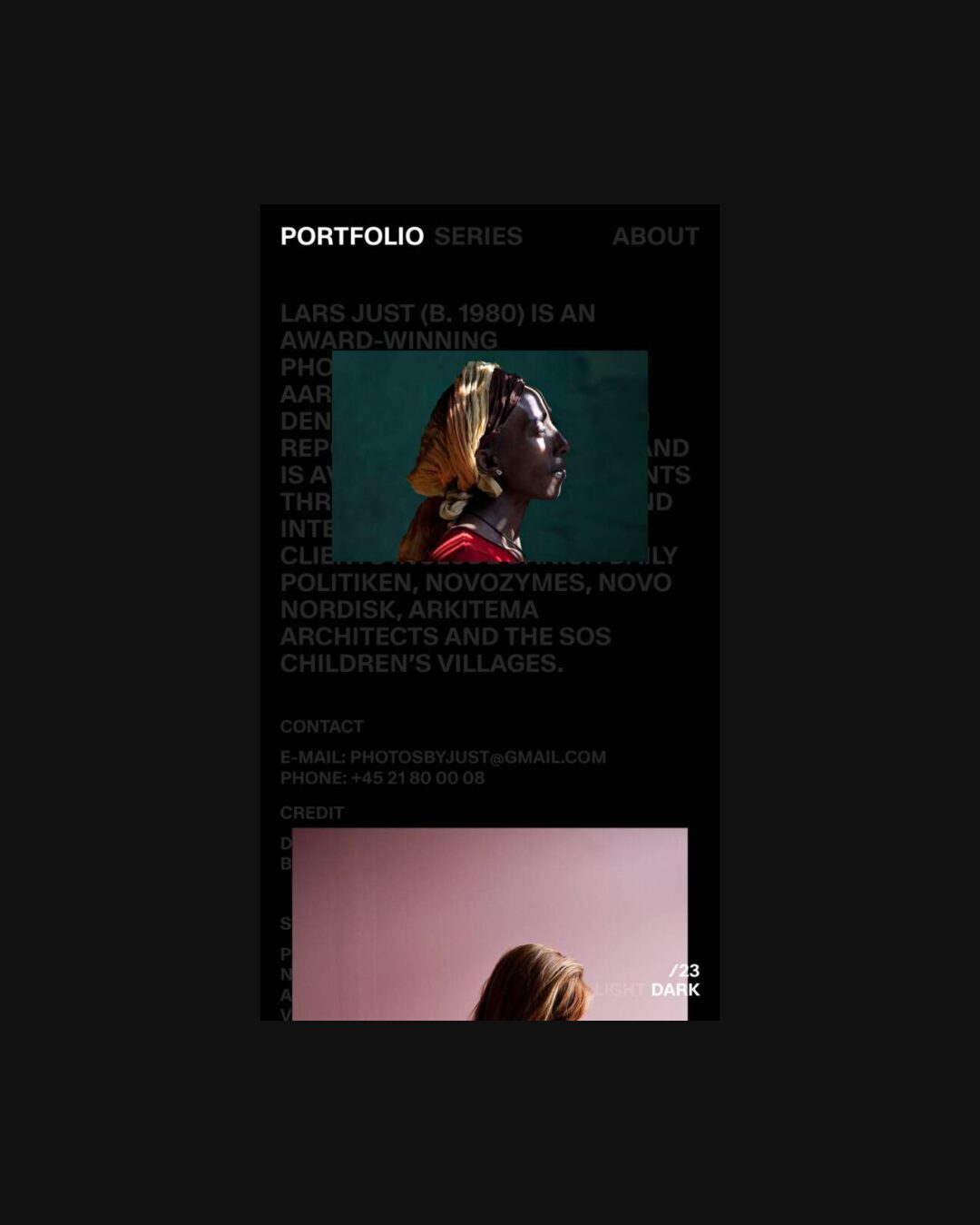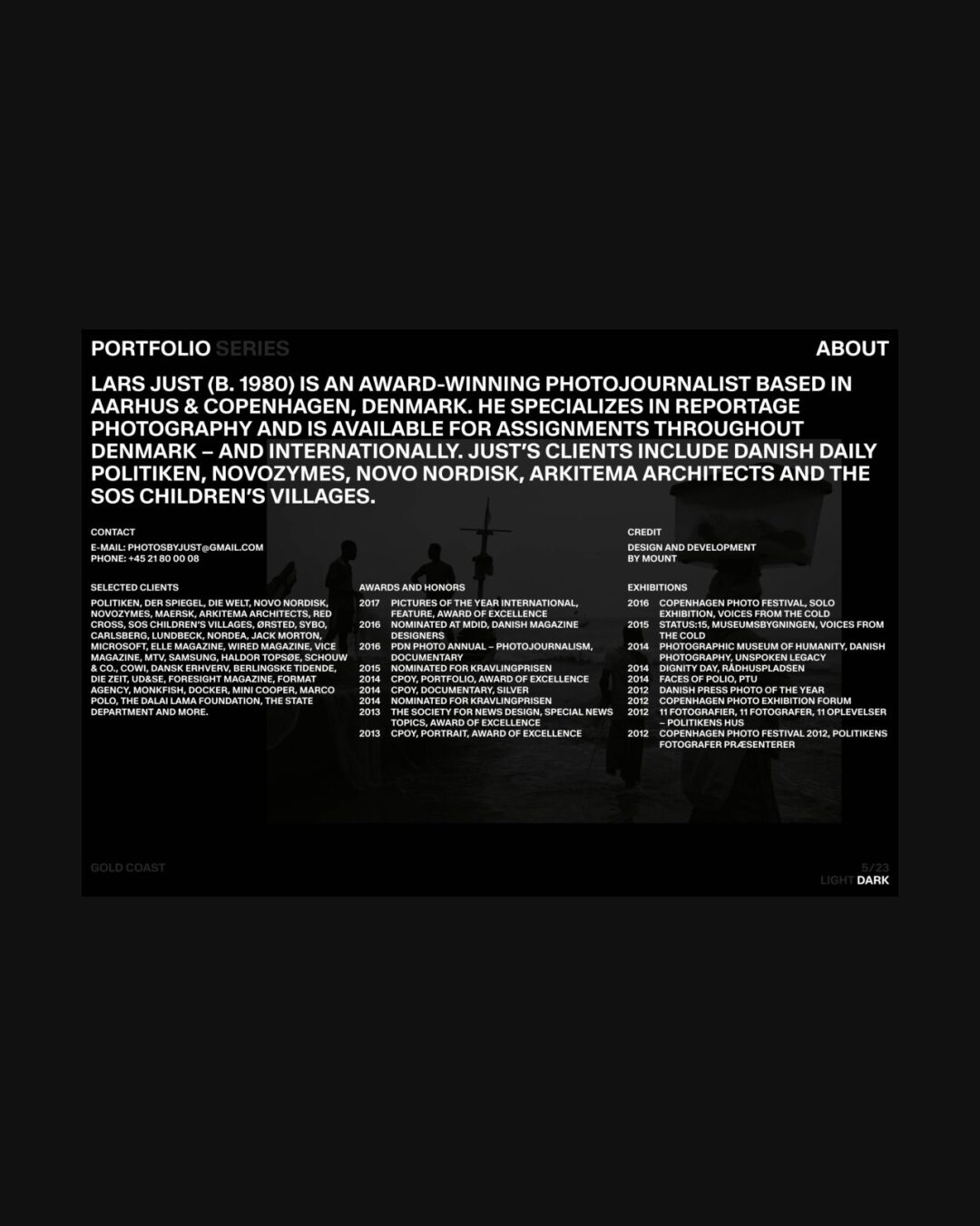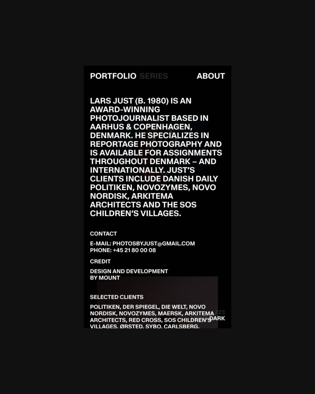 0712 larsjust.com Photography, Asymmetrical Grid, Big Typography, Brutalist, Creative Layout, Dark, Large Scale, Light, Overlay Containers, Typographic, Black, Denmark. Design: Mount. Development: Mount. (08-09-2023) ←Close