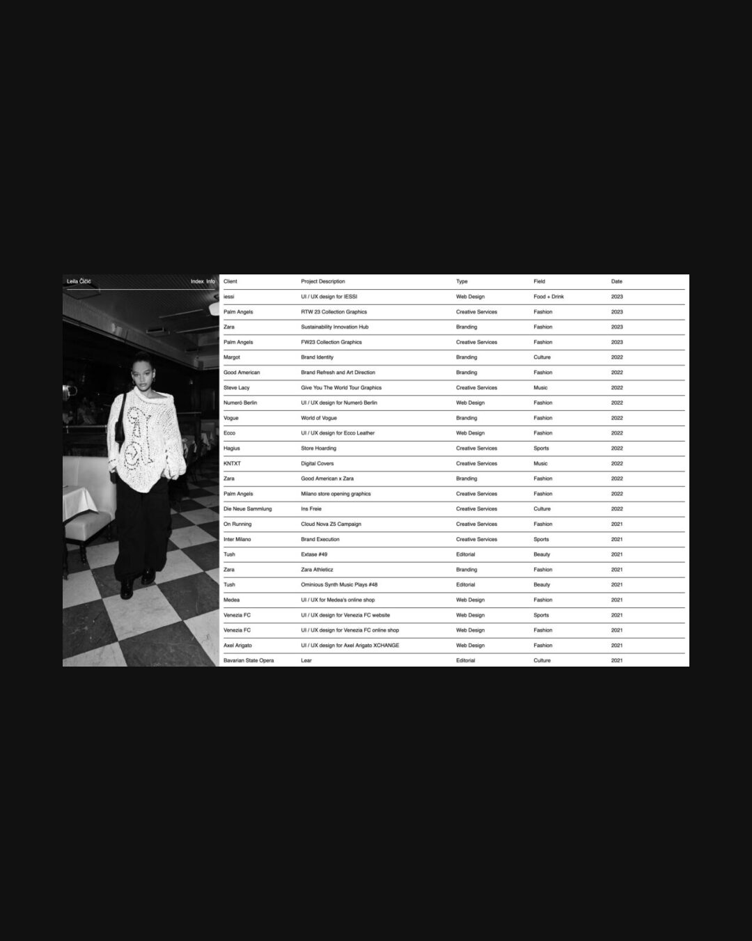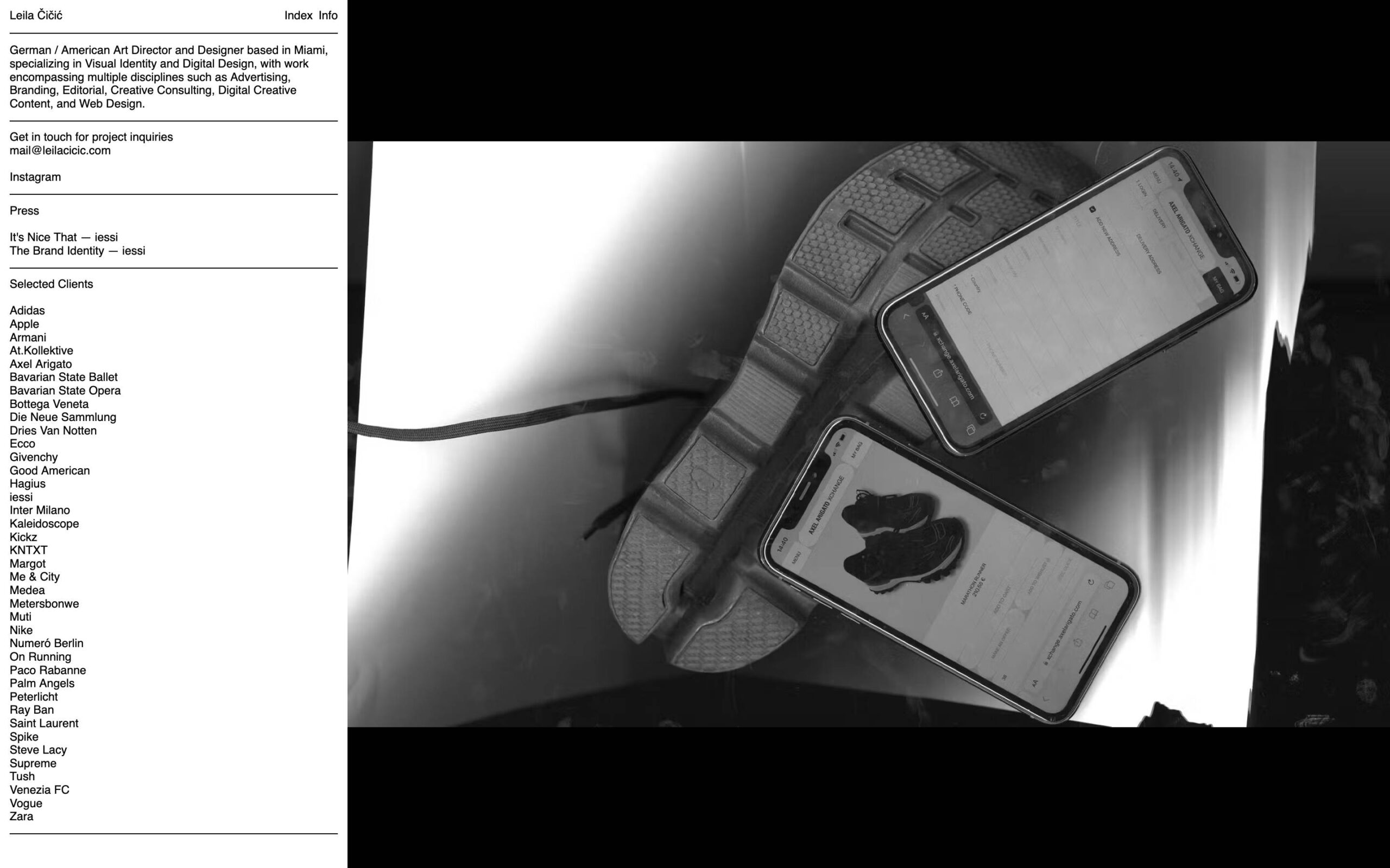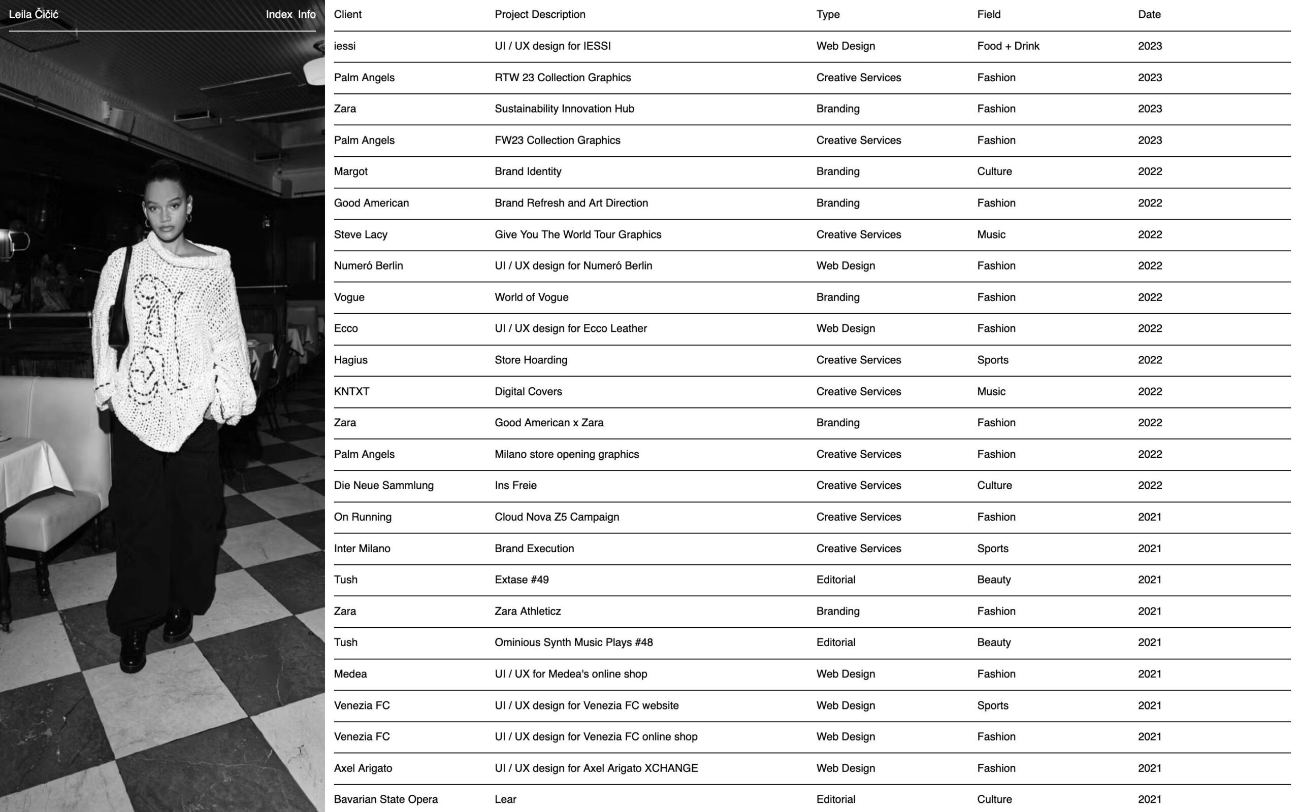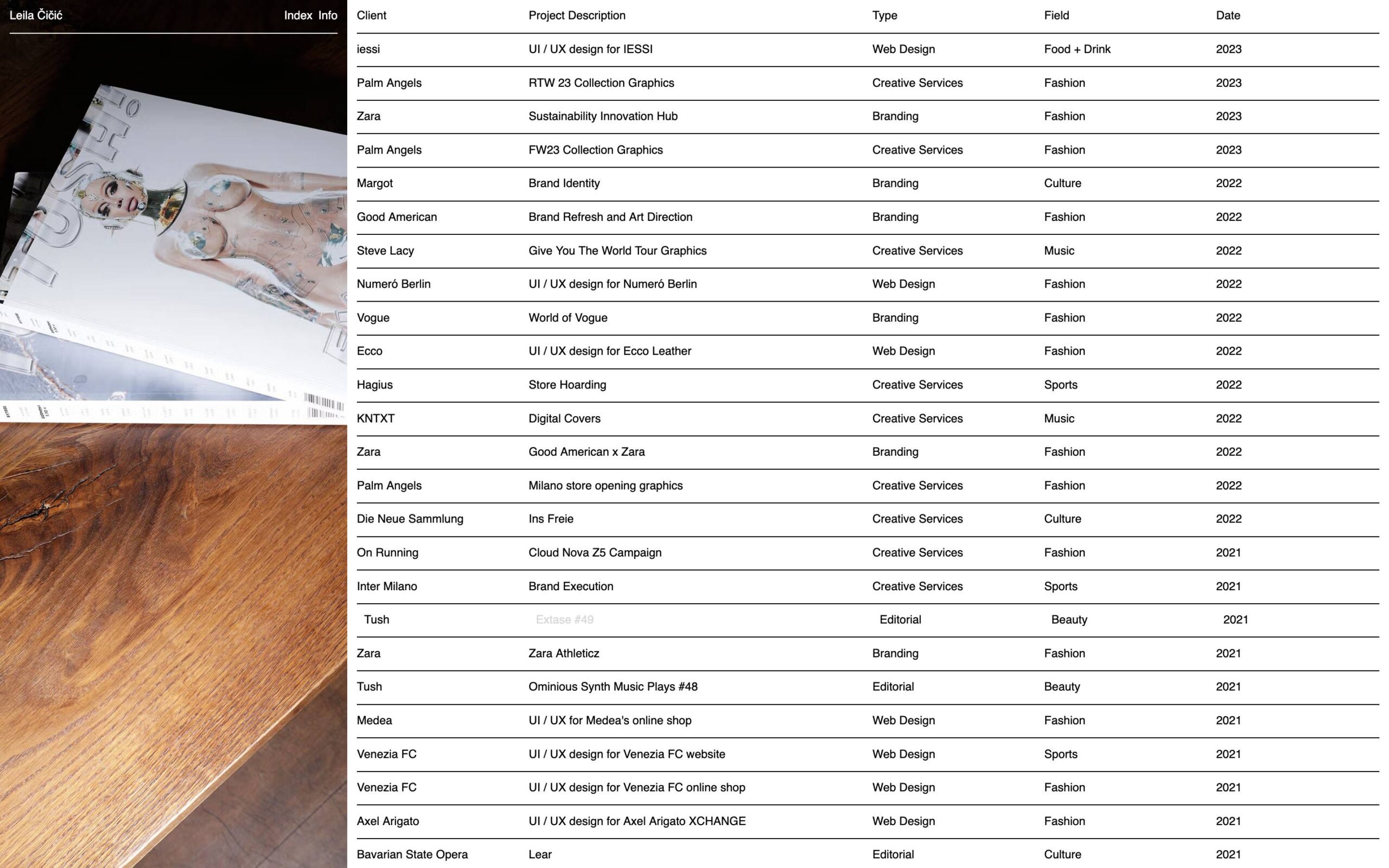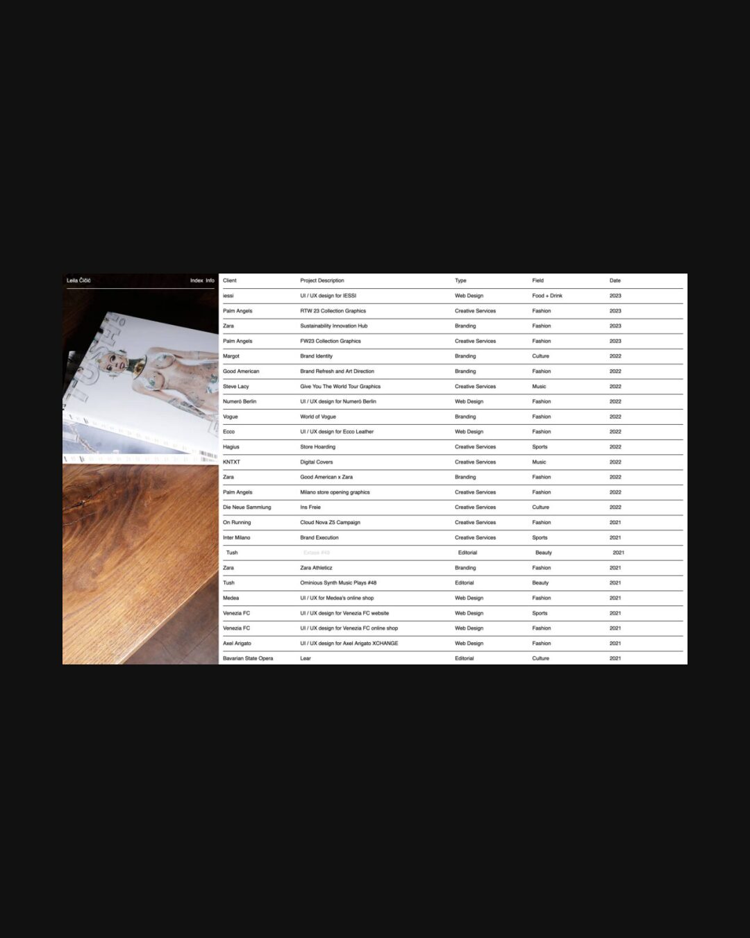 1307 leilacicic.com Design, 3D, Animations, Big Images, Clean, Grid, Large Scale, Light, Minimal, Sans Serif Typeface, Simple, Slider, Small Typography, Table, Video, Black, Gray, Peach, USA. Design: Leila Čičić. Development: Taw Vision. (14-11-2025) ←Close