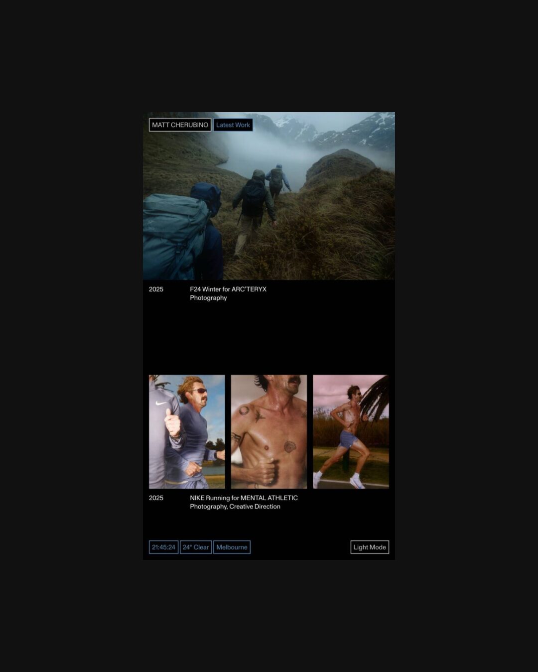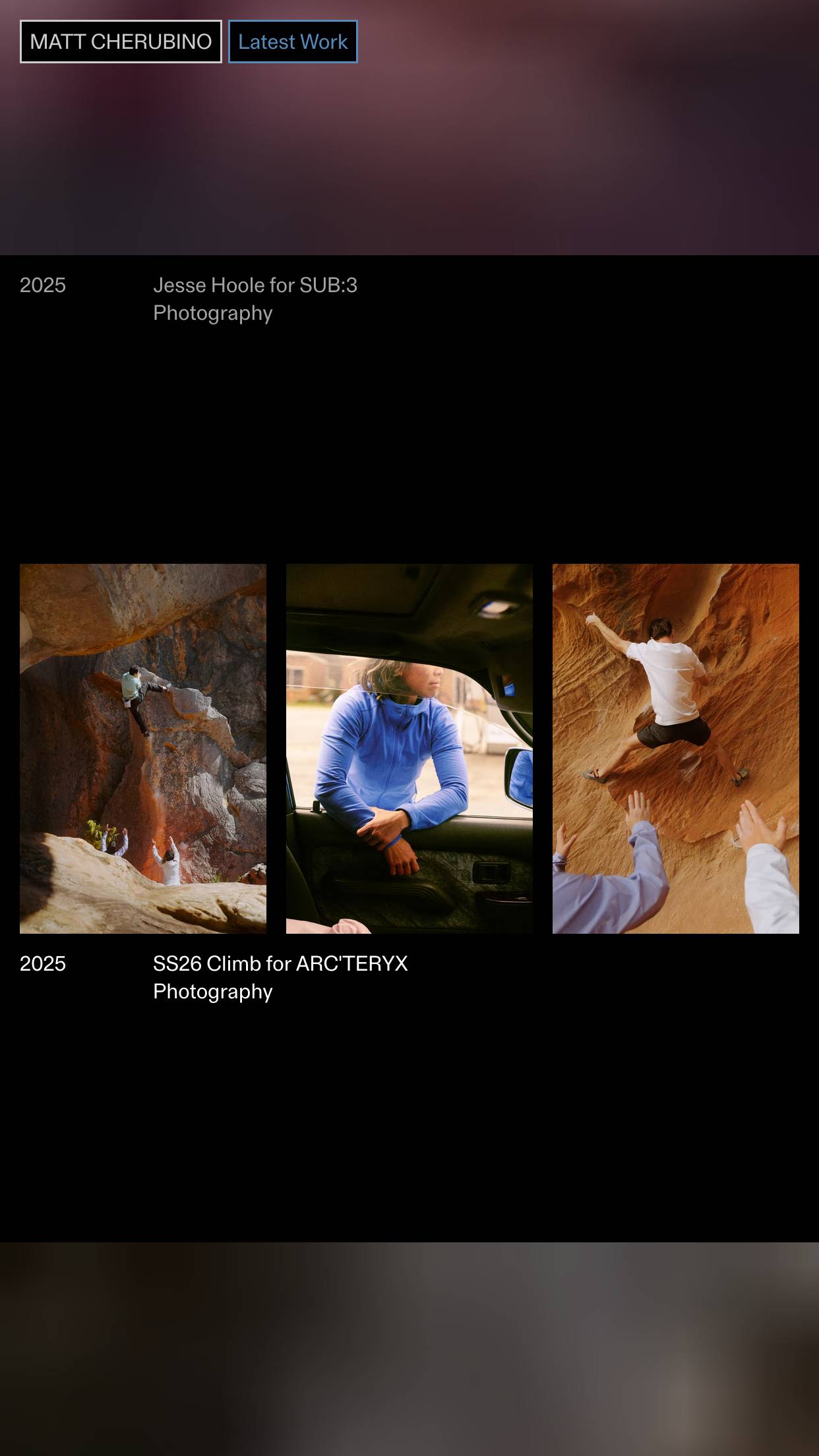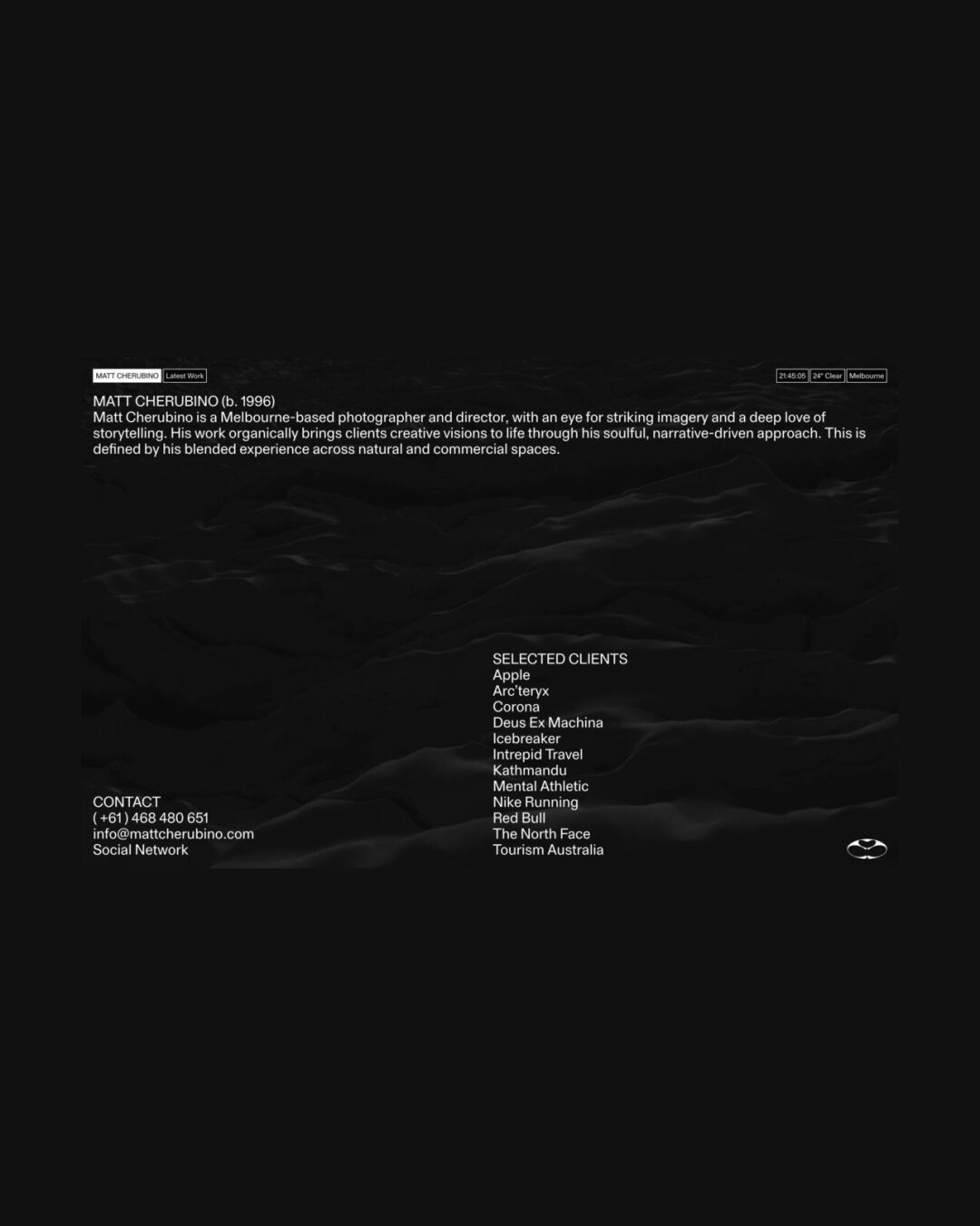 1346 mattcherubino.com Photography, Clean, Dark, Hover Events, Large Scale, Layered, Minimal, Motion, Overlay Containers, Sans Serif Typeface, Scroll Events, Shapes, Simple, Video, White Space, Black, Lavender, Australia. Design: Joshua Briones-Yap. Development: Laird Kruger. (08-01-2026) ←Close
