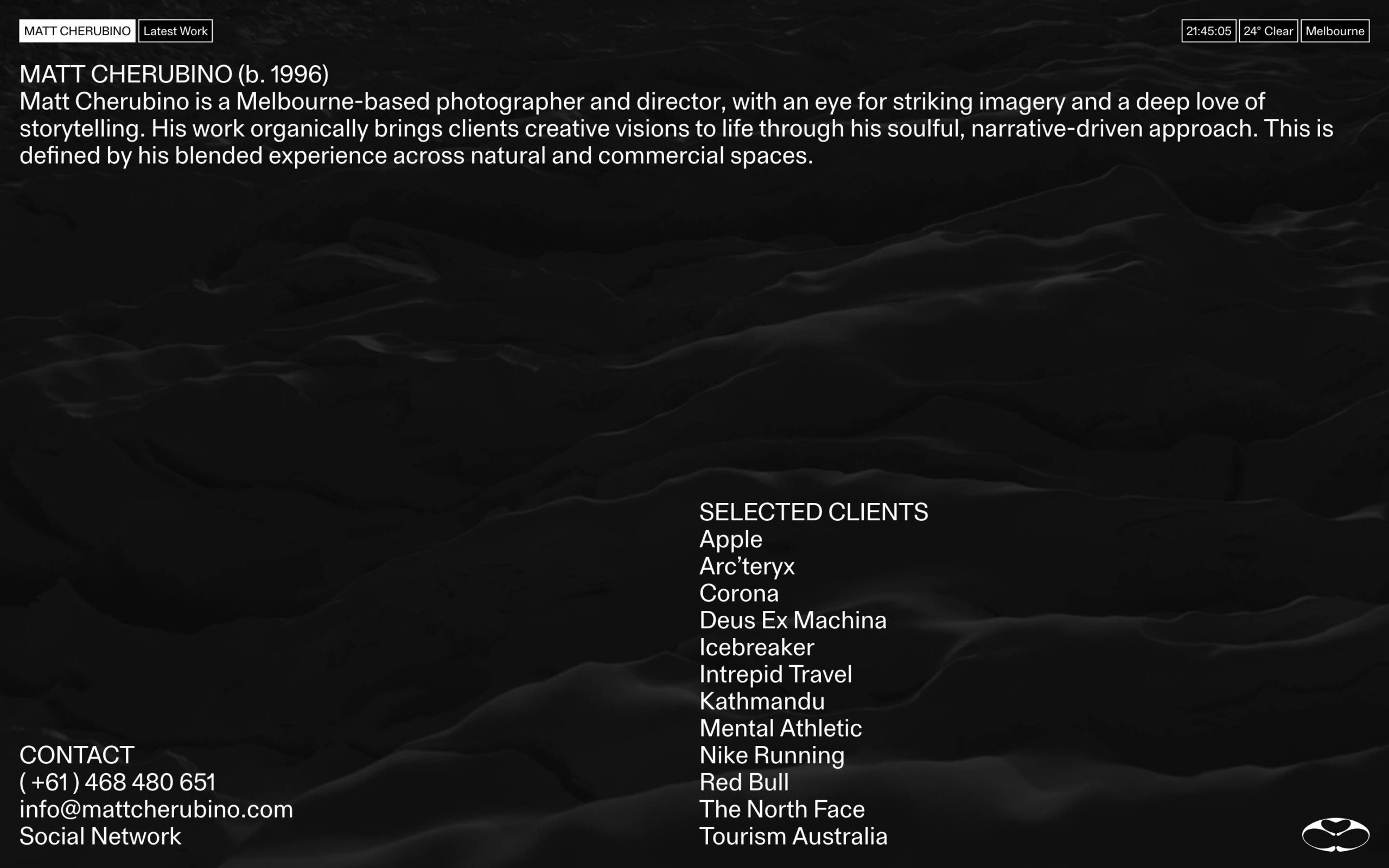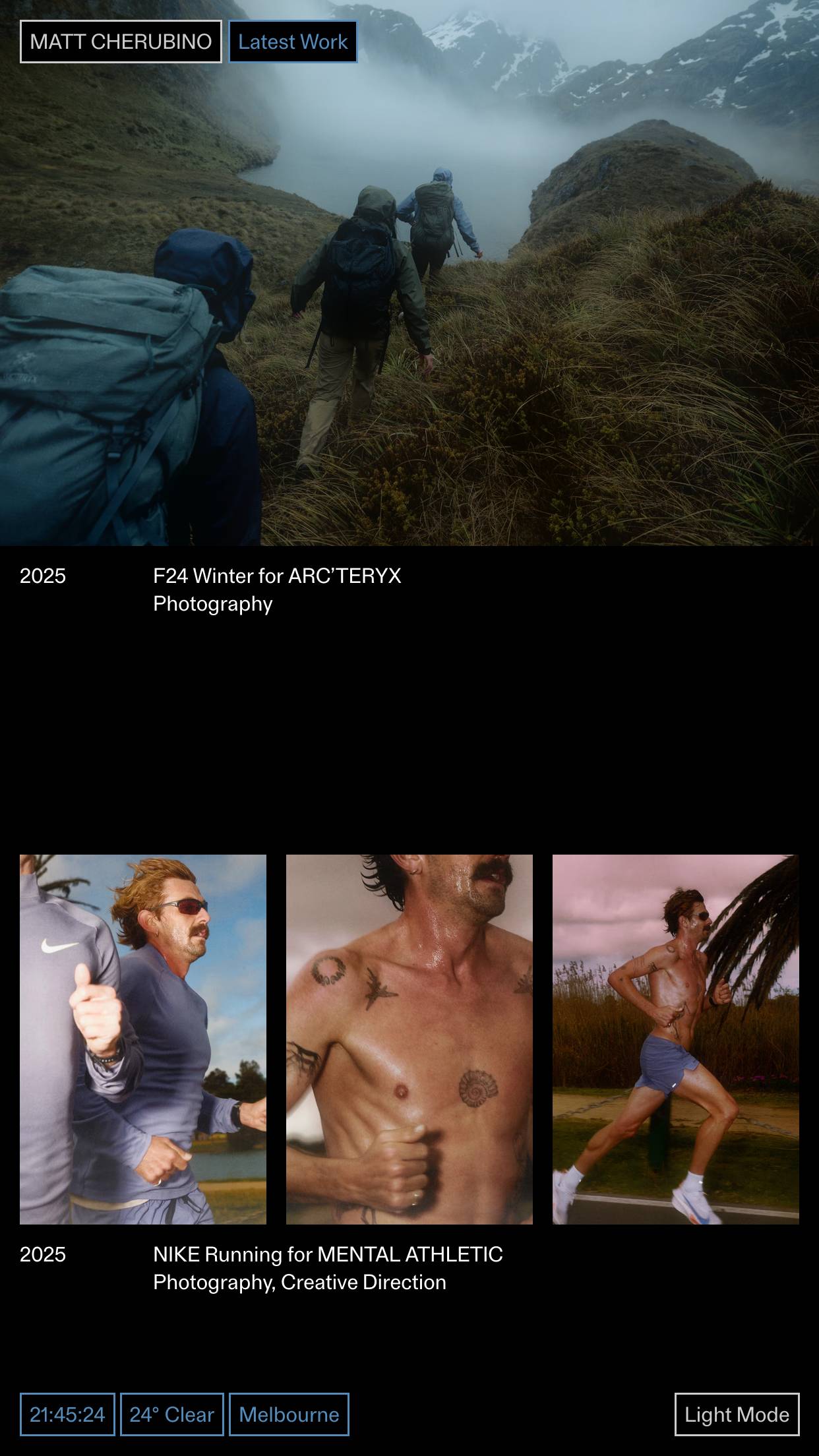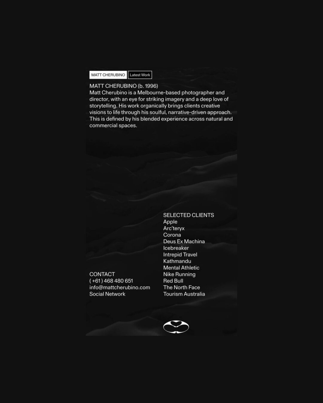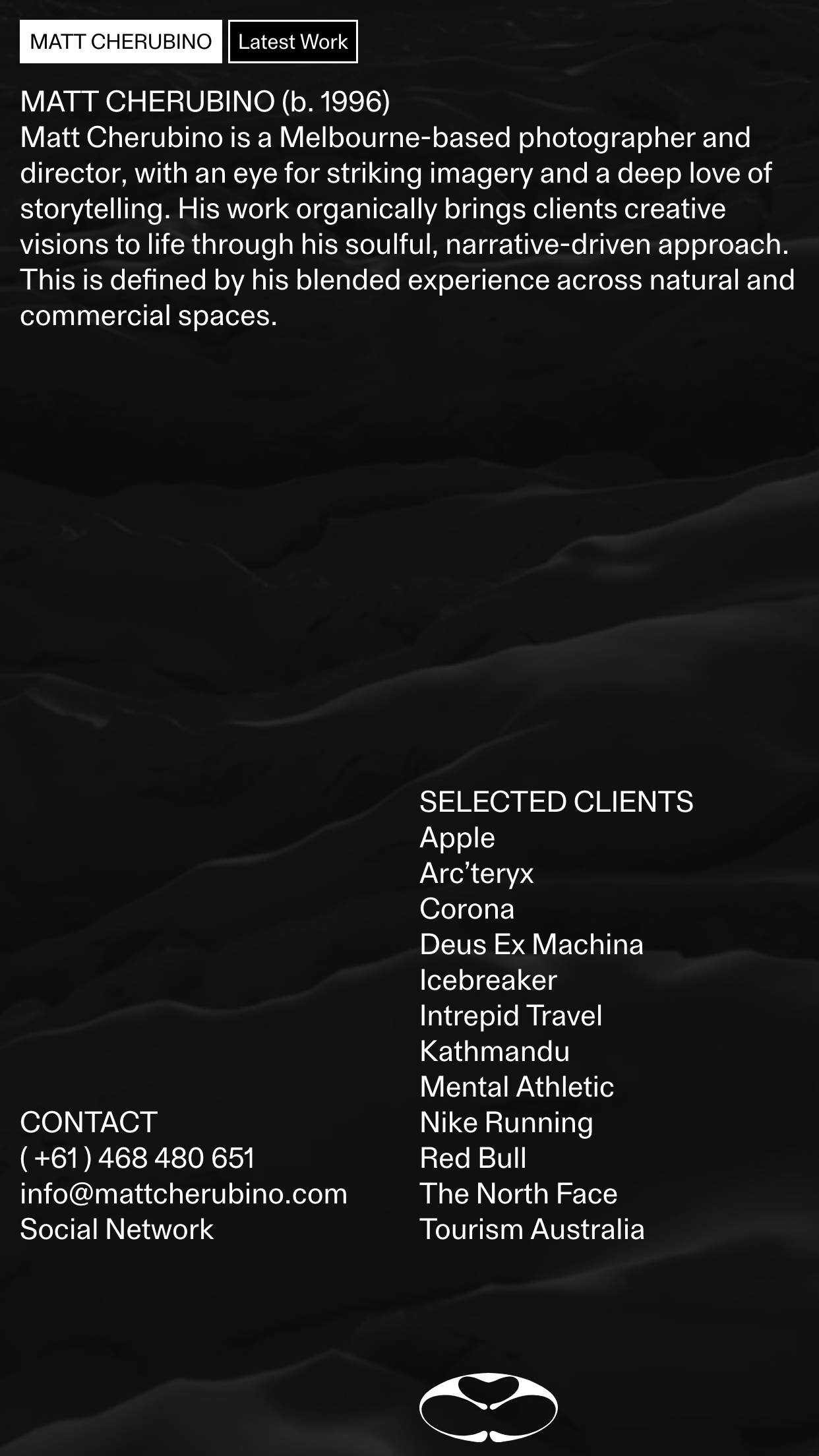 1346 mattcherubino.com Photography, Clean, Dark, Hover Events, Large Scale, Layered, Minimal, Motion, Overlay Containers, Sans Serif Typeface, Scroll Events, Shapes, Simple, Video, White Space, Black, Lavender, Australia. Design: Joshua Briones-Yap. Development: Laird Kruger. (08-01-2026) ←Close