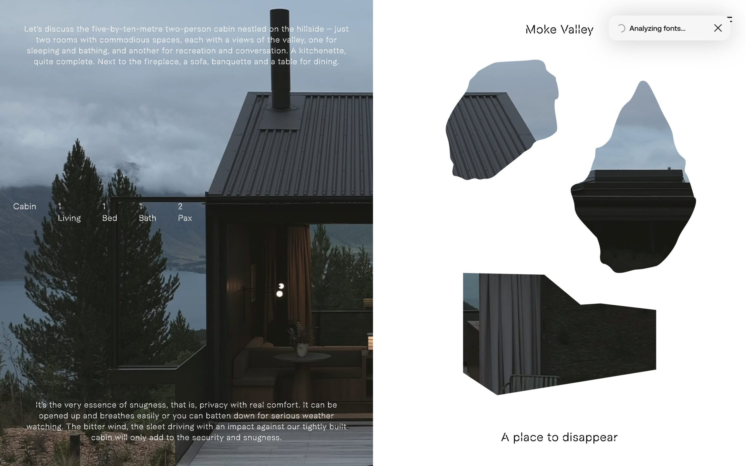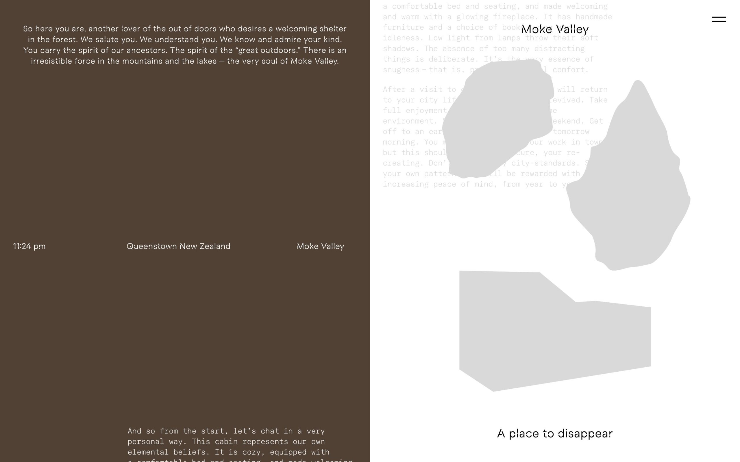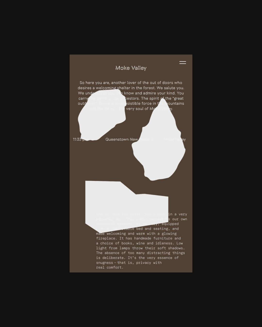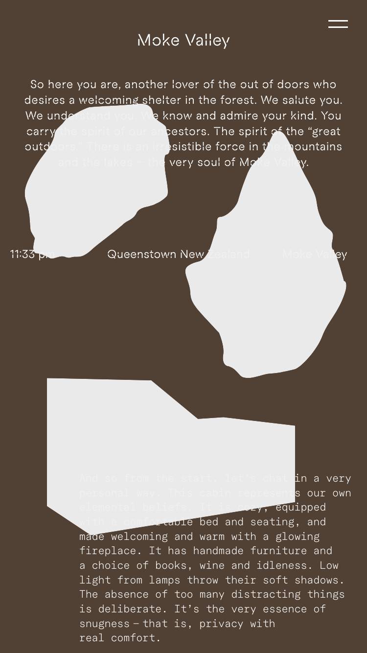 1310 mokevalley.co.nz Accommodation, Colorful, Editorial, Large Scale, Layered, Light, Mask, Mixed Style Typefaces, Motion, Overlay Containers, Shapes, Slider, Video, White Space, Coffee, White, New Zealand. Design: Sons & Co.. Development: Sons & Co.. (20-03-2026) ←Close